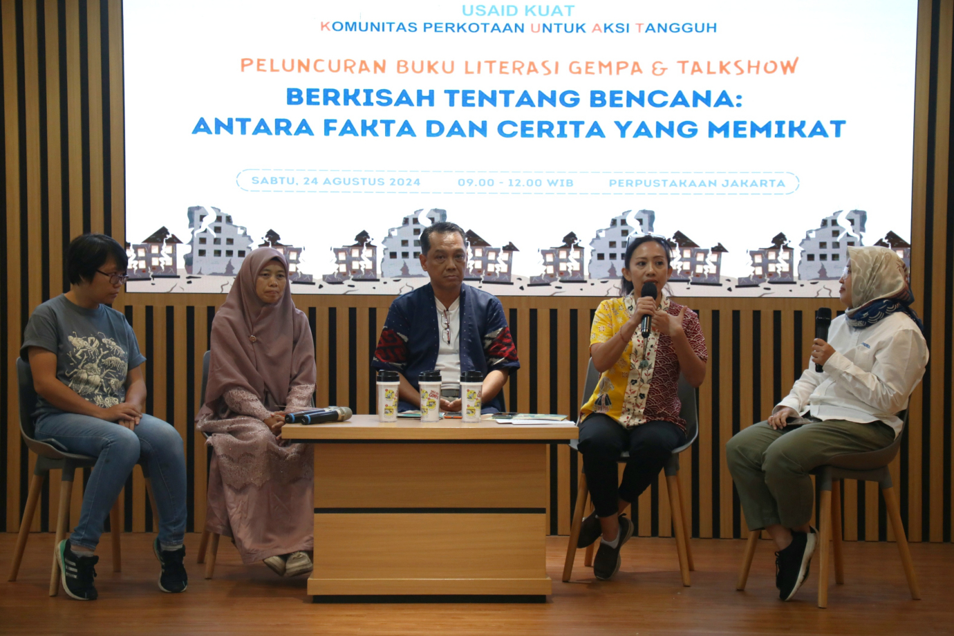 Badan Penanggulangan Bencana Daerah (BPBD) DKI Jakarta bersama The United States Agency for International Development – Komunitas Perkotaan Untuk Aksi Tangguh (USAID KUAT) meluncurkan tiga buku cerita bergambar tentang kebencanaan gempa bumi di Pusat Dokumentasi Sastra (PDS) HB Jasin, Taman Ismail Marzuki, Jakarta Pusat, Sabtu (24/8). Ketiga buku ini, nantinya akan disebar ke berbagai sekolah dan ruang publik terpadu ramah anak (RPTRA) di seluruh Provinsi DKI Jakarta serta dapat diunduh secara gratis pada situs bit.ly/pustakagempa.