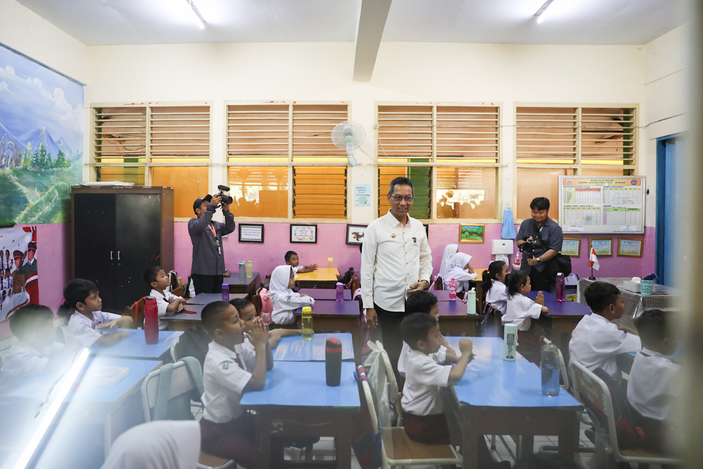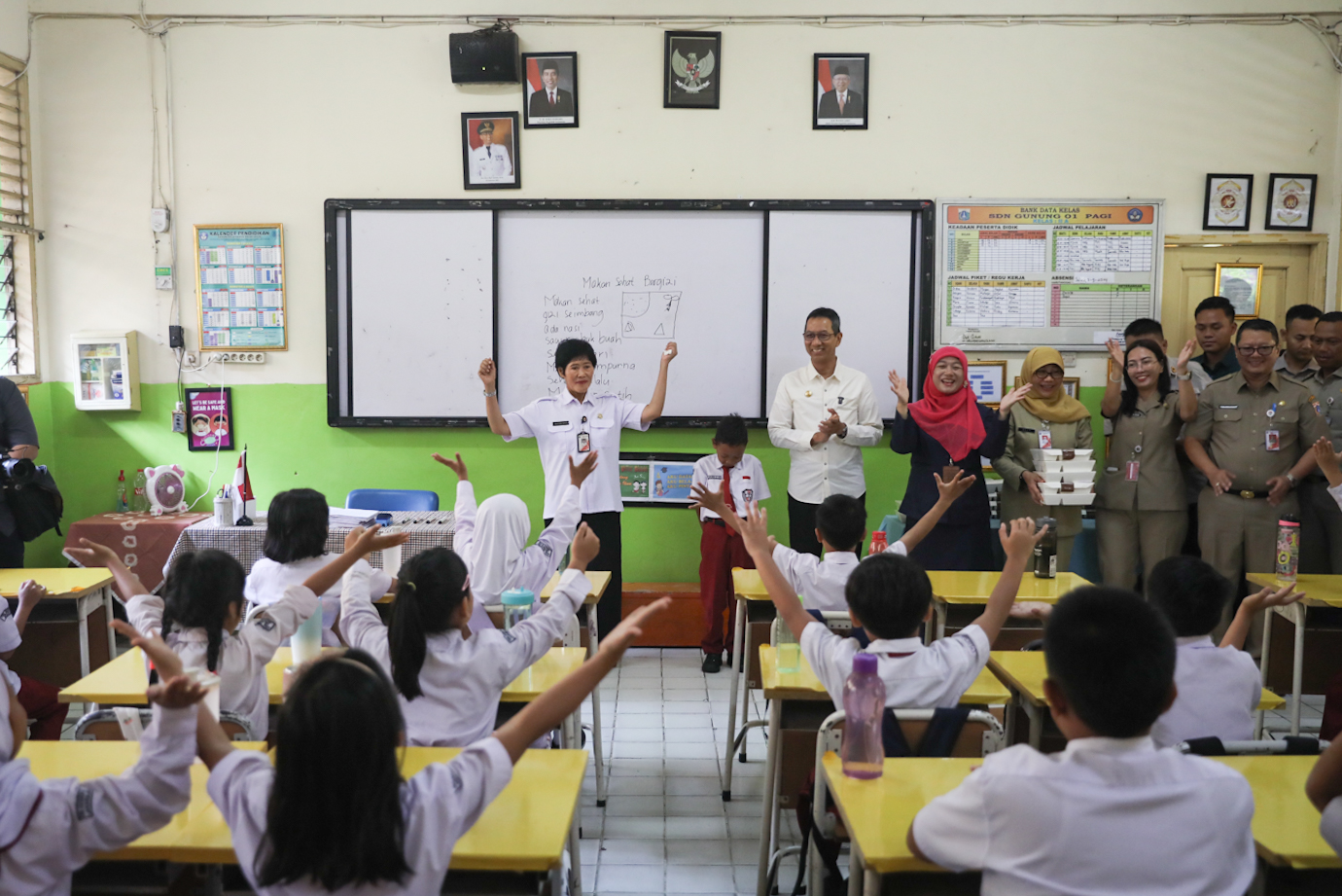 Penjabat (Pj) Gubernur DKI Jakarta, Heru Budi Hartono meninjau pemberian makanan bergizi gratis kepada siswa di SDN Gunung 01, Kebayoran Baru, Jakarta Selatan, Selasa (3/9). Pemprov DKI Jakarta bekerja sama dengan BUMD Ancol Taman Impian memberikan paket makanan bergizi gratis dengan menu nasi goreng, ayam, telur, timun dan jeruk.