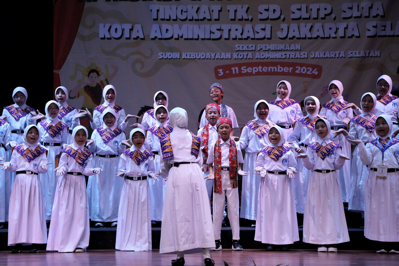 Suku Dinas Kebudayaan Jakarta Selatan menggelar Apresiasi dan Kompetisi Seni bagi Pelajar TK, SD, SLTP, SLTA Tingkat Kota Jakarta Selatan Tahun 2024 di Gedung Pusat Pelatihan Seni Budaya (PPSB), Jalan Asem Baris, Kebon Baru, Tebet, Jakarta Selatan, Selasa (3/9). Kegiatan ini diharapkan dapat mengembangkan potensi anak dan juga melestarikan budaya betawi.
