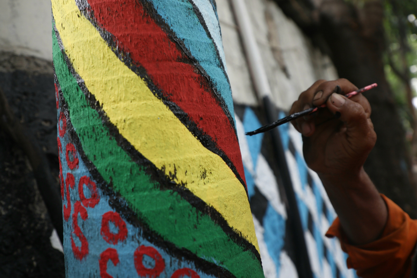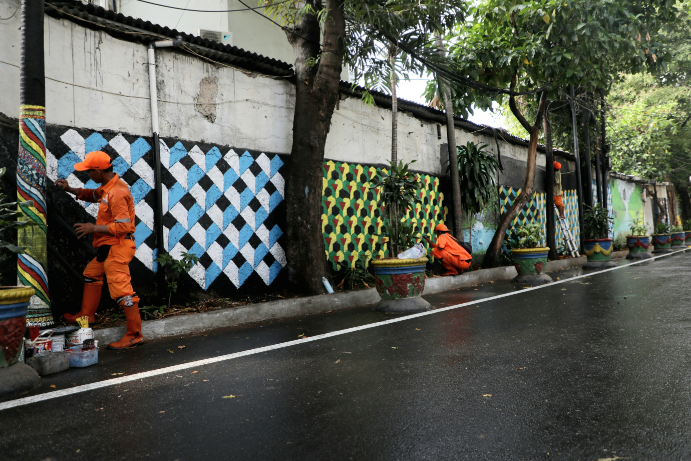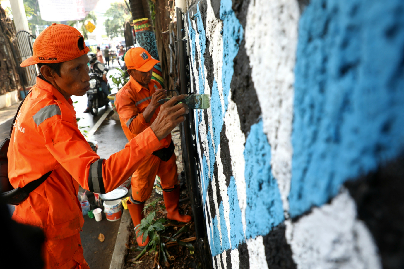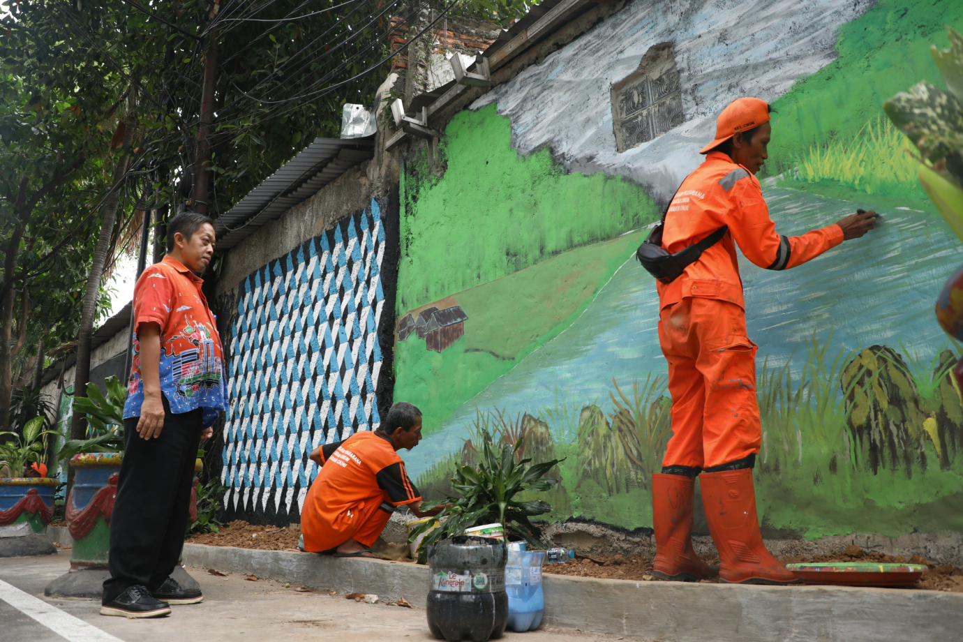 Petugas Penanganan Prasarana dan Sarana Umum (PPSU) Kelurahan Cikini mempercantik lingkungan dengan mural di Jalan Cikini VIII, Cikini, Menteng, Jakarta Pusat, Kamis (5/9). Pembuatan mural sepanjang 200 meter ini merupakan bagian dari penataan kawasan unggulan triwulan ke III di Kelurahan Cikini.