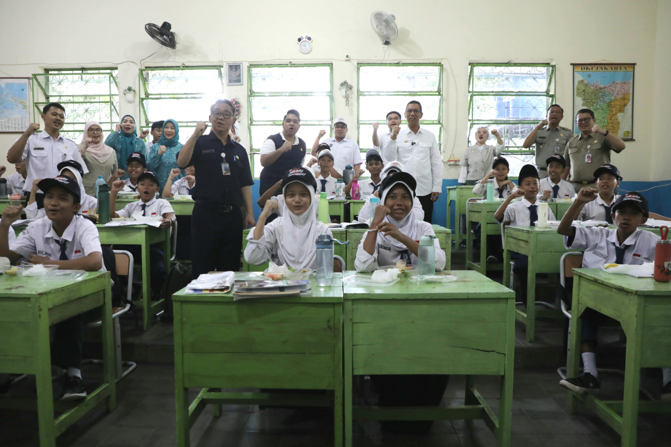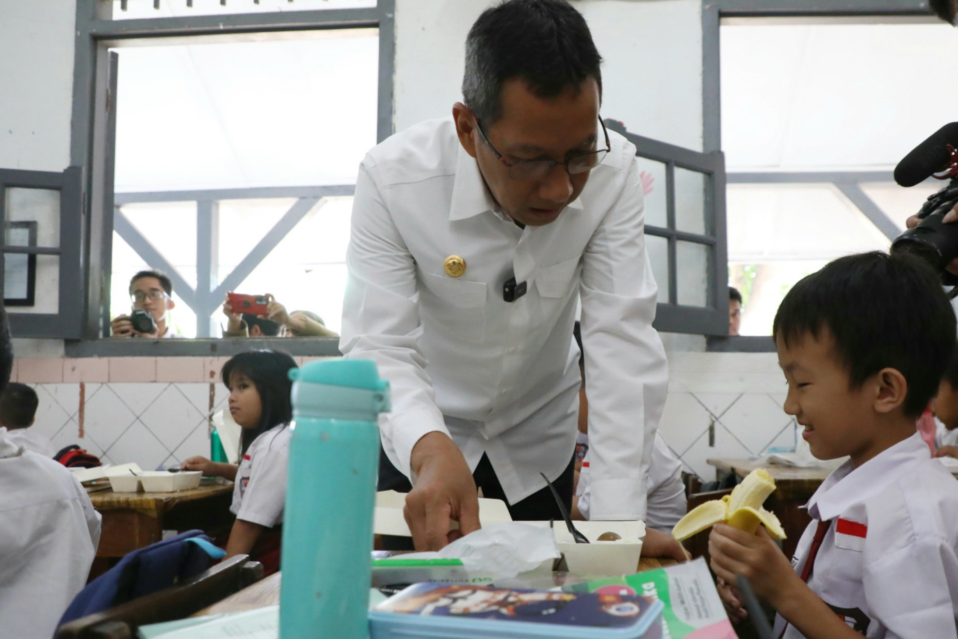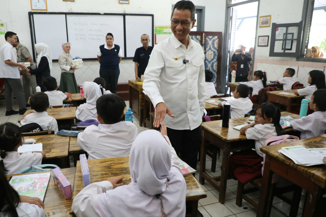 Penjabat ( Pj) Gubernur DKI Jakarta, Heru Budi Hartono didampingi Pj Ketua TP PKK DKI Jakarta, Mirdiyanti Heru meninjau kegiatan uji coba Makan Bergizi Gratis (MBG) di SDN 01 Manggarai dan SMPN 3 Jakarta, Kelurahan Manggarai, Kecamatan Tebet, Jakarta Selatan, Senin (9/9). Dalam kegiatan ini disediakan 1.500 pack makanan hasil kerjasama dengan Badan Usaha Milik Daerah (BUMD) PT Bank DKI dan Perumda Pasar Jaya.