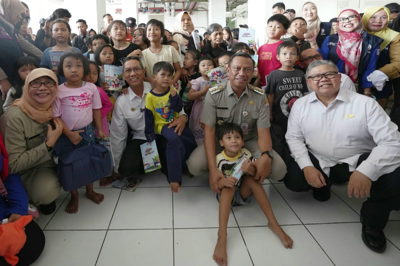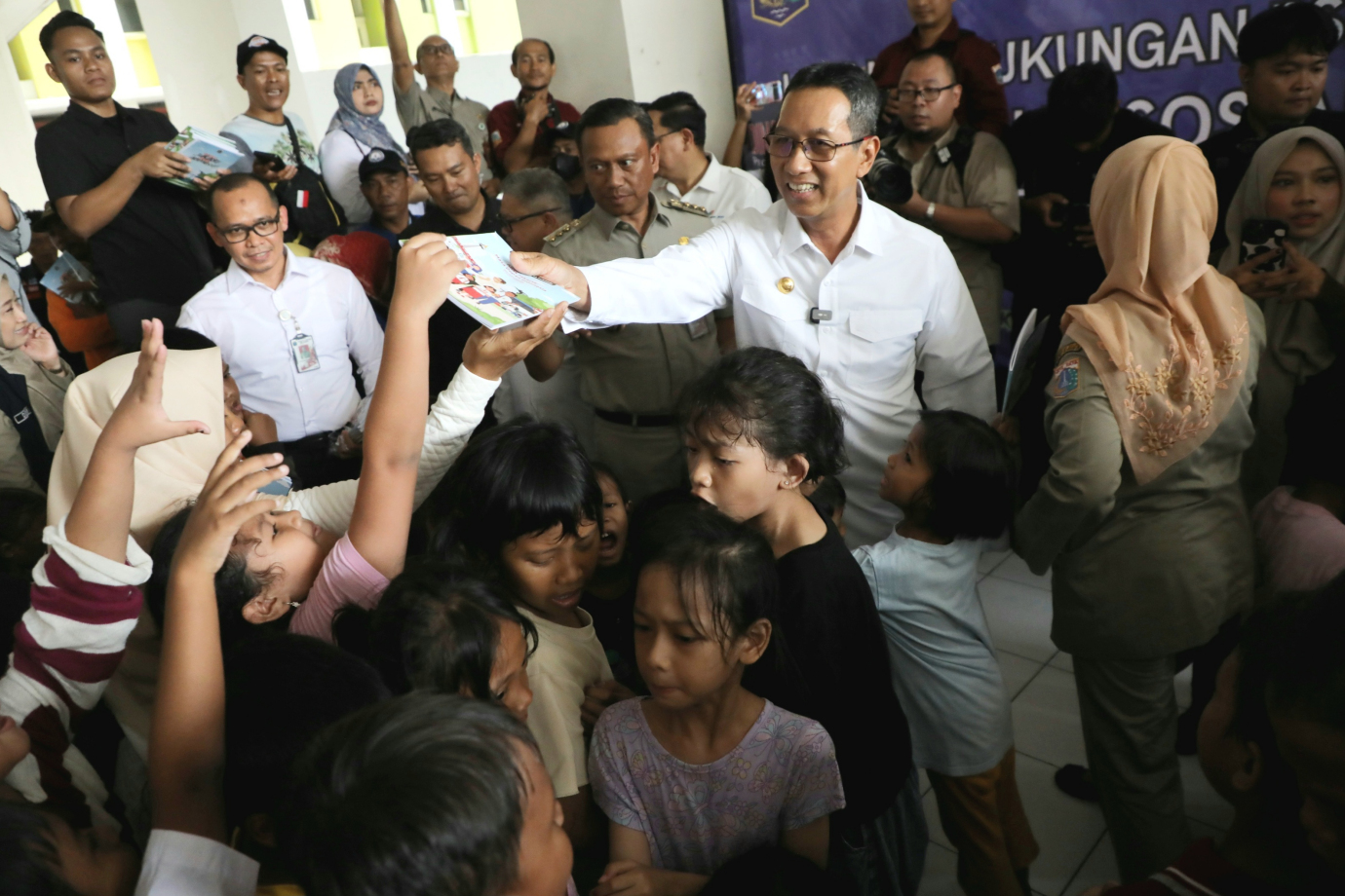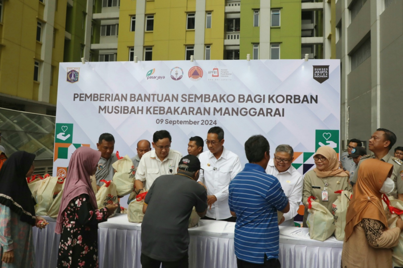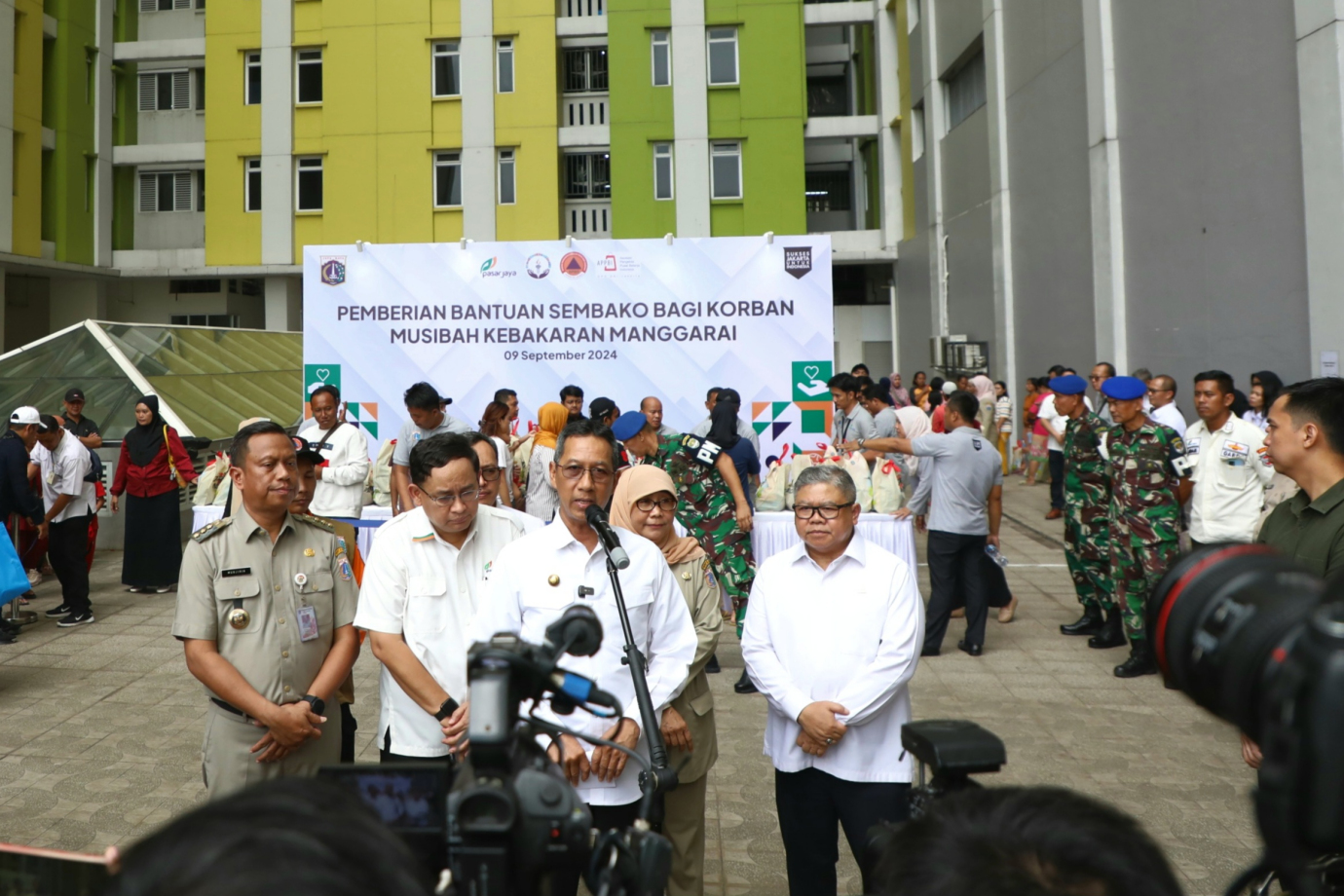Sebanyak 450 paket sembako diberikan kepada warga penyintas kebakaran Manggarai di Rumah Susun Pasar Rumput, Setiabudi, Jakarta Selatan, Senin (9/9). Penyerahan bantuan ini diberikan langsung oleh Pj Gubernur DKI Jakarta, Heru Budi Hartono berkat sinergi antara Pemprov DKI Jakarta dan Asosiasi Pengelola Pusat Belanja Indonesia (APPBI).