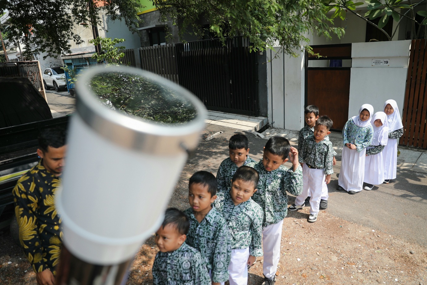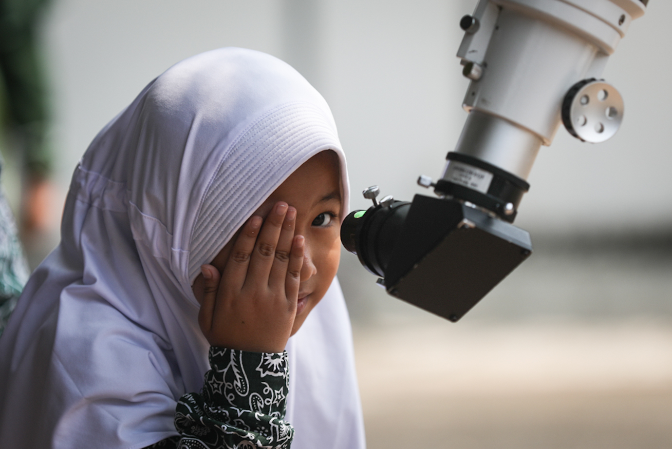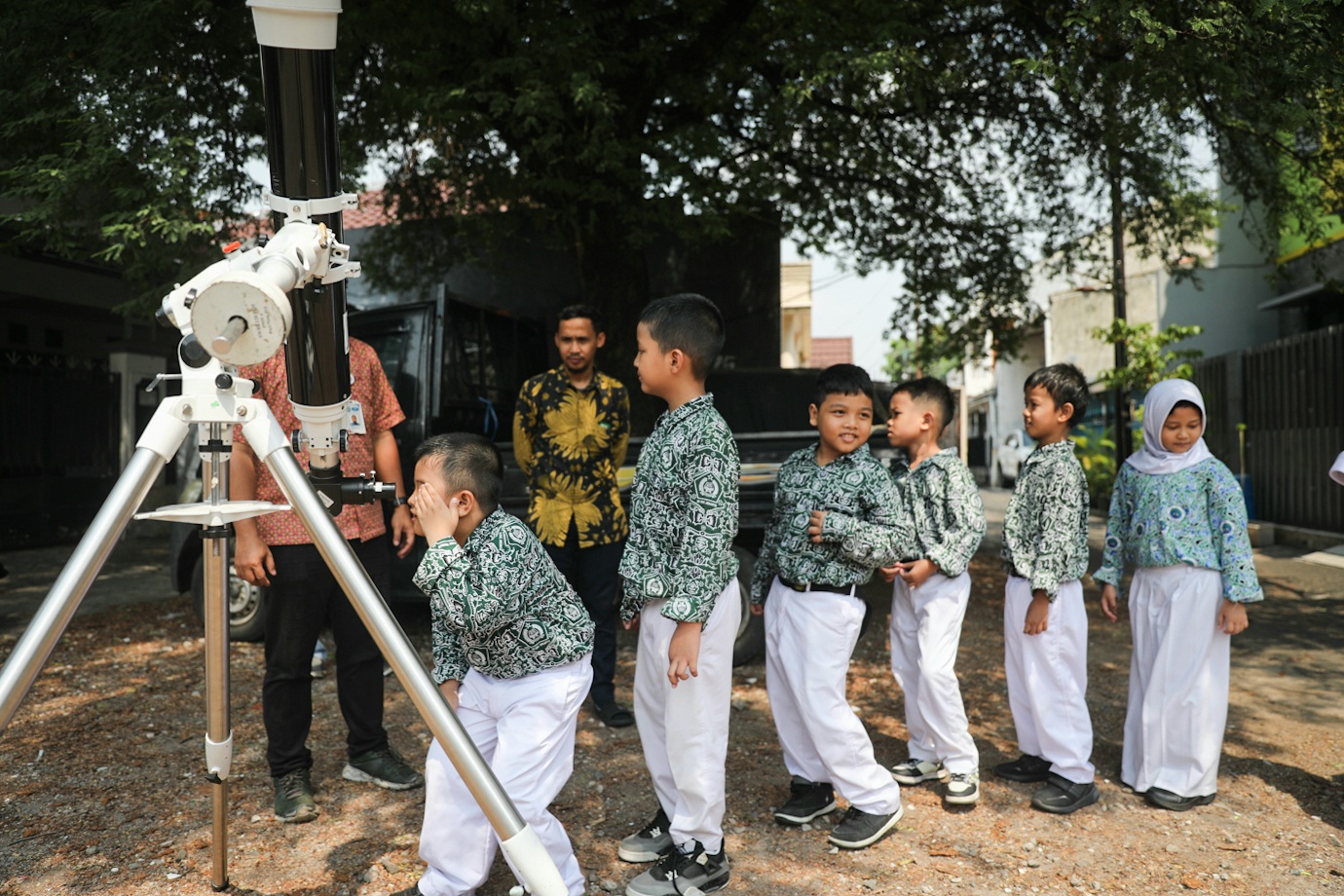 Planetarium dan Observatorium Jakarta menggelar kegiatan Astronomi Goes to School kepada para siswa tingkat sekolah dasar di Madrasah Ibtidaiyah (MI) Dakwah Islamiyah, Jatinegara, Jakarta Timur, Kamis (12/9). Kegiatan ini dilakukan untuk memberikan pengetahuan tambahan mengenai astronomi serta memberikan pengalaman kepada para siswa untuk melihat langsung bentuk matahari melalui teropong optik.