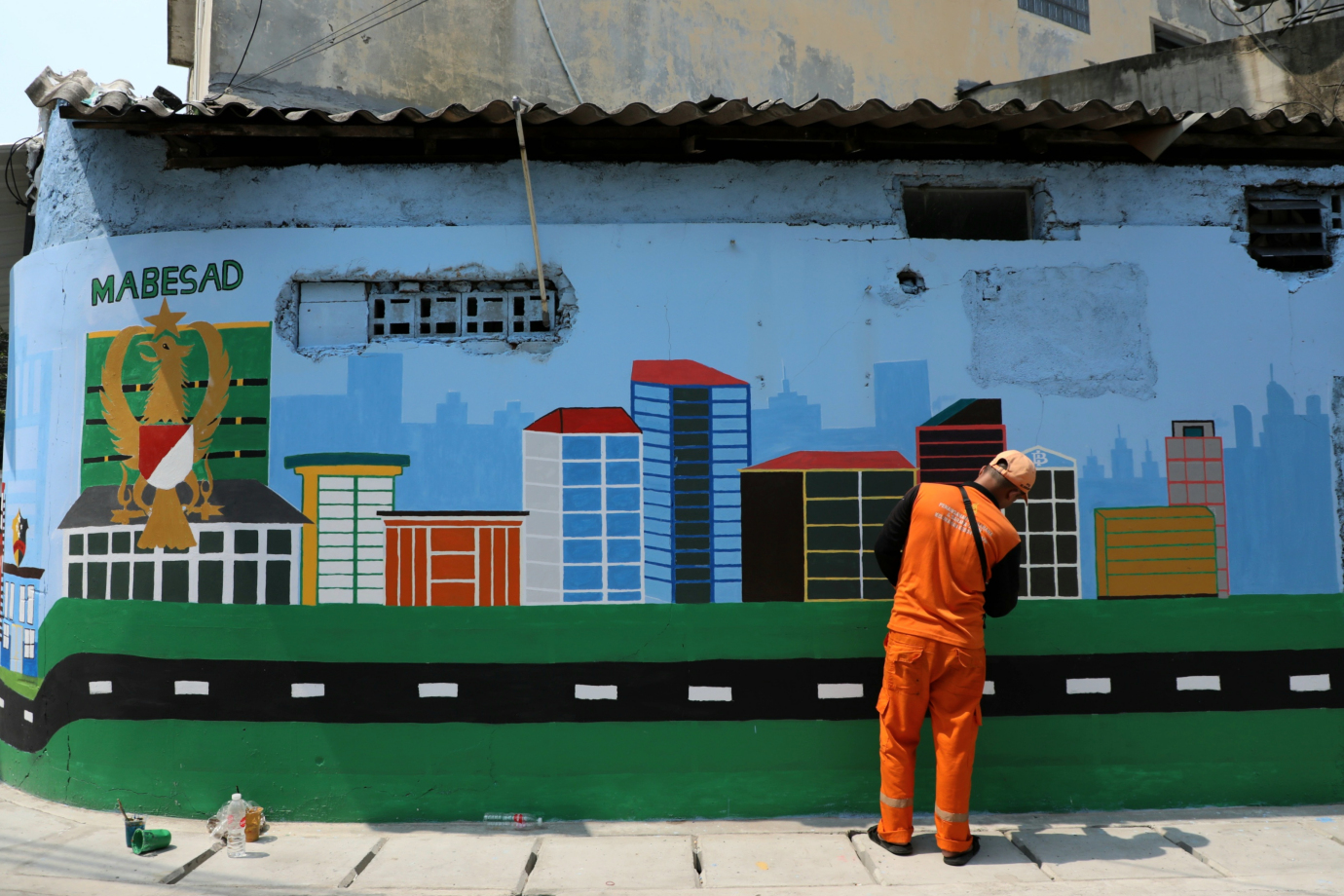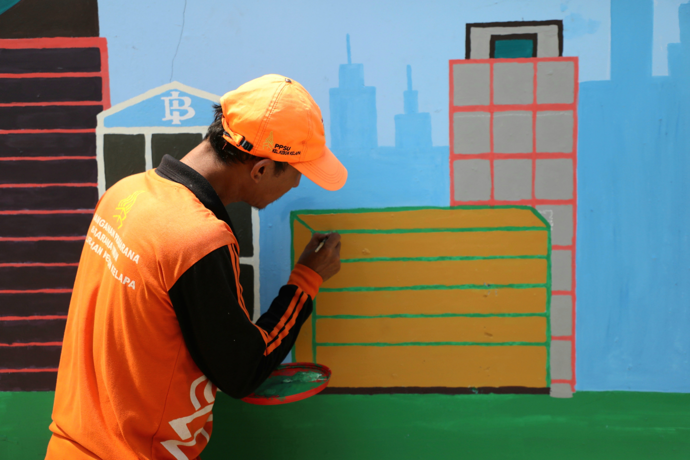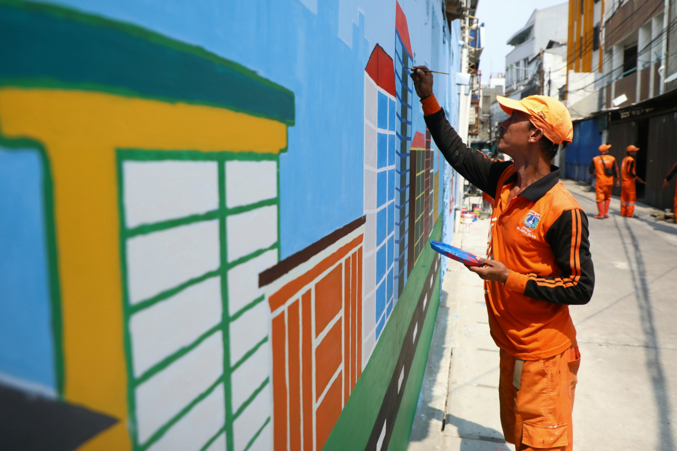 Petugas Penanganan Prasarana dan Sarana Umum (PPSU) Kelurahan Kebon Kelapa mempercantik lingkungan dengan mural di Jalan Batu Tulis I, Gambir, Jakarta Pusat, Selasa (17/9). Pembuatan mural sepanjang 200 meter, bertemakan perkotaan ini merupakan bagian dari penataan kawasan unggulan triwulan ketiga tahun 2024 Kelurahan Kebon Kelapa.