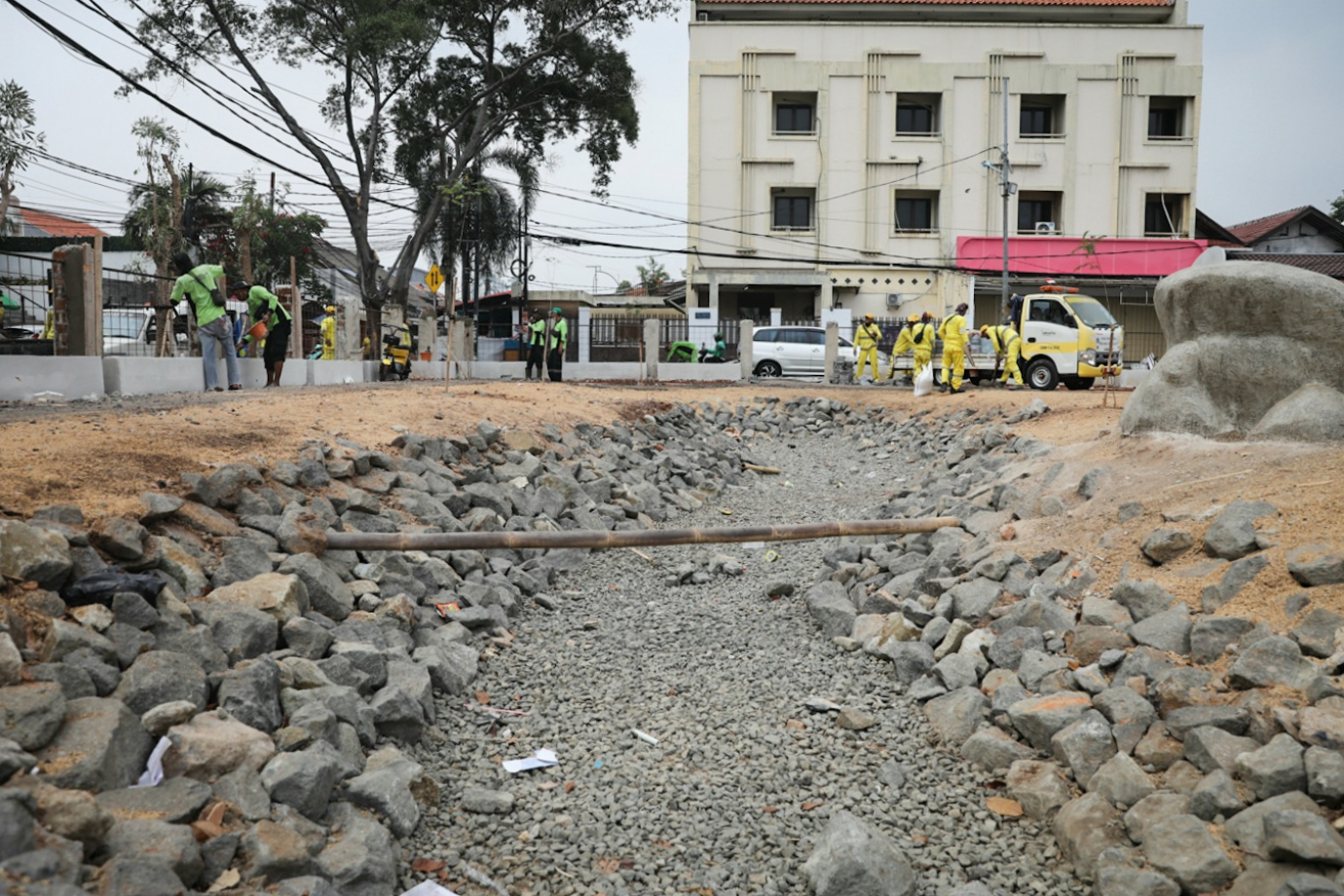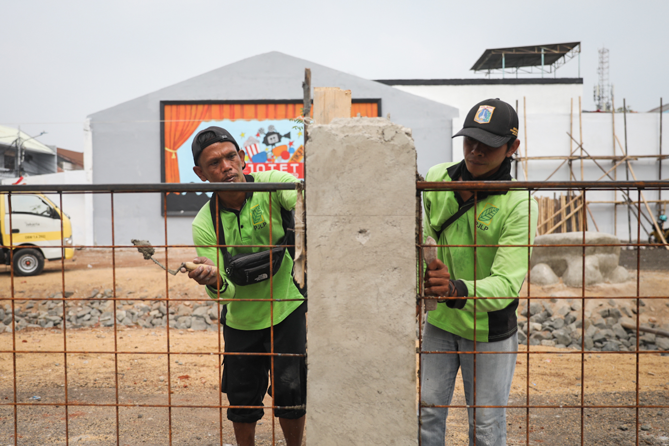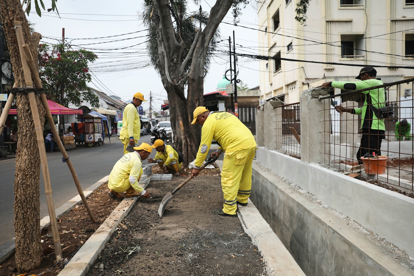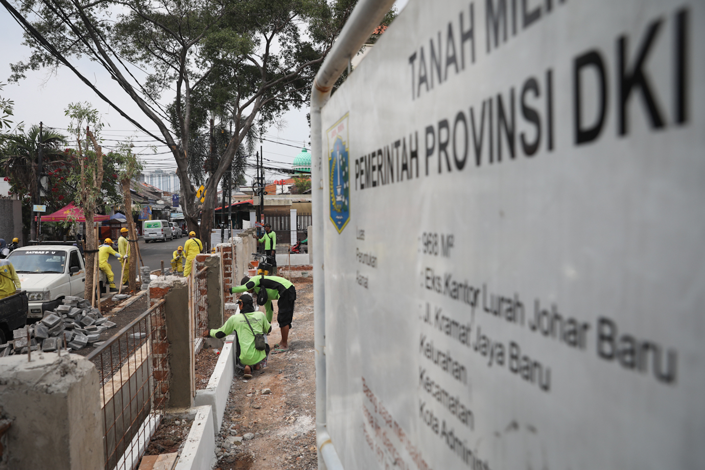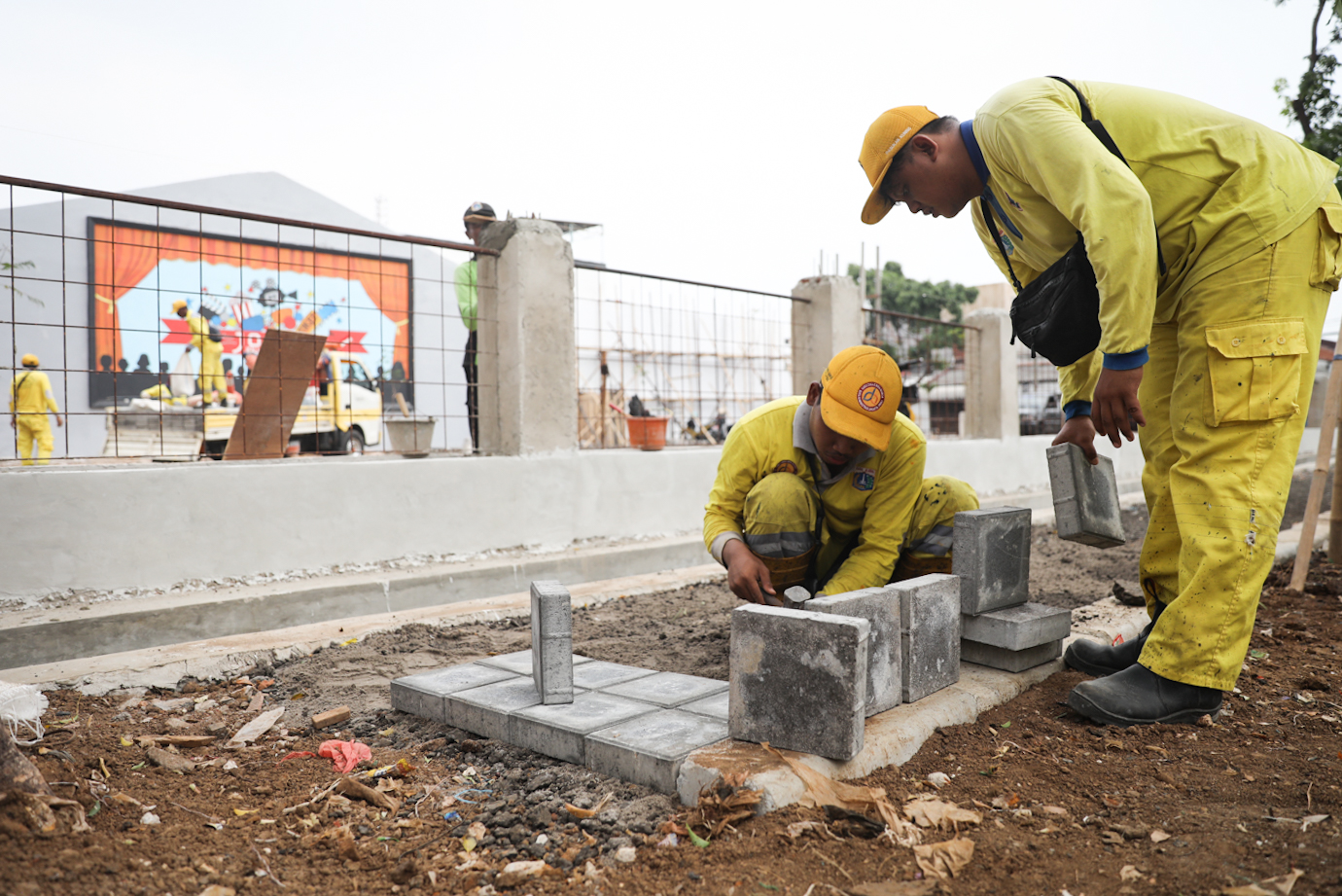 Sejumlah petugas gabungan dari Dinas Bina Marga dan Dinas Pertamanan dan Hutan Kota DKI Jakarta mengerjakan penataan kawasan eks Johar Theater di Jalan Kramat Jaya Baru, Johar Baru, Jakarta Pusat, Senin (23/9). Penataan lahan seluas sekitar 968 meter persegi menjadi taman atau ruang terbuka hijau (RTH) itu ditargetkan rampung pada Desember 2024.