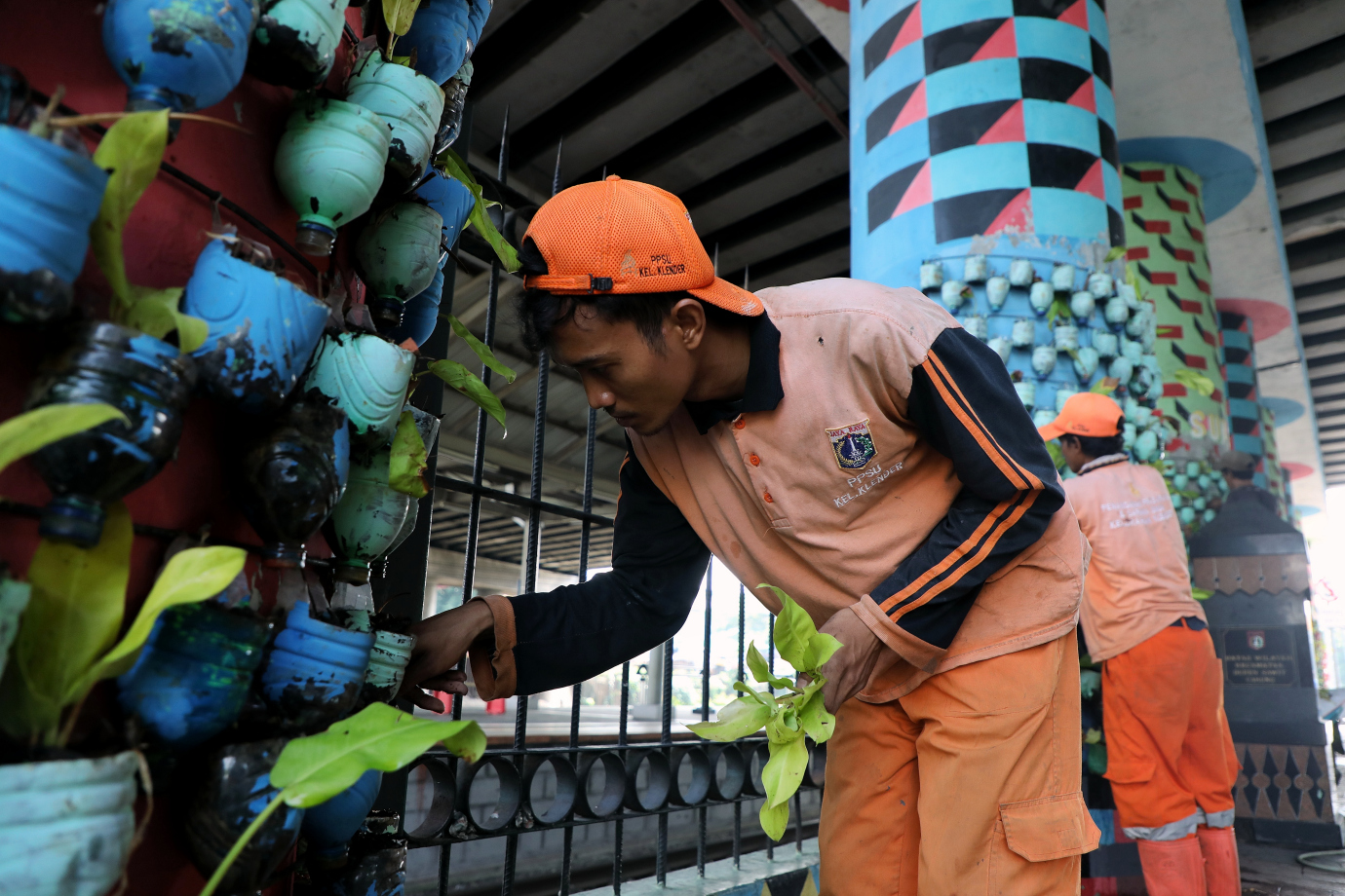 Sejumlah petugas PPSU Kelurahan Klender melakukan penataan ulang vertikal garden di kolong flyover Klender, Jalan I Gusti Ngurah Rai, Duren Sawit, Jakarta Timur, Kamis (26/9). Penataan berupa penanaman ulang tanaman hias sebanyak 1.400 pot.