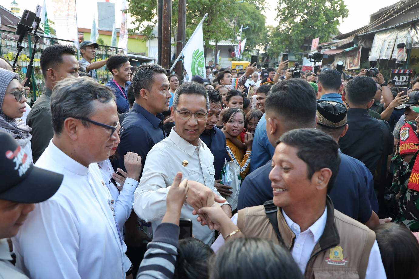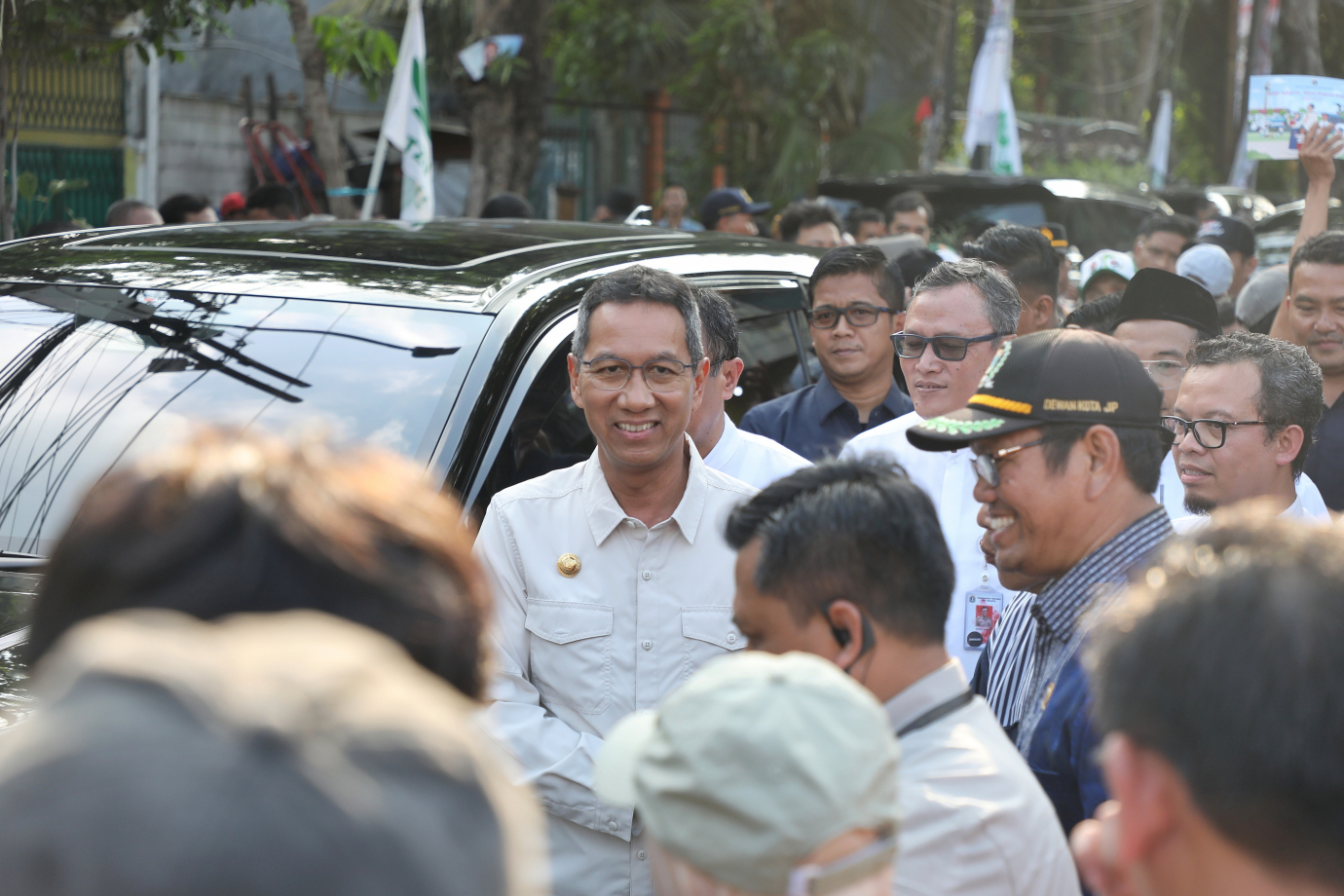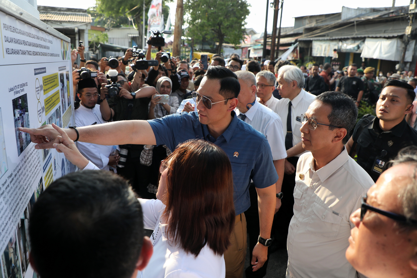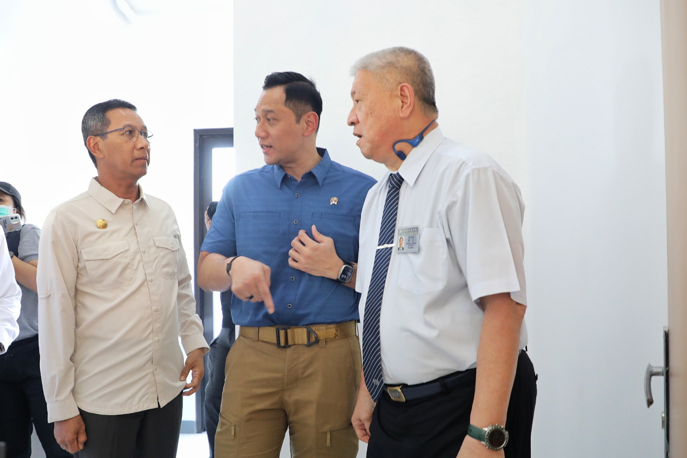 Penjabat (Pj) Gubernur DKI Jakarta, Heru Budi Hartono bersama Menteri Menteri ATR/BPN, Agus Harimurti Yudhoyono meninjau sekaligus menyerahkan secara simbolis kunci hunian vertikal di Jalan Tanah Tinggi XII, RT 005/RW 012, Tanah Tinggi, Johar Baru, Jakarta Pusat, Jumat (27/9). Hunian empat lantai yang diberi nama Rumah Cinta Damai Tanah Tinggi ini merupakan buah kerja sama antara Pemprov DKI Jakarta dengan Kementerian Agraria dan Tata Ruang/Badan Pertanahan Nasional (ATR/BPN) dan Yayasan Buddha Tzu Chi Indonedia.