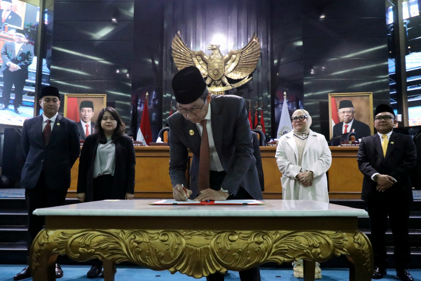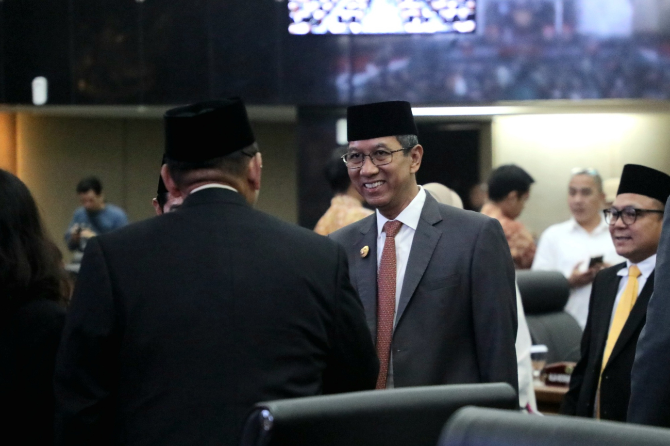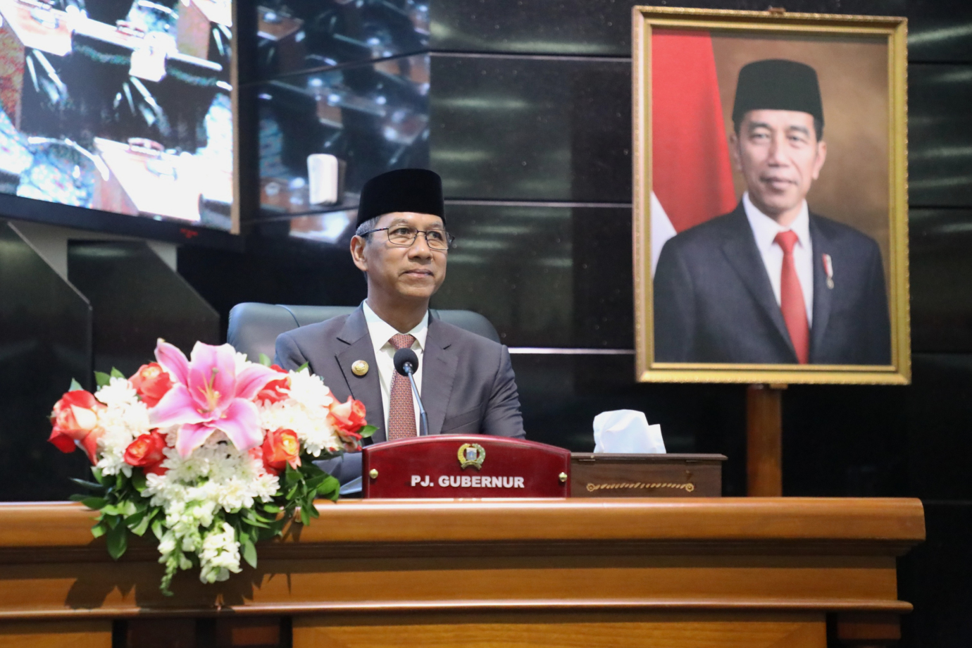 Penjabat (Pj) Gubernur DKI Jakarta, Heru Budi Hartono menghadiri rapat paripurna Dewan Perwakilan Rakyat Daerah (DPRD) Provinsi DKI Jakarta di Gedung DPRD DKI Jakarta, Selasa (8/10). Rapat Paripurna beragendakan pembukaan masa sidang dan masa reses pertama Pimpinan dan Anggota DPRD Provinsi DKI Jakarta Tahun Anggaran 2024, penandatanganan pakta integritas Kebijakan Umum APBD serta Prioritas dan Plafon Anggaran Sementara APBD (KUA-PPAS) Tahun Anggaran 2025 antara Penjabat Gubernur dengan Pimpinan DPRD DKI Jakarta dan penetapan Alat Kelengkapan DPRD DKI Jakarta masa jabatan 2024-2029.