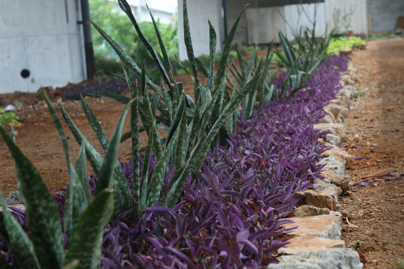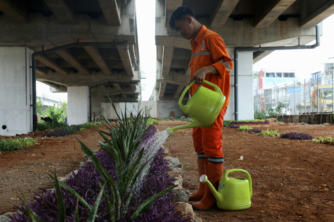 Petugas Penanganan Prasarana dan Sarana Umum (PPSU) Kelurahan Cipinang Melayu ubah lahan yang tidak terpakai di area kolong Tol Becakayu menjadi Taman Velbak di Jalan Inspeksi Tarum Barat RW 11, Cipinang Melayu, Duren Sawit, Jakarta Timur, Rabu (9/10). Taman yang memiliki luas 2.000 meter persegi ditanami berbagai jenis tanaman hias seperti adam hawa, philo, hanjuang, kamboja merah dan suji.