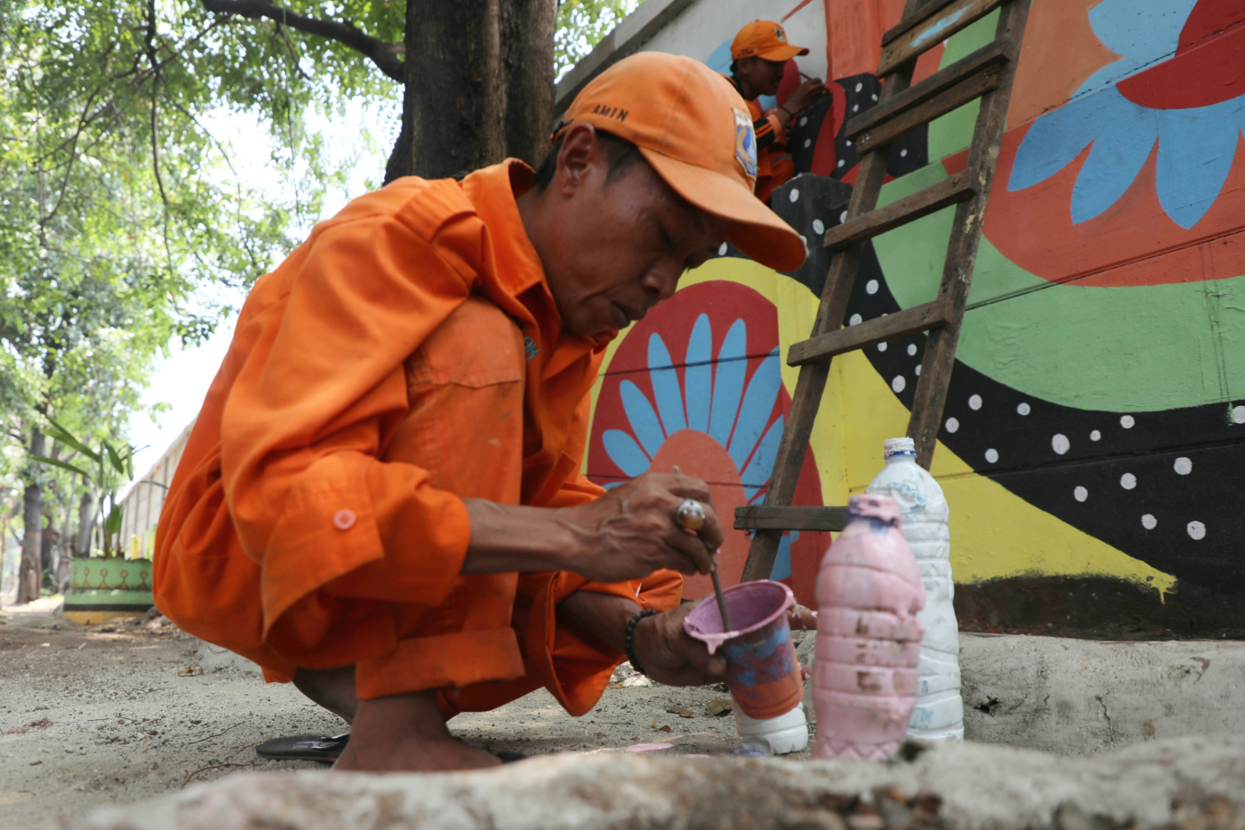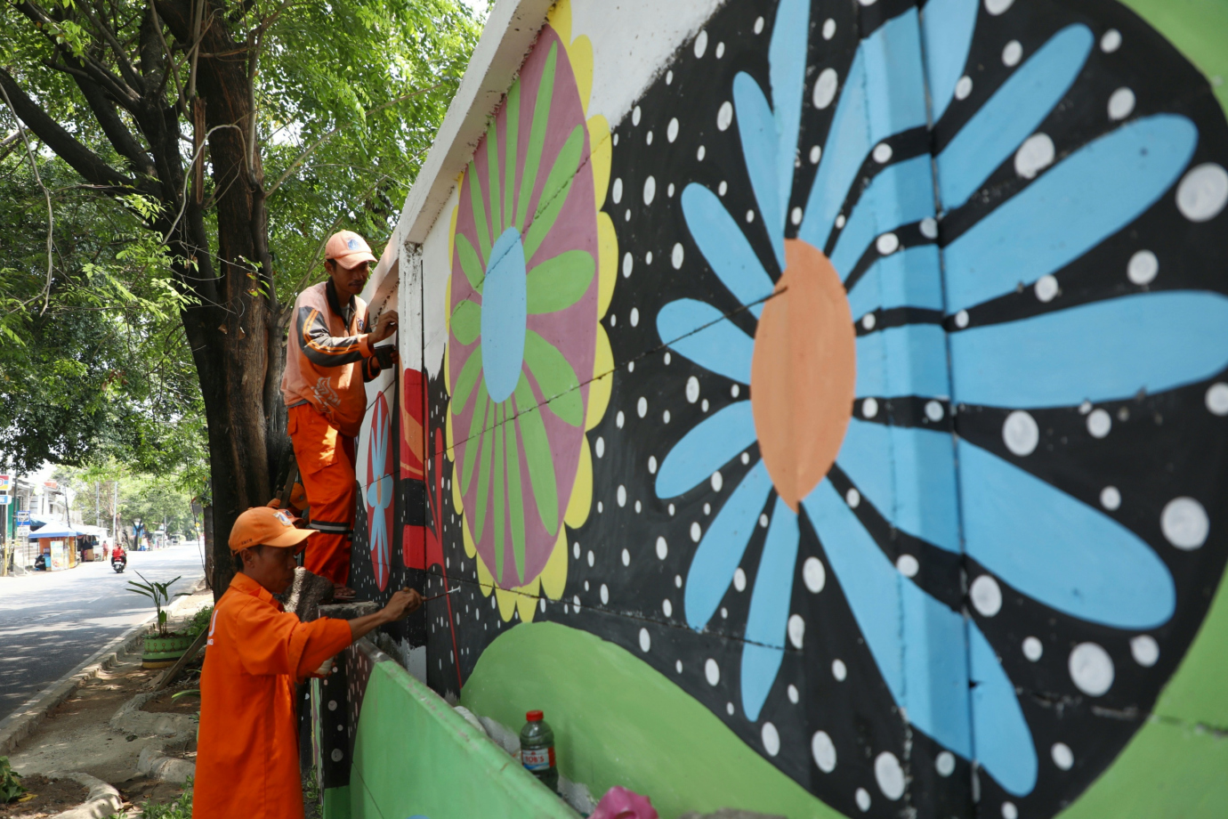 Empat petugas Penanganan Prasarana dan Sarana Umum (PPSU) Kelurahan Pulogebang mempercantik kawasan dengan mural di Jalan Cakung Cilincing Barat, Cakung, Jakarta Timur, Jumat (11/10). Pembuatan mural dengan tema warna warni bunga ini merupakan bagian dari penataan kawasan unggulan ketiga tahun 2024 di Kelurahan Pulogebang.
