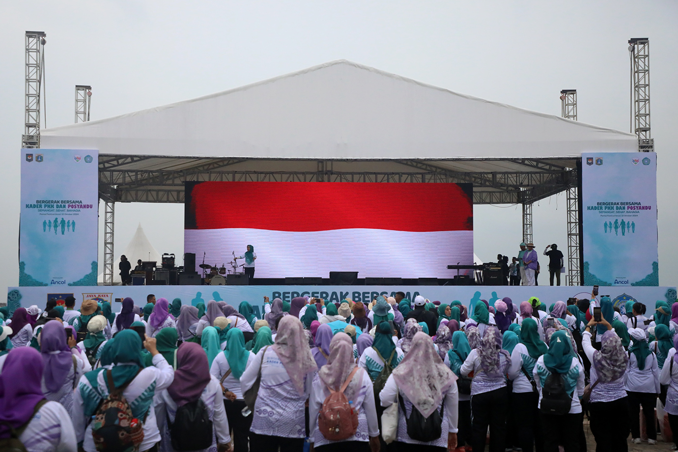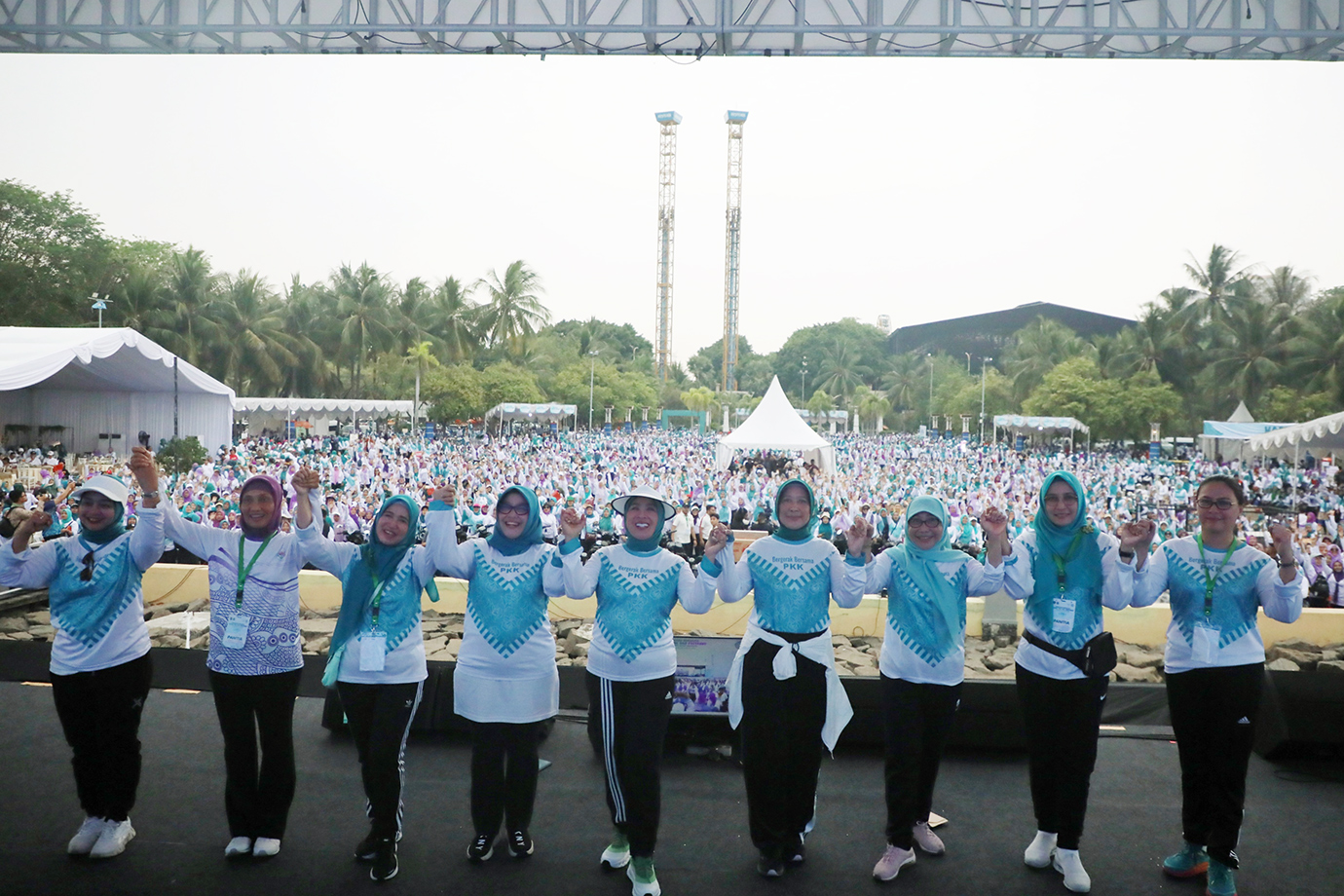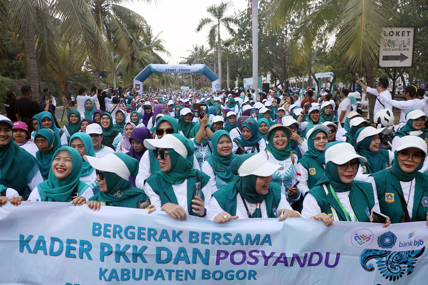 Penjabat (Pj) Gubernur DKI Jakarta, Heru Budi Hartono bersama Menteri Dalam Negeri (Mendagri), Tito Karnavian didampingi Pj Ketua Tim Penggerak (TP) PKK DKI Jakarta, Mirdiyanti dan Ketua Umum TP PKK, Tri Tito Karnavian menghadiri acara \"Funwalk Bergerak Bersama Kader PKK dan Posyandu\" di Pantai Festival Ancol, Jakarta Utara, Sabtu (12/10). Kegiatan ini diikuti14.000 Anggota PKK dan Posyandu dari Jakarta dan Bogor.