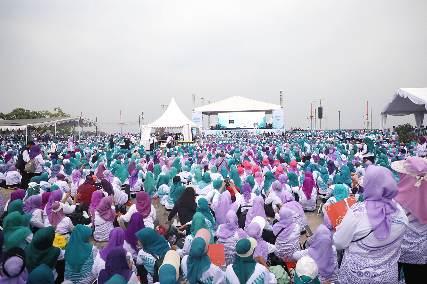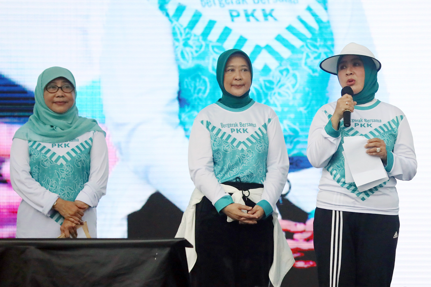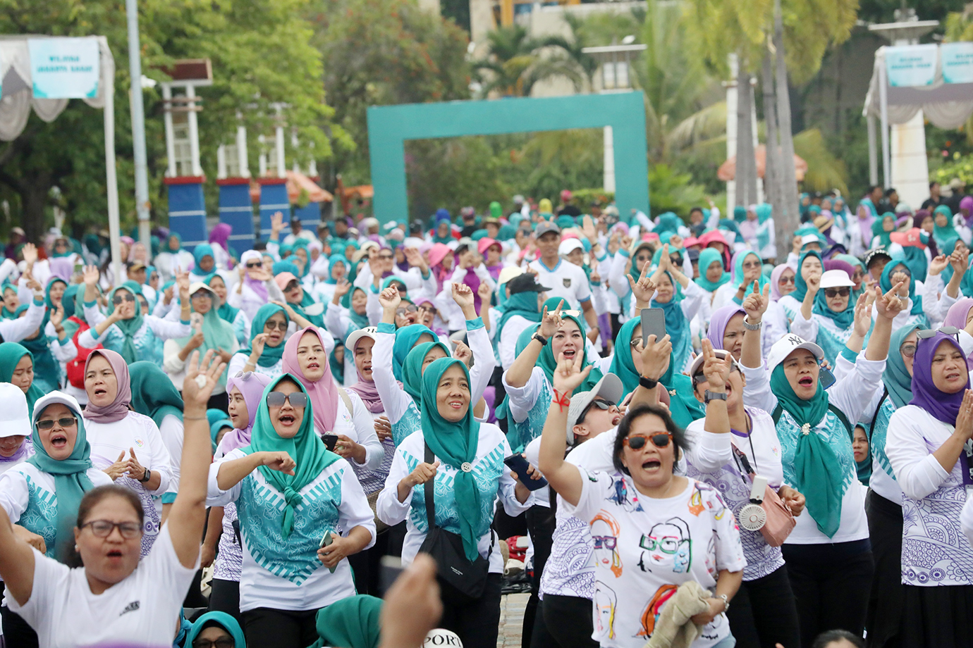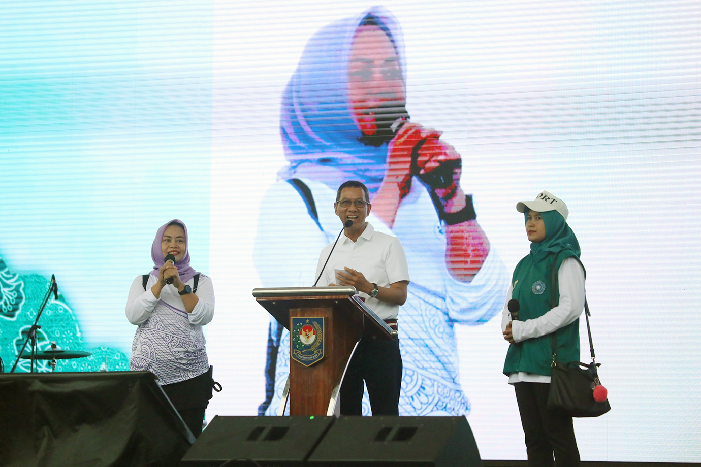 Penjabat (Pj) Gubernur DKI Jakarta, Heru Budi Hartono bersama Menteri Dalam Negeri (Mendagri), Tito Karnavian didampingi Pj Ketua Tim Penggerak (TP) PKK DKI Jakarta, Mirdiyanti dan Ketua Umum TP PKK, Tri Tito Karnavian menghadiri acara \"Funwalk Bergerak Bersama Kader PKK dan Posyandu\" di Pantai Festival Ancol, Jakarta Utara, Sabtu (12/10). Kegiatan ini diikuti14.000 Anggota PKK dan Posyandu dari Jakarta dan Bogor.