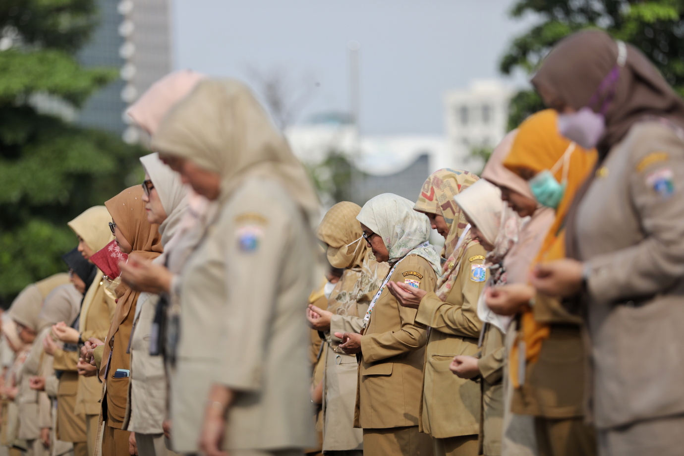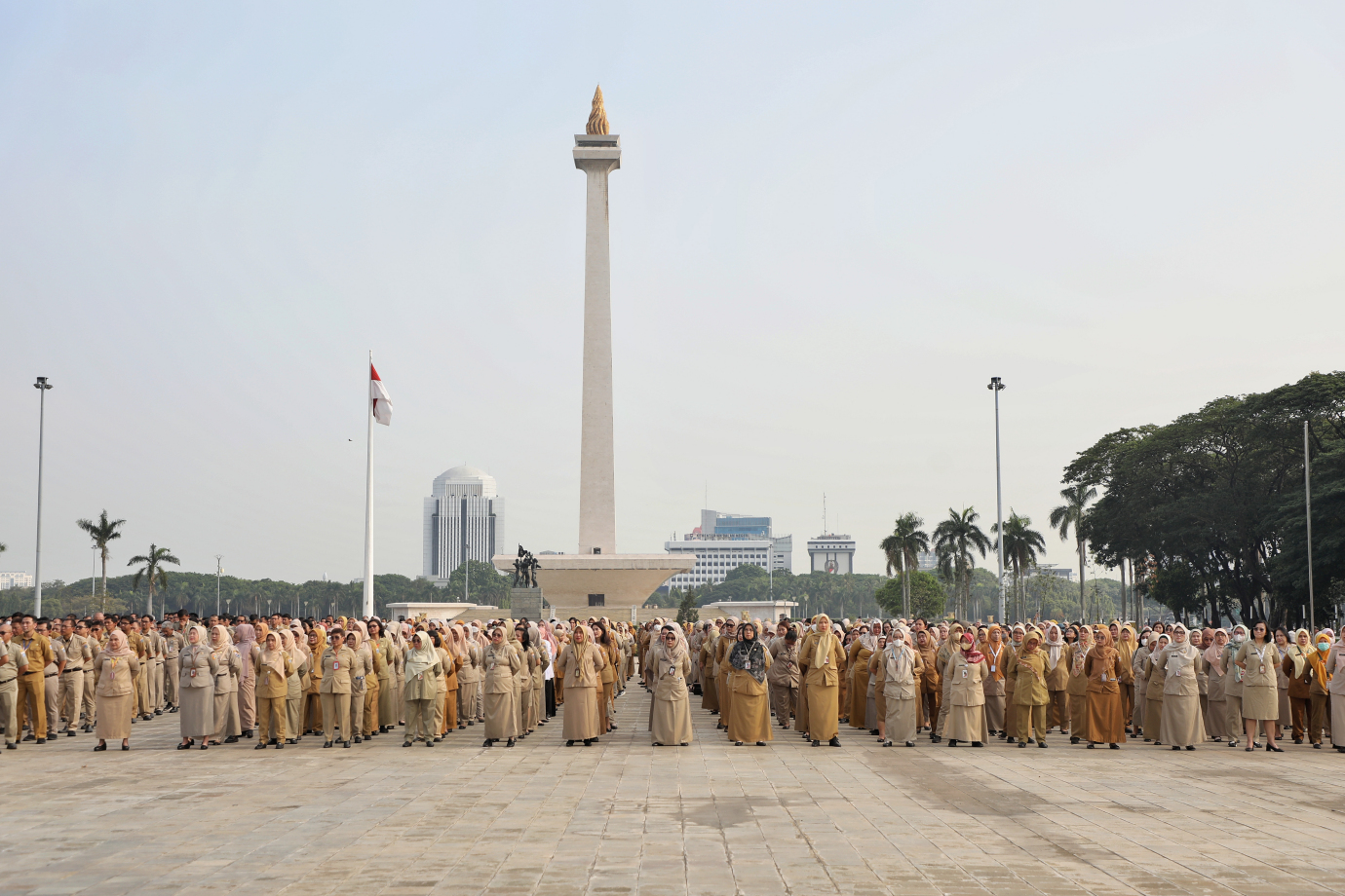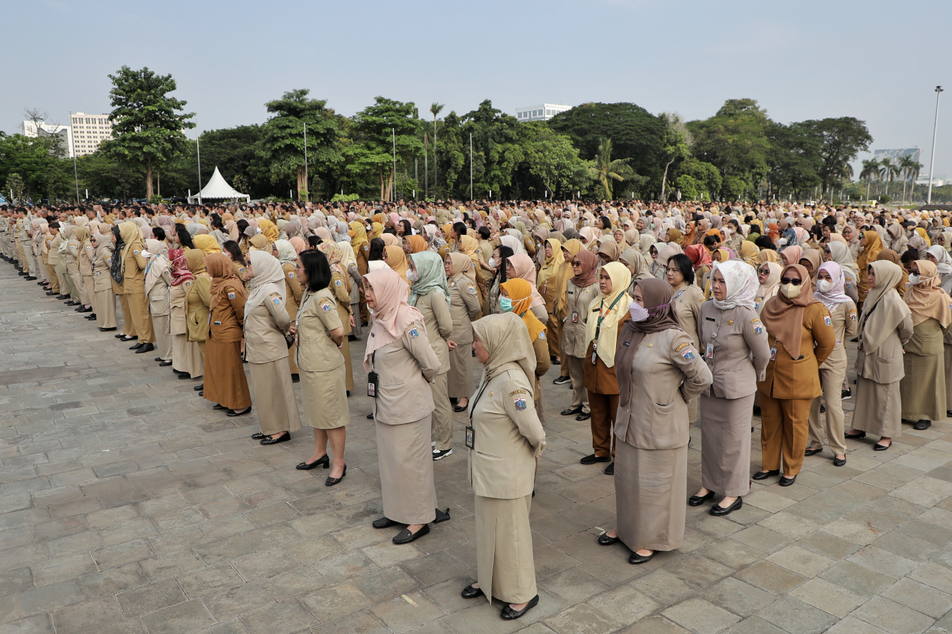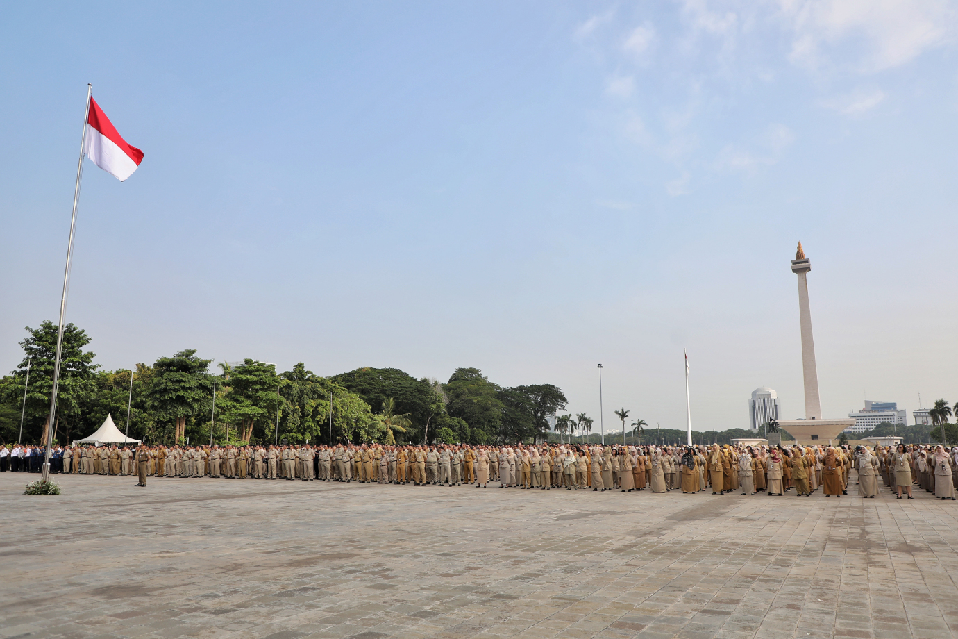 Penjabat (Pj) Gubernur DKI Jakarta, Teguh Setyabudi memberikan pengarahan kepada jajaran Aparatur Sipil Negara (ASN) di lingkungan Pemprov DKI Jakarta, di Plaza Selatan Silang Monas, Jakarta Pusat, pada Senin (21/10).