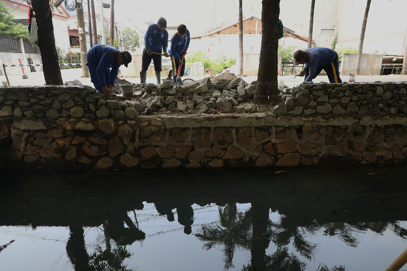 Suku Dinas Sumber Daya Air (SDA) Jakarta Utara melakukan peninggian turap saluran penghubung (PHB) Deposito di Jalan Pegangsaan Indah Barat, Pegangsaan Dua, Kelapa Gading.