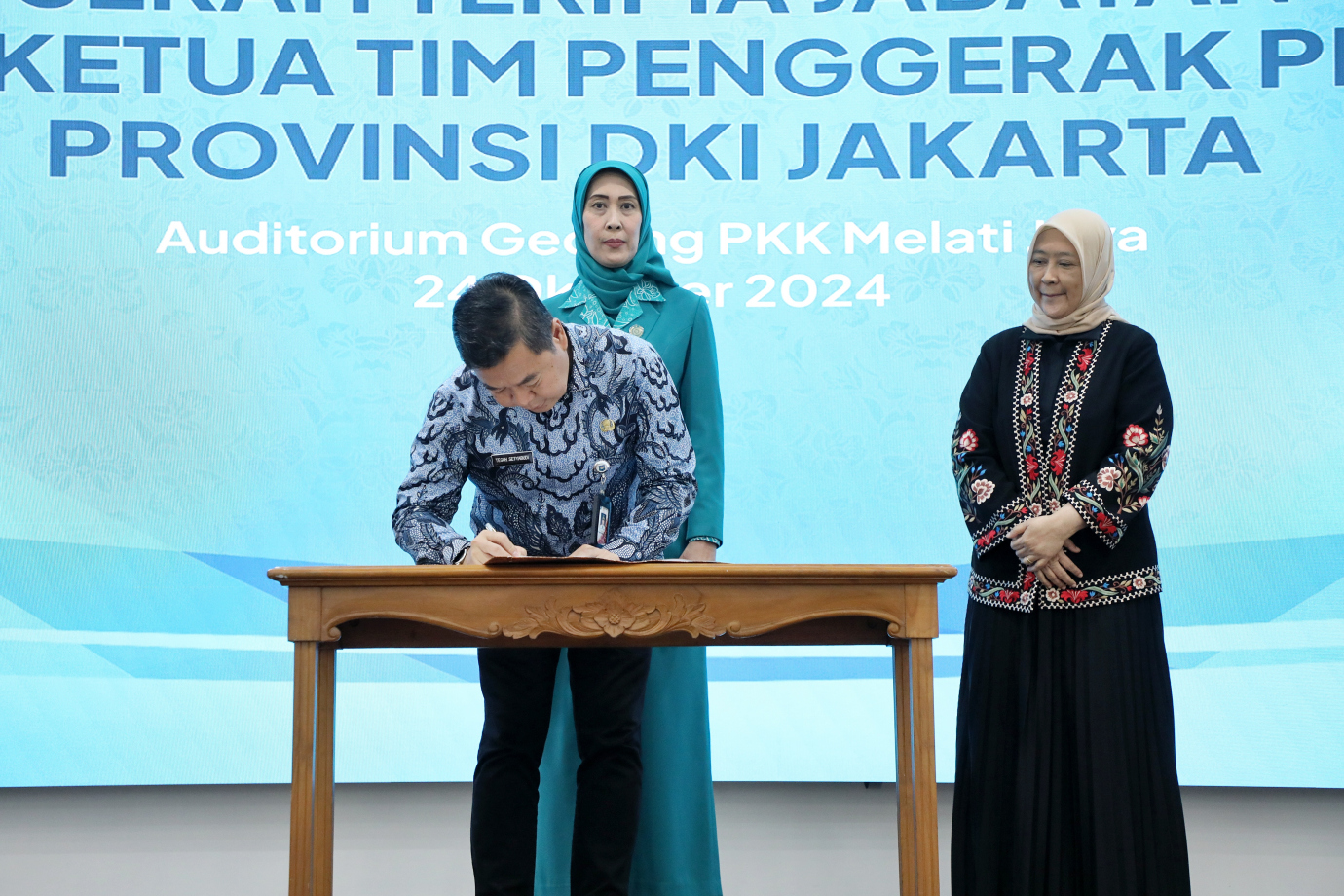 Gubernur DKI Jakarta, Teguh Setyabudi menghadiri prosesi serah terima jabatan (sertijab) kepemimpinan Tim Penggerak Pemberdayaan dan Kesejahteraan Keluarga (TP PKK) Provinsi DKI Jakarta, di Gedung PKK Melati Jaya, Pasar Minggu, Jakarta Selatan, Kamis (24/10). Serah terima dilakukan oleh Pj TP PKK periode 2022-2024 Mirdiyanti Budi Hartono kepada Ika Octaviana.