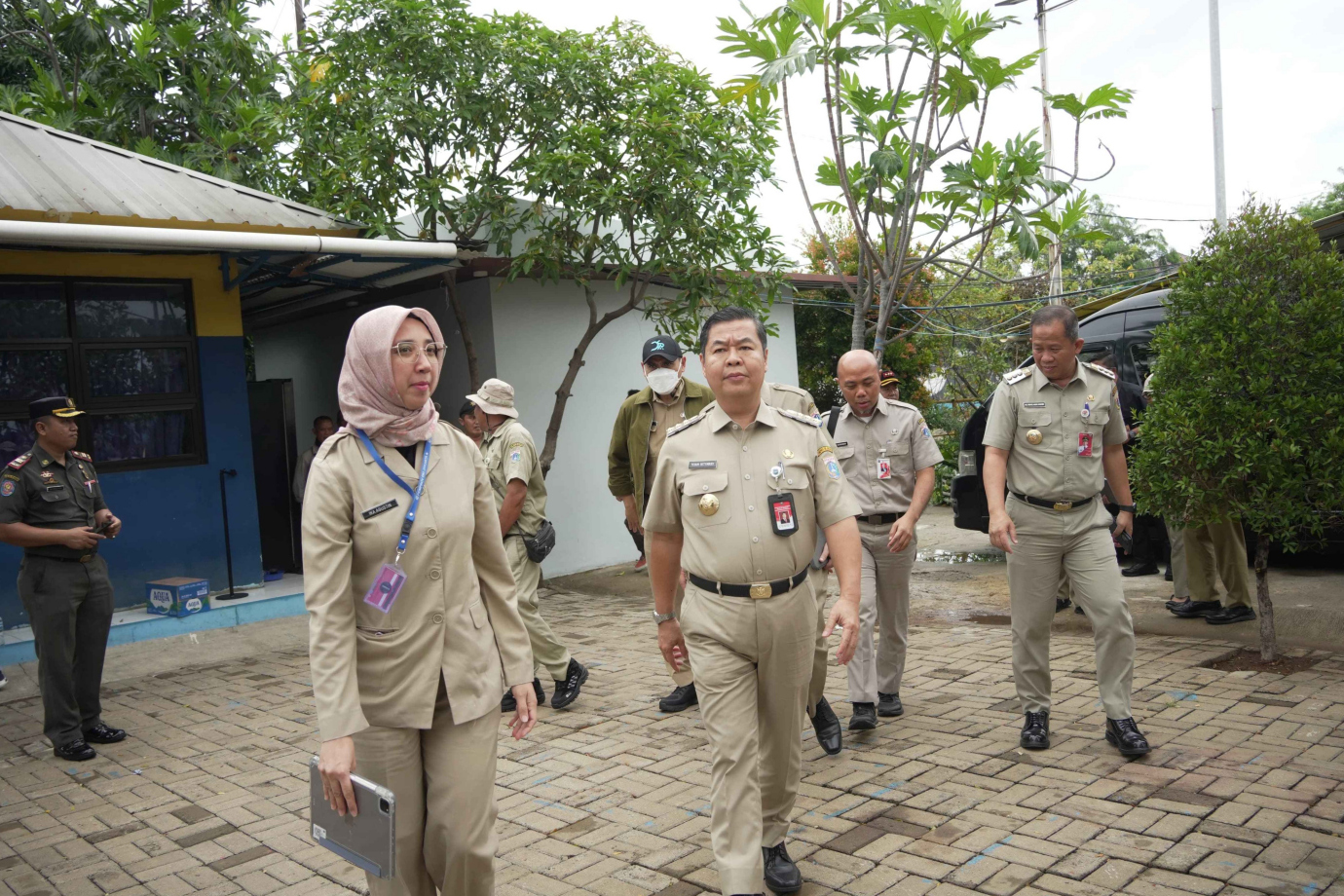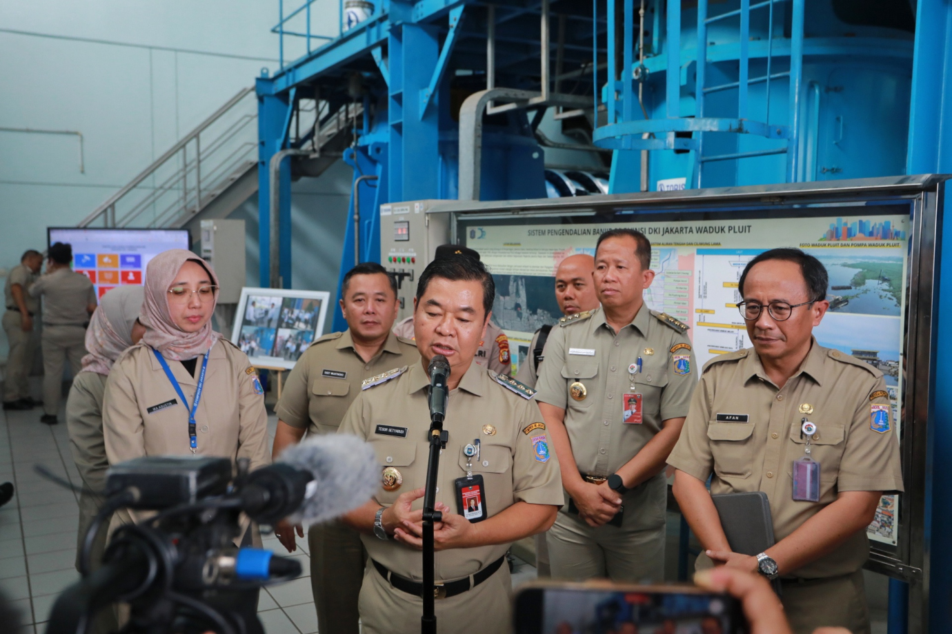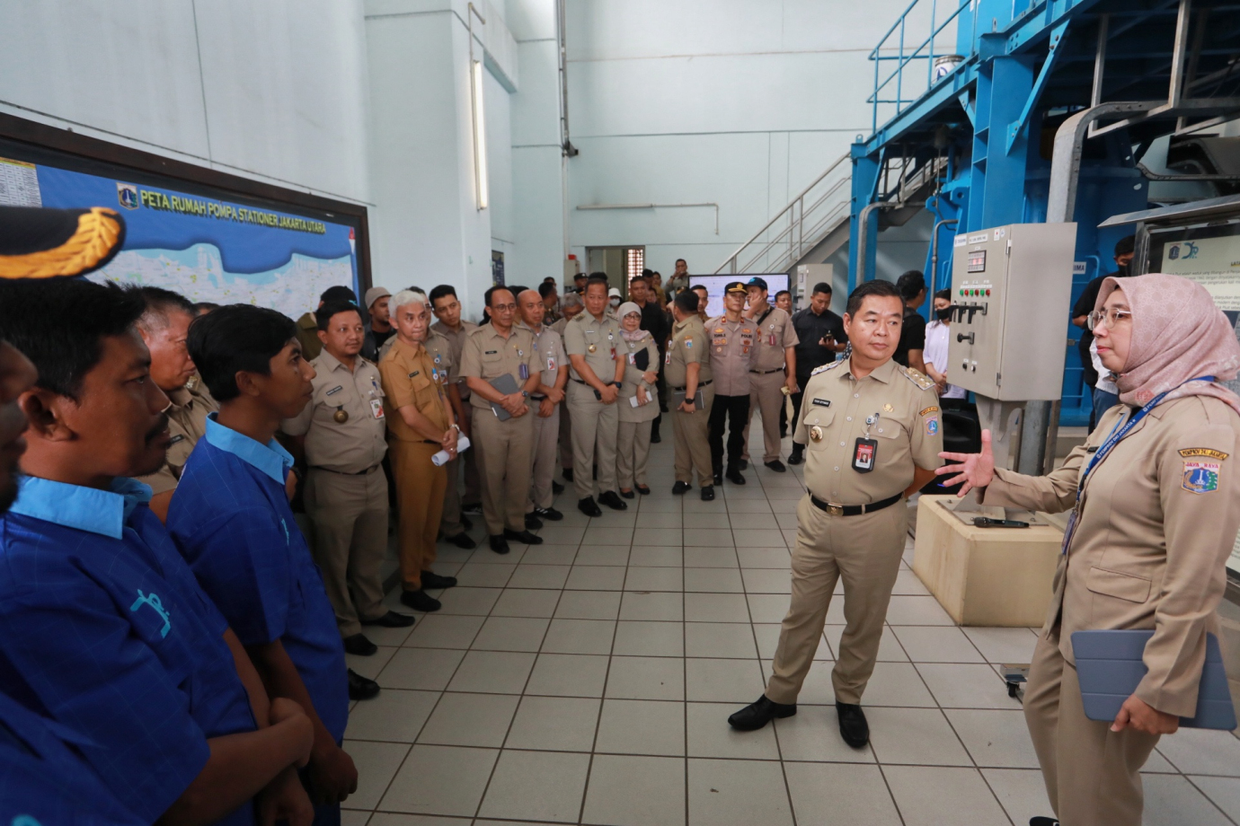 Penjabat (Pj) Gubernur DKI Jakarta, Teguh Setyabudi bersama Plt Kepala Dinas Sumber Daya Air (SDA), Ika Agustin Ningrum dan Walikota Jakarta Utara, Ali Maulana Hakim serta Jajaran Pejabat Pemprov DKI meninjau Rumah Pompa Waduk Pluit, Pluit, Jakarta Utara, Senin (4/11). Peninjauan ini dilakukan untuk memastikan Sumber Daya Manusia (SDM) serta sarana dan prasarana pendukung bekerja optimal dikarenakan peran Pompa Waduk Pluit sangat strategis menjangkau hingga ke pusat pemerintahan yaitu wilayah Istana Presiden.