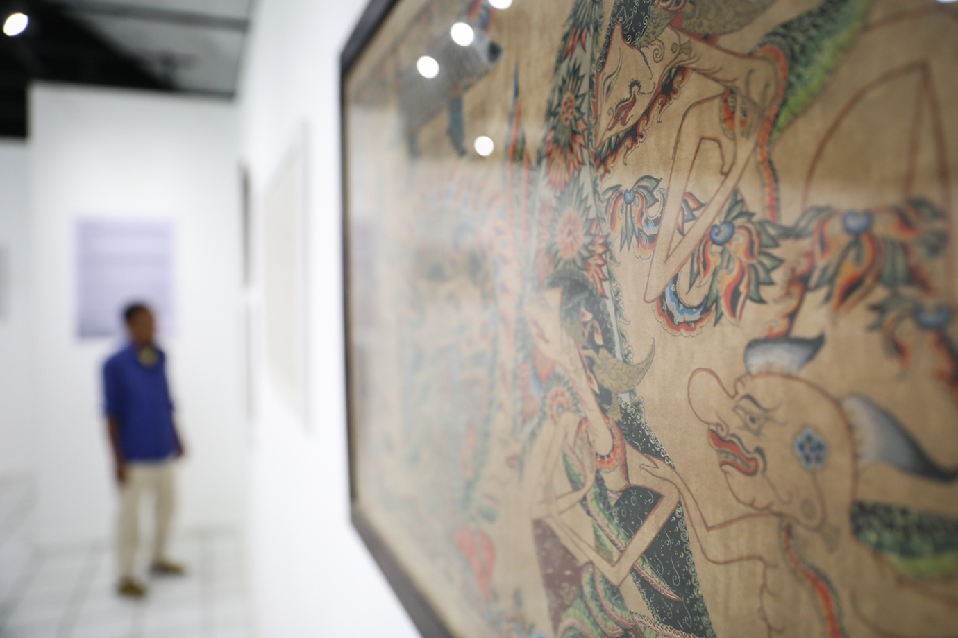 Menilik pameran wayang beber pada Pameran Tugelan Tugiman, di Balai Budaya, Menteng, Jakarta Pusat, Selasa (5/11). Pameran ini digelar dalam rangka peringatan hari penetapan wayang sebagai warisan benda oleh UNESCO dengan menampilkan beberapa cerita wayang beber yang dikarang oleh Tugiman Hadisuwarno, seorang maestro lukis wayang beber dari Puro Mangkunegaran Solo.