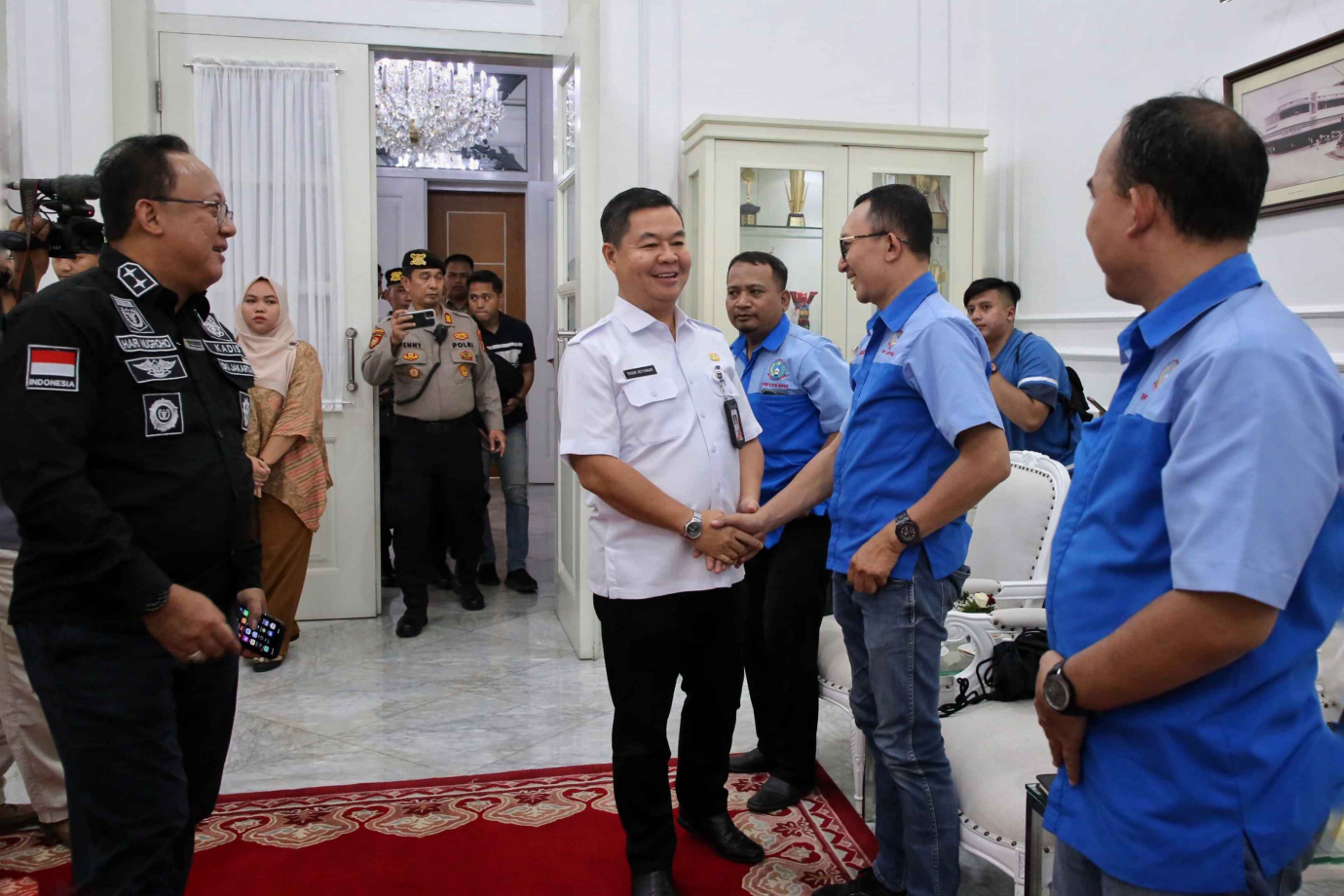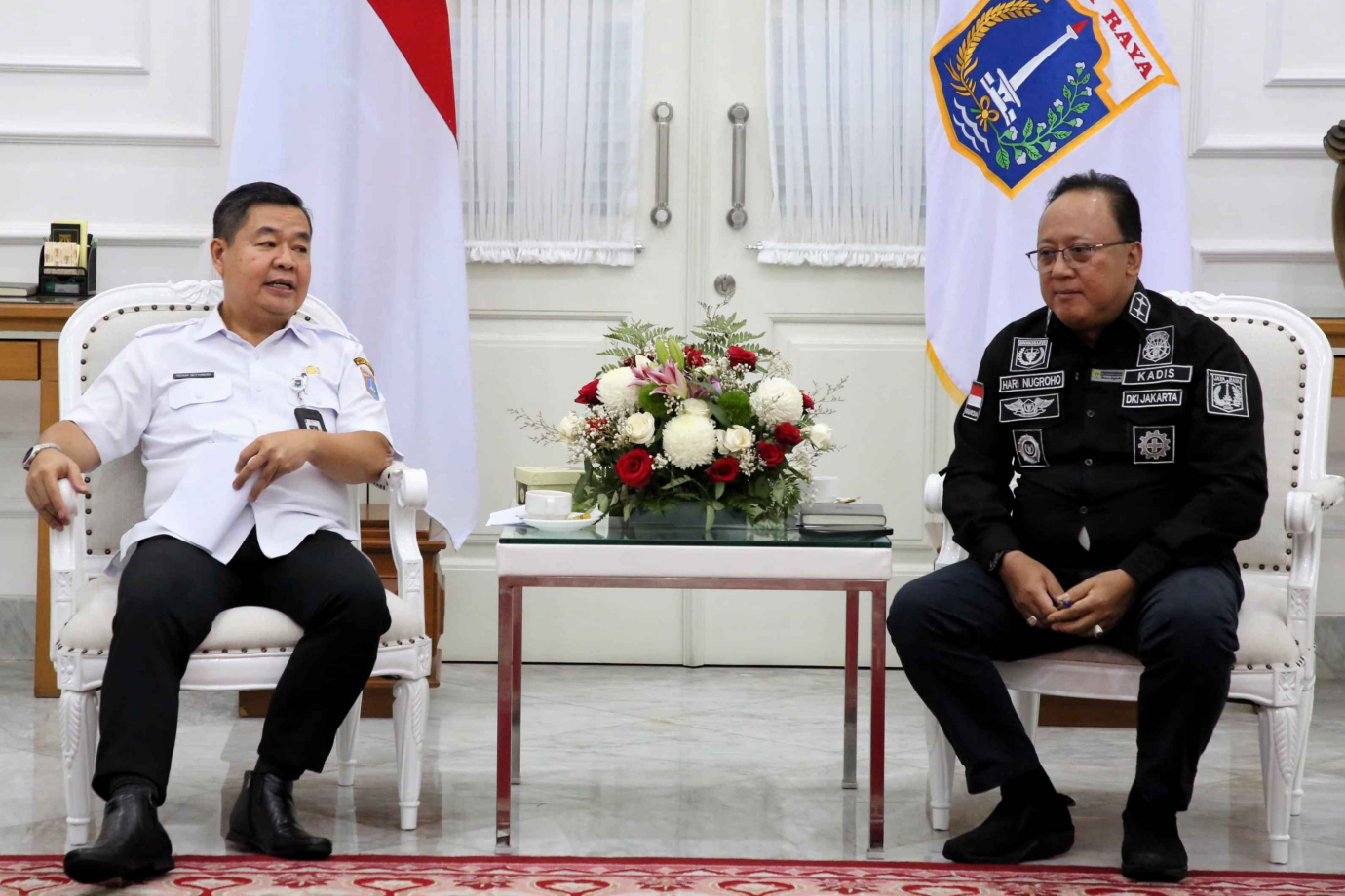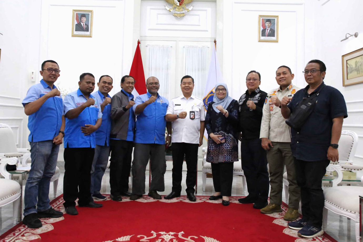 Penjabat (Pj) Gubernur DKI Jakarta, Teguh Setyabudi bersama Kepala Dinas Tenaga Kerja, Transmigrasi dan Energi (Disnakertransgi) Hari Nugroho, Asisten Perekonomian dan Keuangan (Asperkeu) Sri Haryati dan Kepala Satuan Polisi Pamong Praja (Pol PP) Arifin, menerima perwakilan buruh dari Serikat Pekerja Seluruh Indonesia (SPSI) diruang tamu Gubernur, Balai Kota DKI Jakarta, Rabu (6/11). Pertemuan ini mendiskusikan usulan perwakilan buruh menjelang penetapan Upah Minimum Provinsi (UMP) untuk DKI Jakarta.