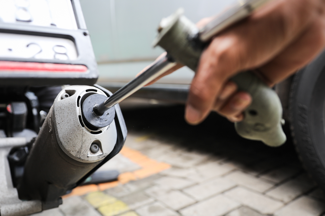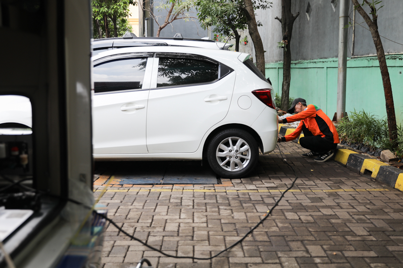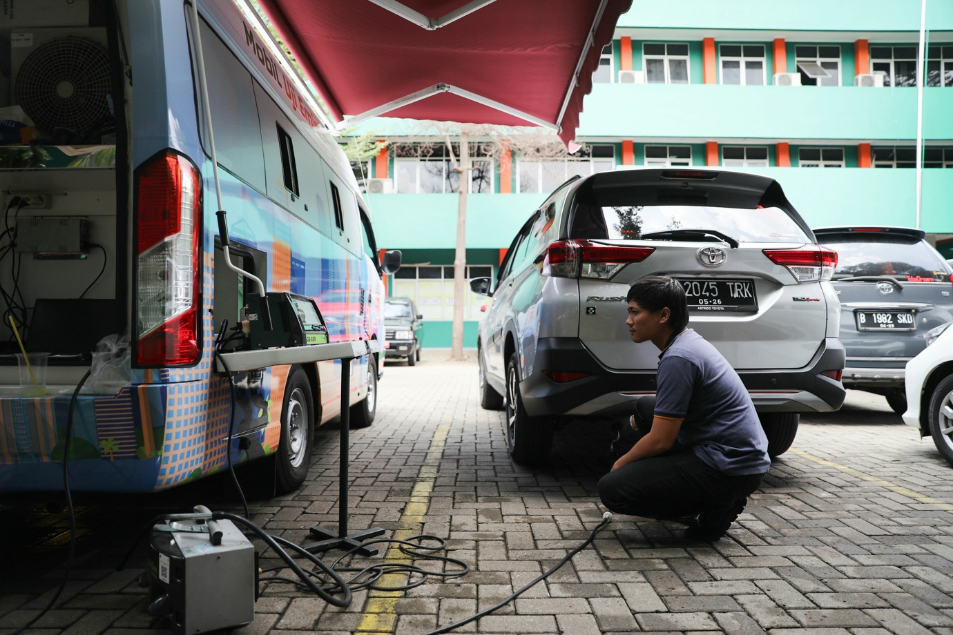 Petugas melakukan uji emisi kendaraan bermotor roda dua dan roda empat di halaman Kantor Suku Dinas Lingkungan Hidup (Sudin LH) Jakarta Timur, Makasar, Selasa (12/11). Layanan uji emisi gratis digelar pukul 09.00-12.00 dalam rangka memperingati Hari Pahlawan Nasional yang jatuh pada tanggal 10 November.