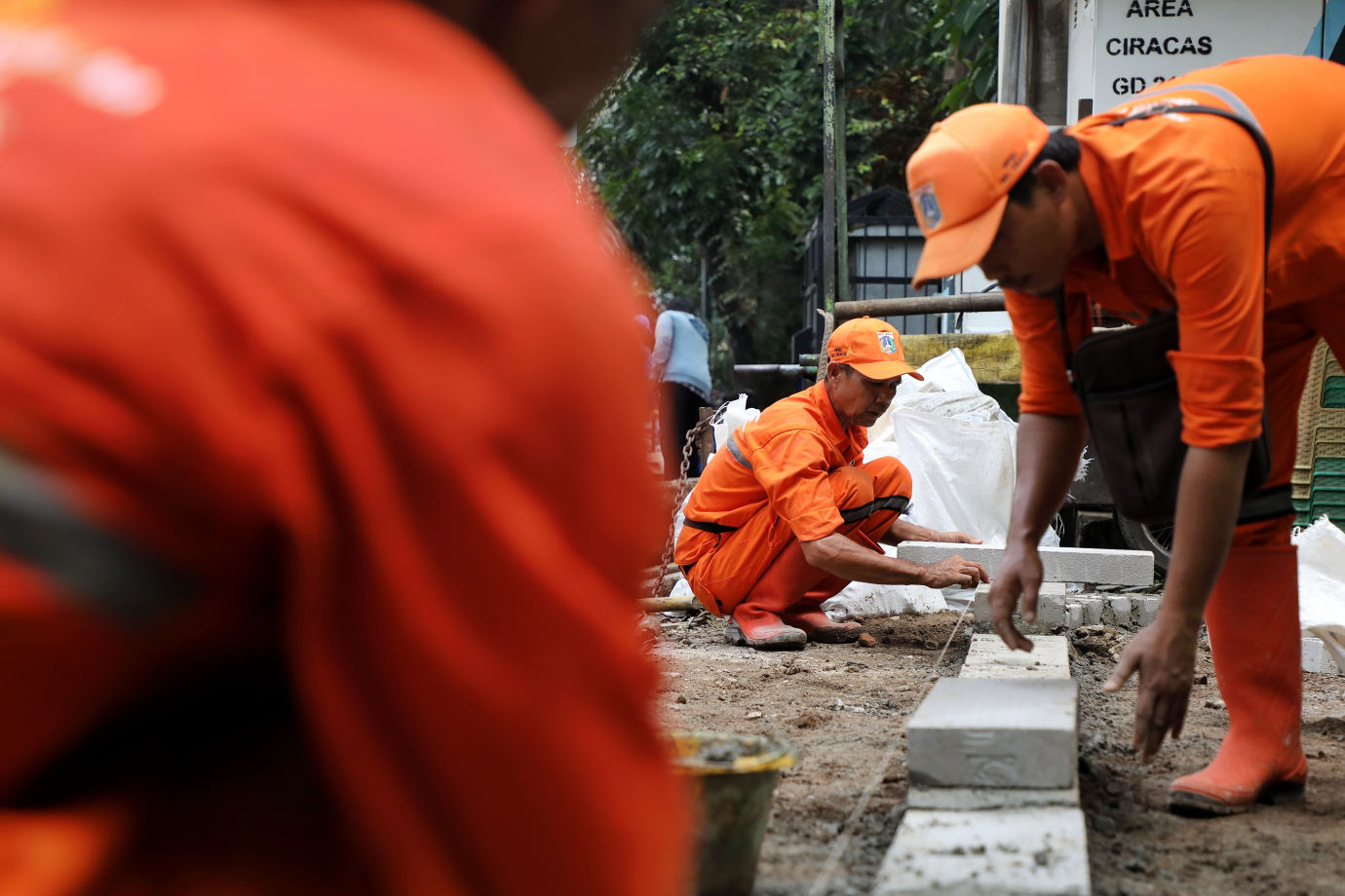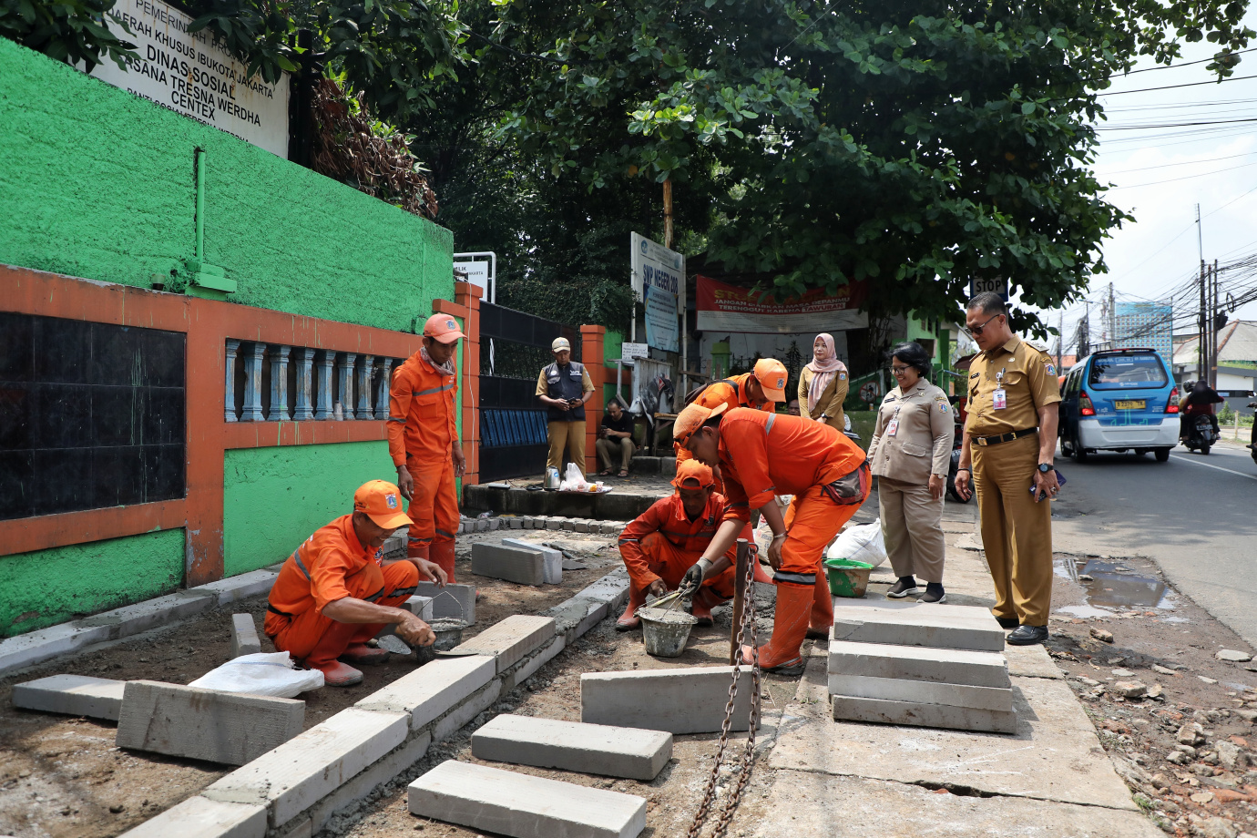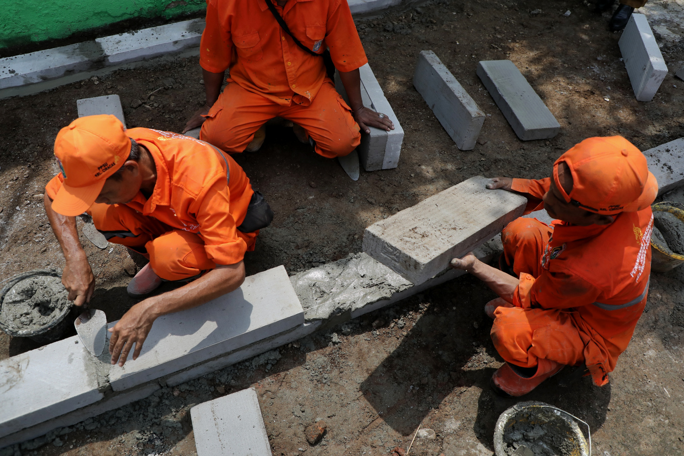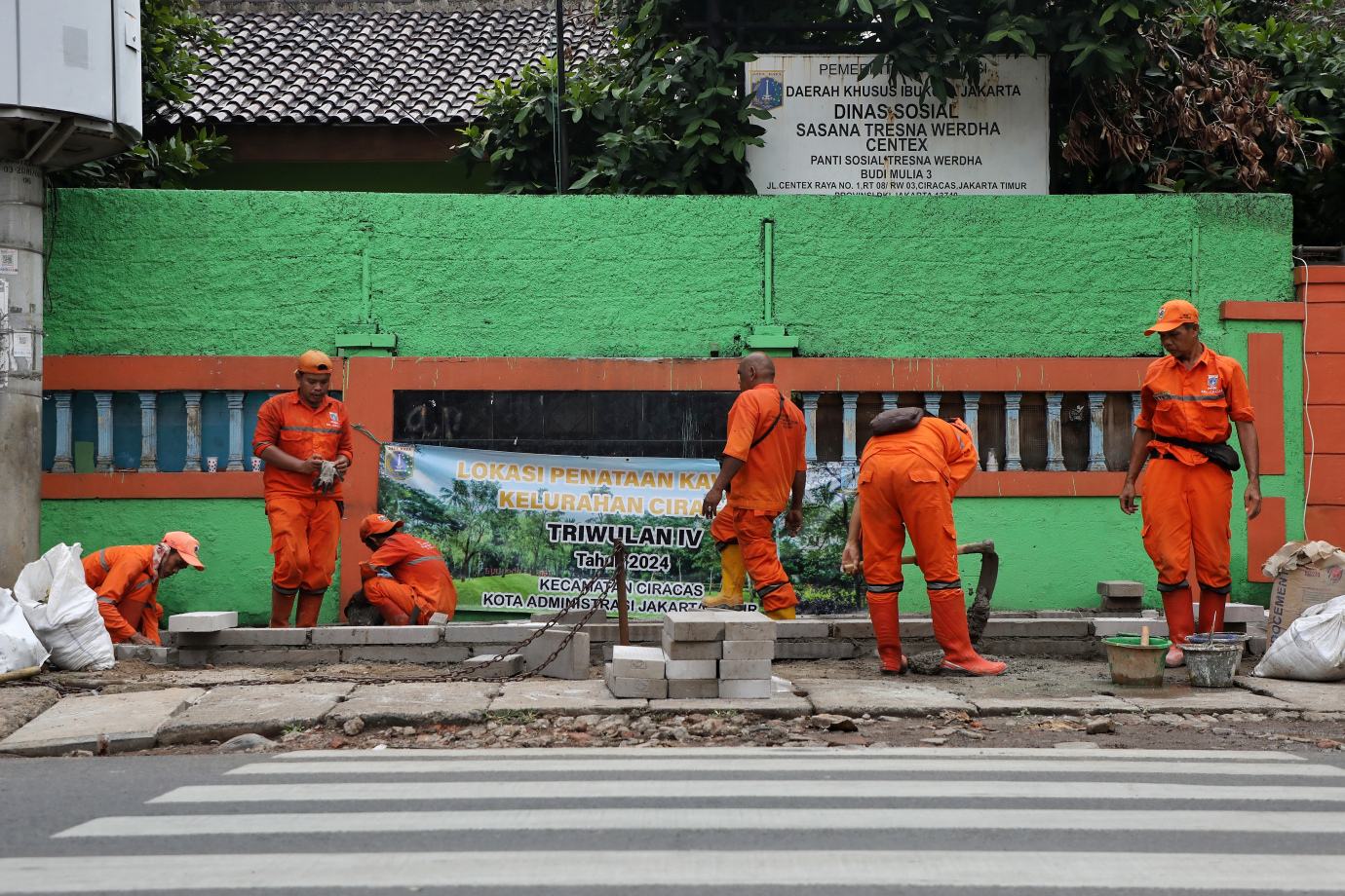 Sejumlah petugas PPSU Kelurahan Ciracas lakukan penataan kawasan unggulan triwulan IV di Jalan Raya Centek, Kelurahan Ciracas, Kecamatan Ciracas, Jakarta Timur, Selasa (12/11). Penataan kawasan unggulan dengan luas sekitar 70 meter persegi yang berada di dua titik dan masih menjadi satu kesatuan ini sudah mencapai 50 persen.