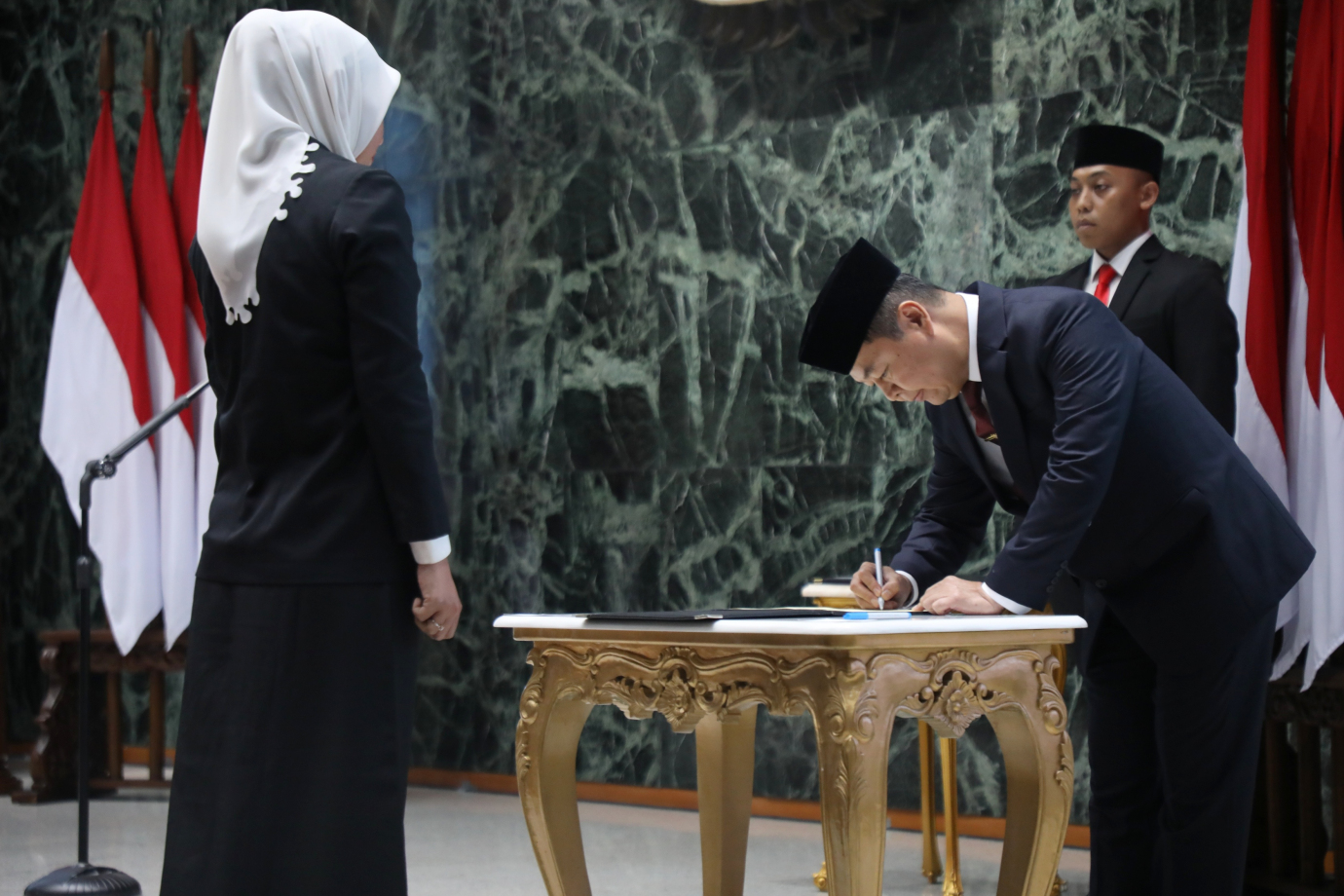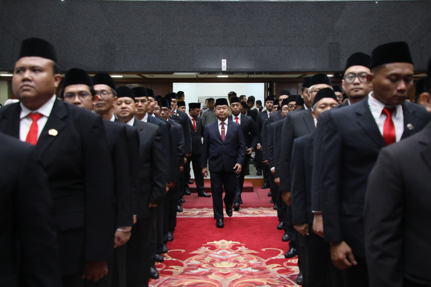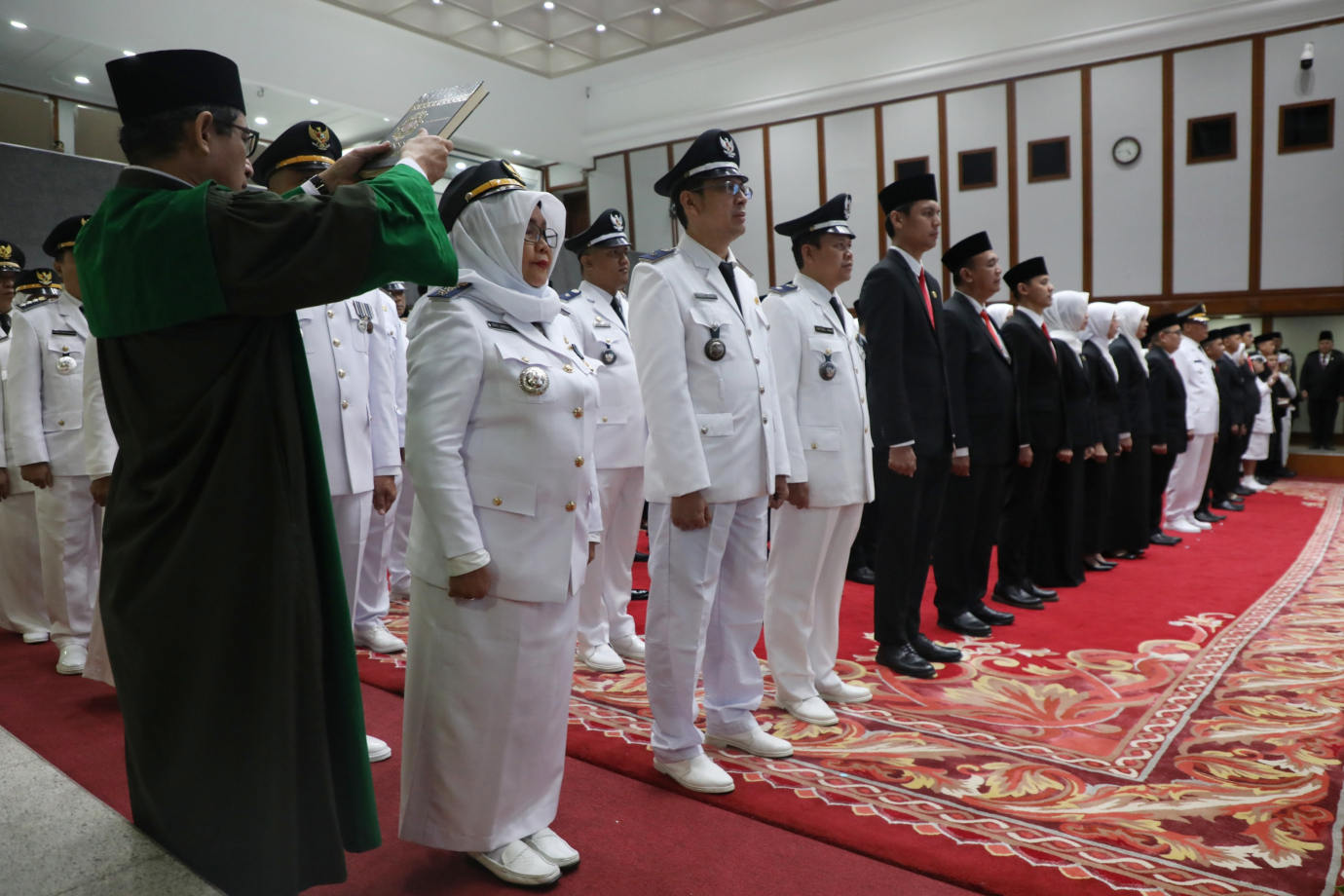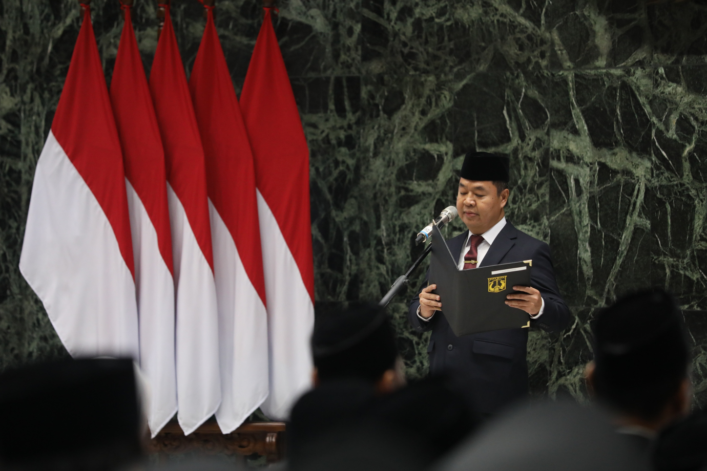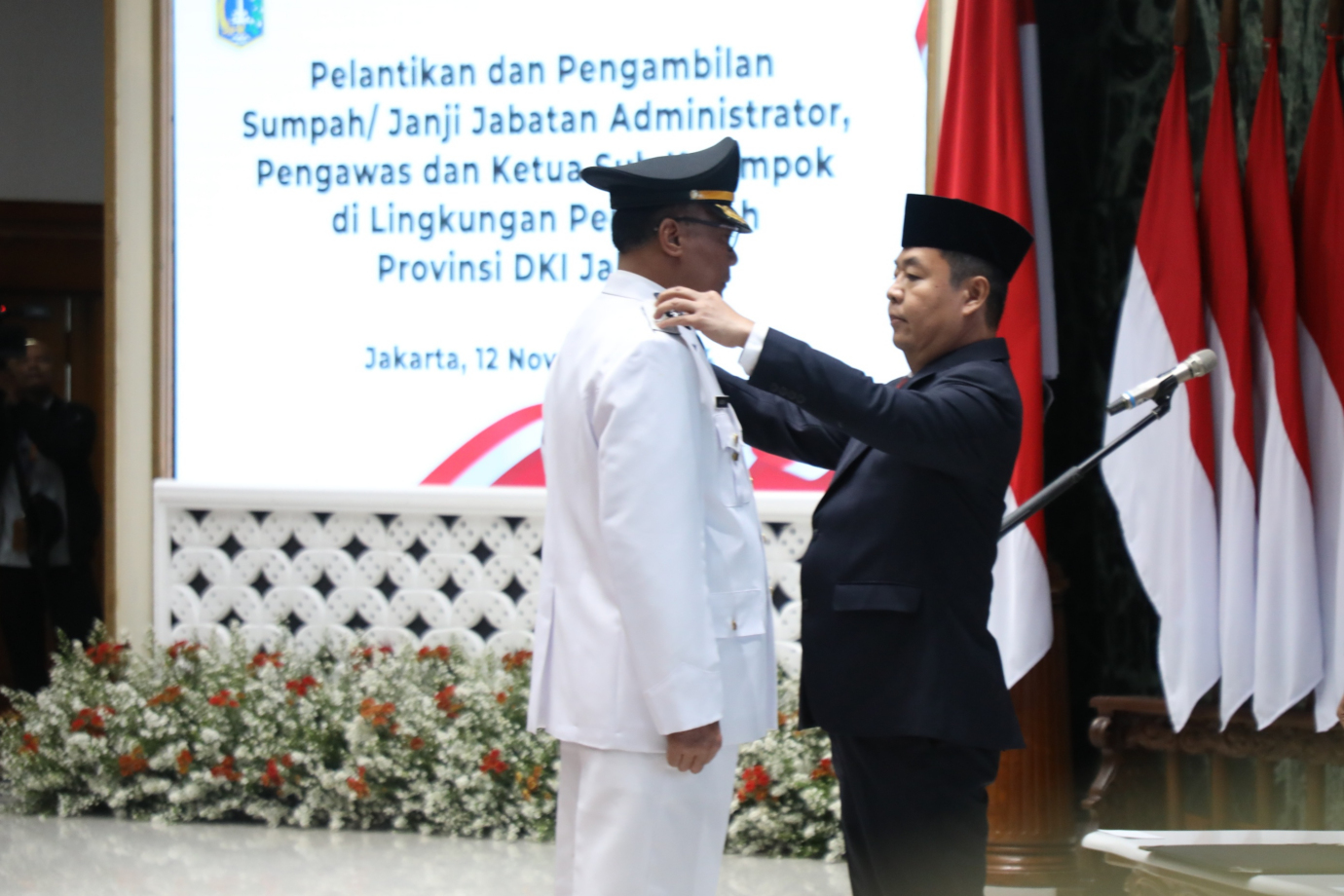 Penjabat (Pj) Gubernur DKI Jakarta, Teguh Setyabudi melantik dan pengambilan sumpah pejabat Administrator, Pengawas dan Ketua Sub Kelompok (Kasubkel) di lingkungan Balai Kota DKI Jakarta, Selasa (12/11). Sebanyak 305 orang Aparatur Sipil Negara (ASN) yang terdiri dari pejabat eselon III dan IV dilantik dan diambil sumpah jabatan di Balai Agung, Balai Kota DKI Jakarta, Jakarta Pusat.
