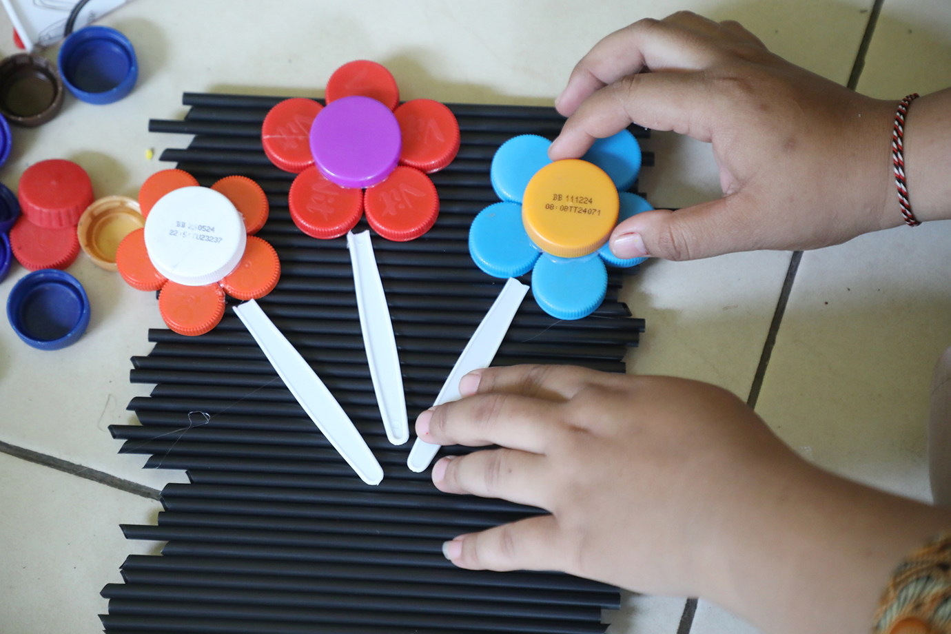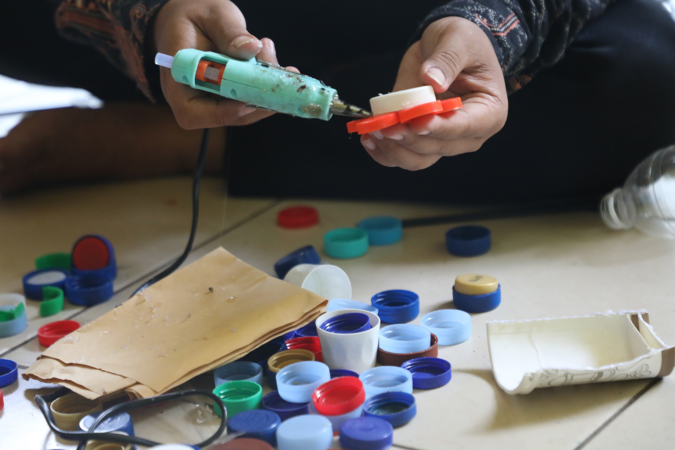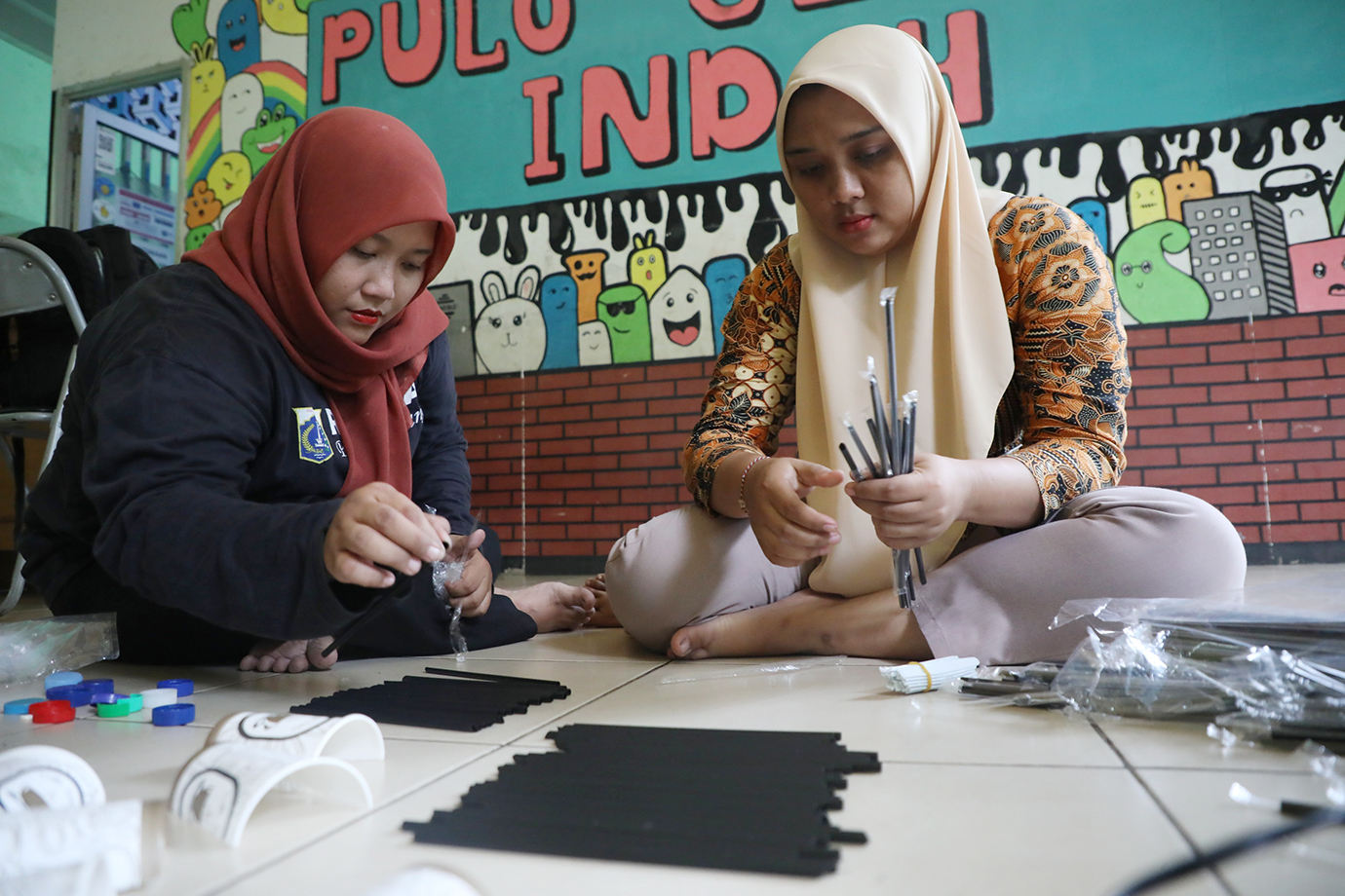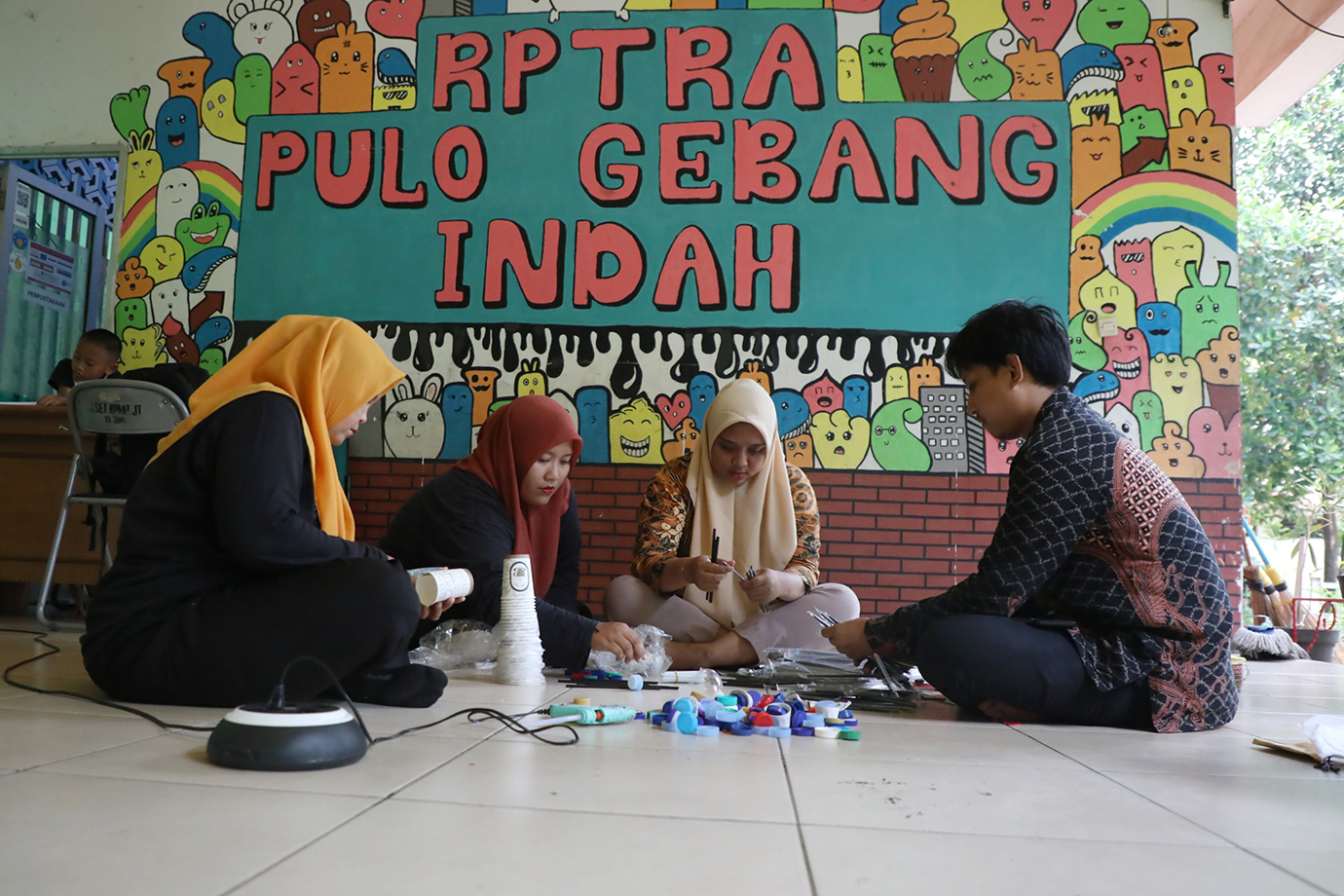 Pengelola Ruang Publik Terpadu Ramah Anak (RPTRA) Pulogebang Indah, Cakung, Jakarta Timur membuat kreasi hiasan dinding dengan bahan dasar barang tidak terpakai. Hiasan dinding kreasi tersebut berasal dari tutup botol, sedotan dan gelas kertas yang didapatkan dari warga sekitar.