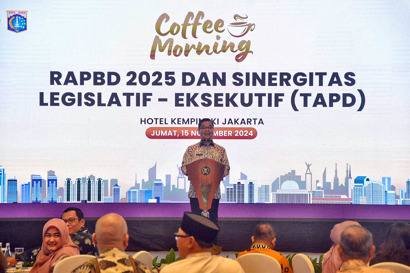 Penjabat (Pj) Gubernur DKI Jakarta, Teguh Setyabudi bersama jajaran DPRD DKI Jakarta menggelar Coffee Morning Rancangan Anggaran Pendapatan dan Belanja Daerah (RAPBD) 2025 dan Sinergitas Legislatif-Eksekutif Tim Anggaran Pemerintah Daerah (TAPD) DKI Jakarta di Hotel Kempinski, Menteng, Jakarta Pusat, Jumat (15/11).