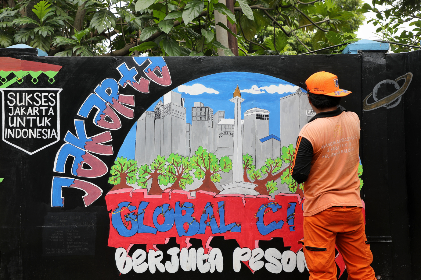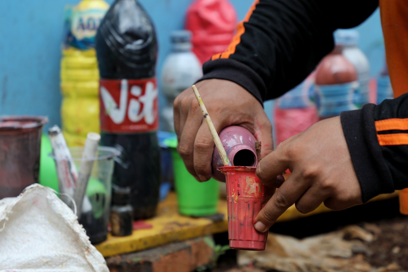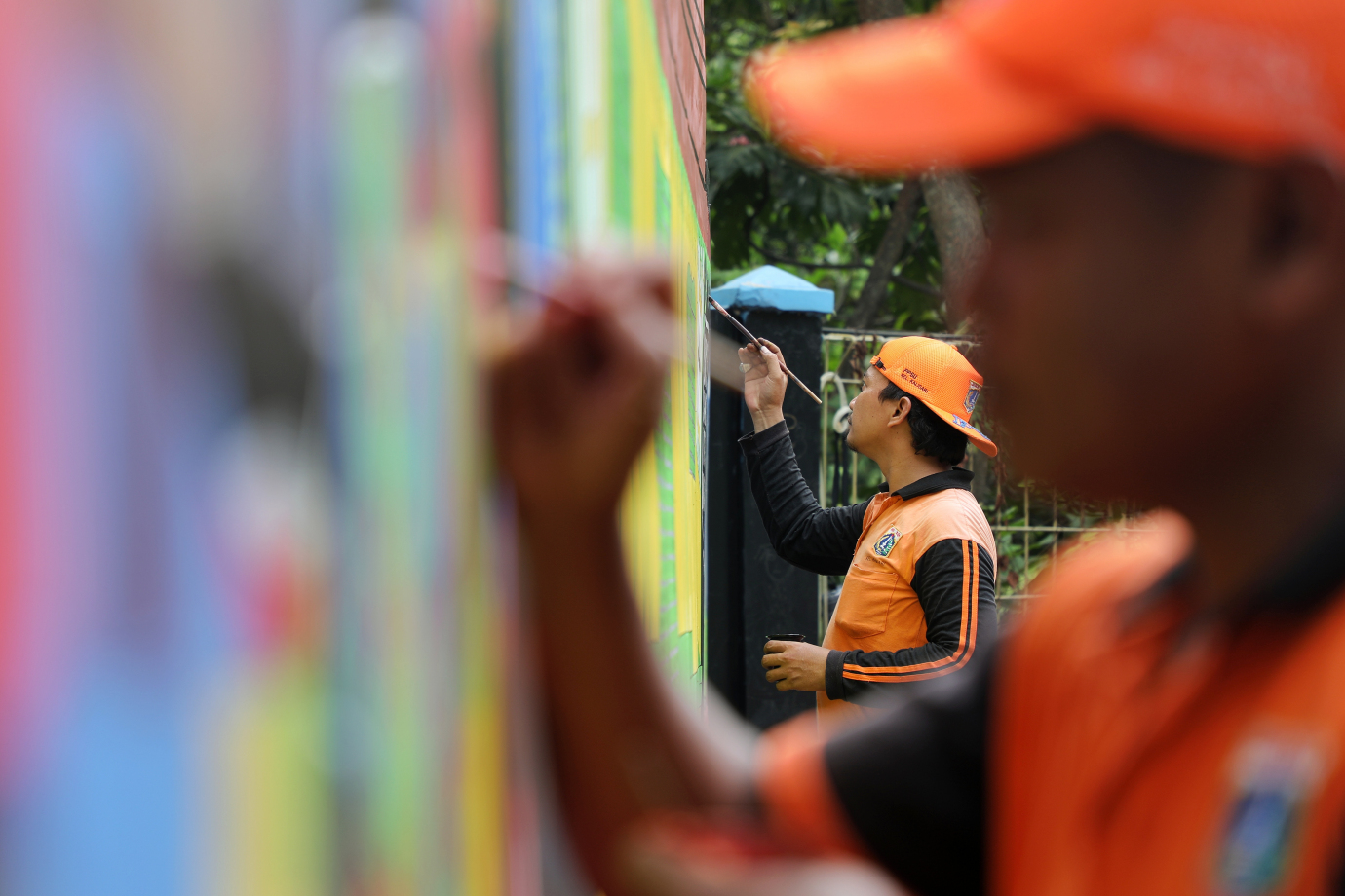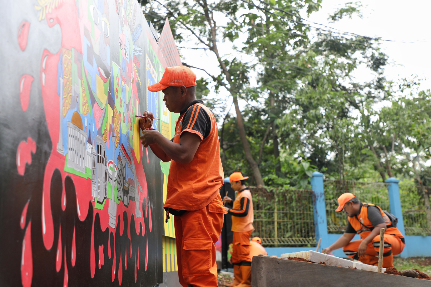 Sejumlah petugas PPSU Kelurahan Kalisari sedang menyelesaikan penataan kawasan unggulan triwulan IV di Jalan RA Fadillah RT 02/04 Kalisari, Pasar Rebo, Jakarta Timur, Jumat (15/11).