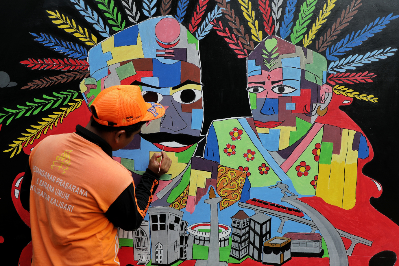 Lahan tidur milik Markas Pusat Perhubungan Angkatan Darat (Mapushubad) ini dibuat jadi taman berukuran 5x1,5 meter persegi berhiaskan mural bertema rumah adat Betawi lengkap dengan ornamen Gigi Balang berwarna kuning dan hijau.