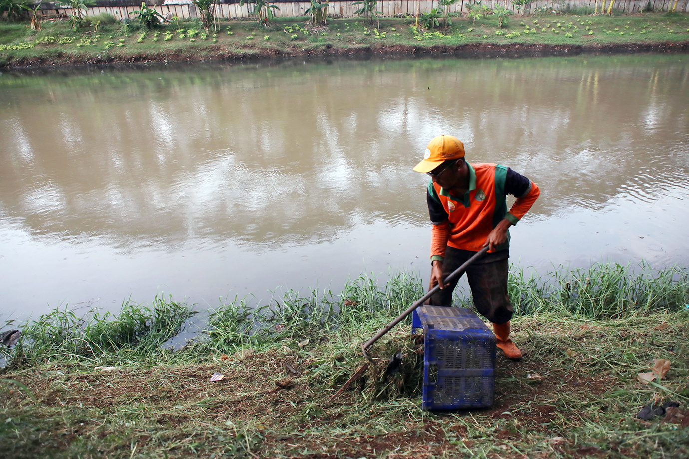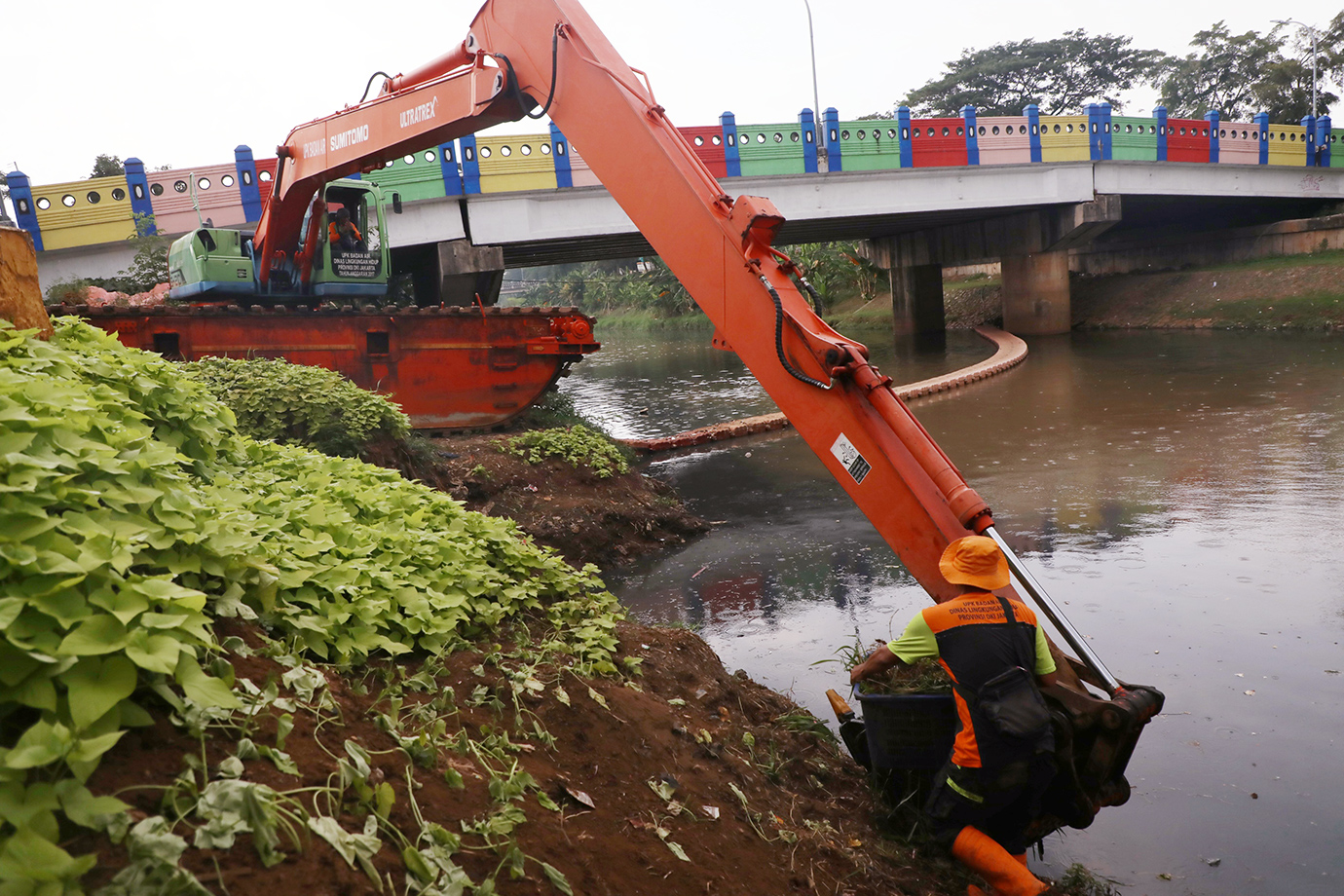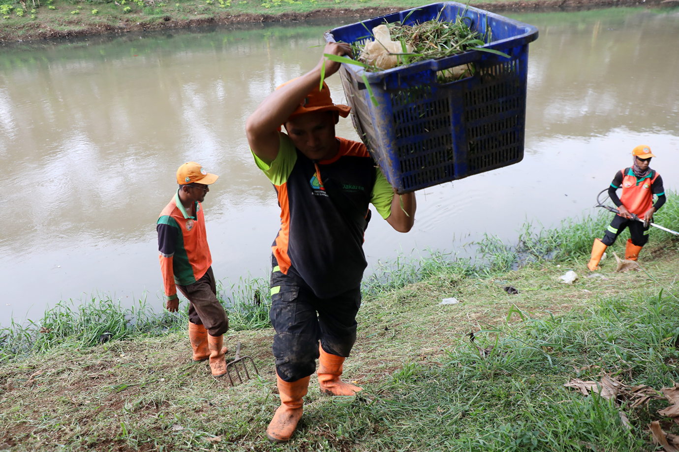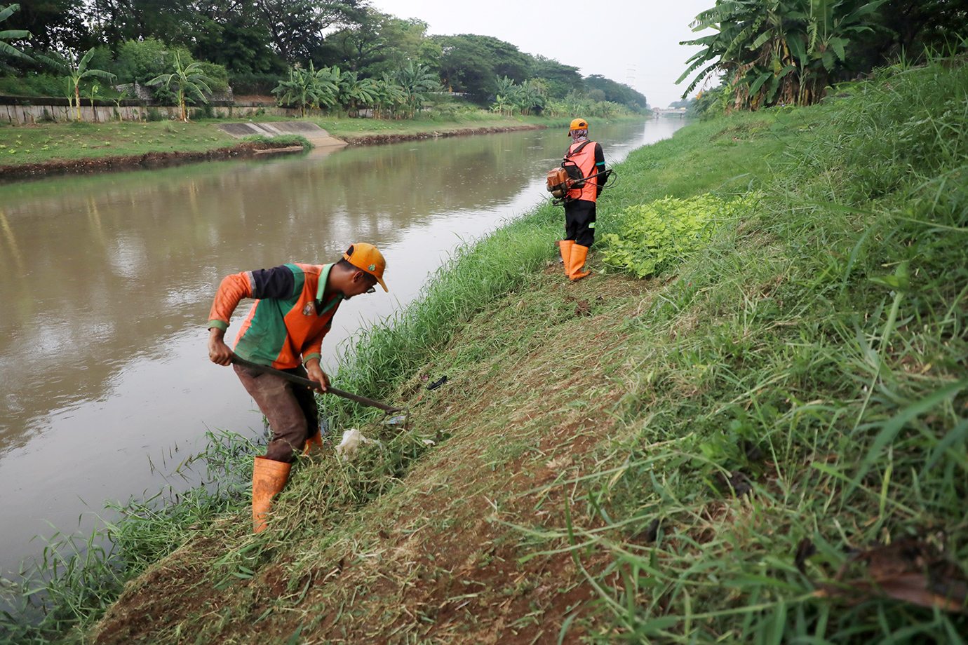 Unit Penanganan Sampah (UPS) Badan Air Dinas Lingkungan Hidup (LH) DKI Jakarta melakukan pembersihan rumput liar di bantaran Kanal Banjir Timur (KBT), Jalan Cipinang Indah, Pondok Bambu, Duren Sawit, Jakarta Timur, Selasa (19/11). Kegiatan ini rutin dilakukan untuk menjaga kebersihan dan keindahan di kawasan KBT.