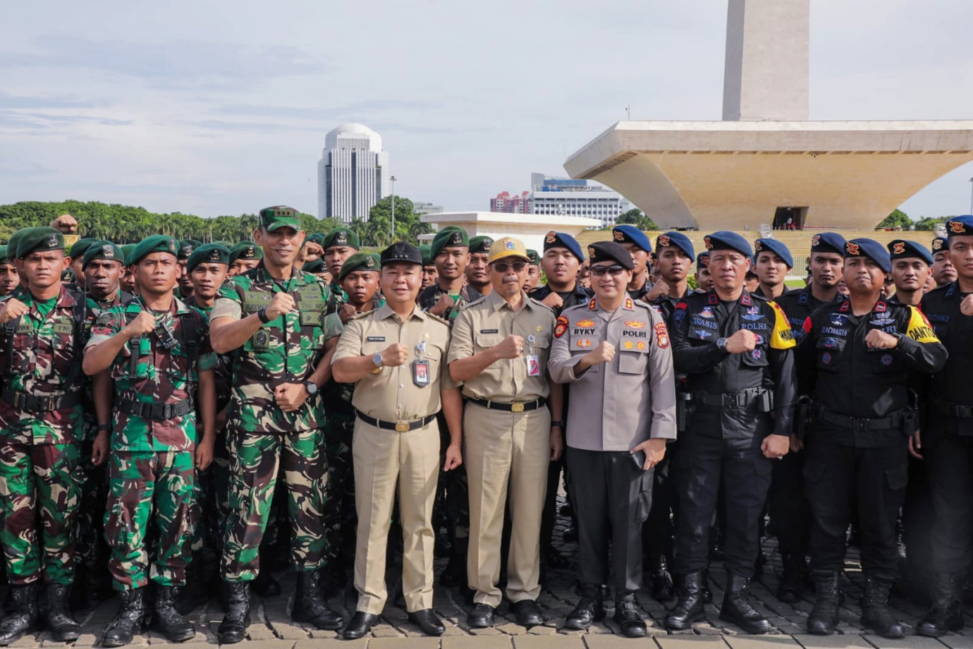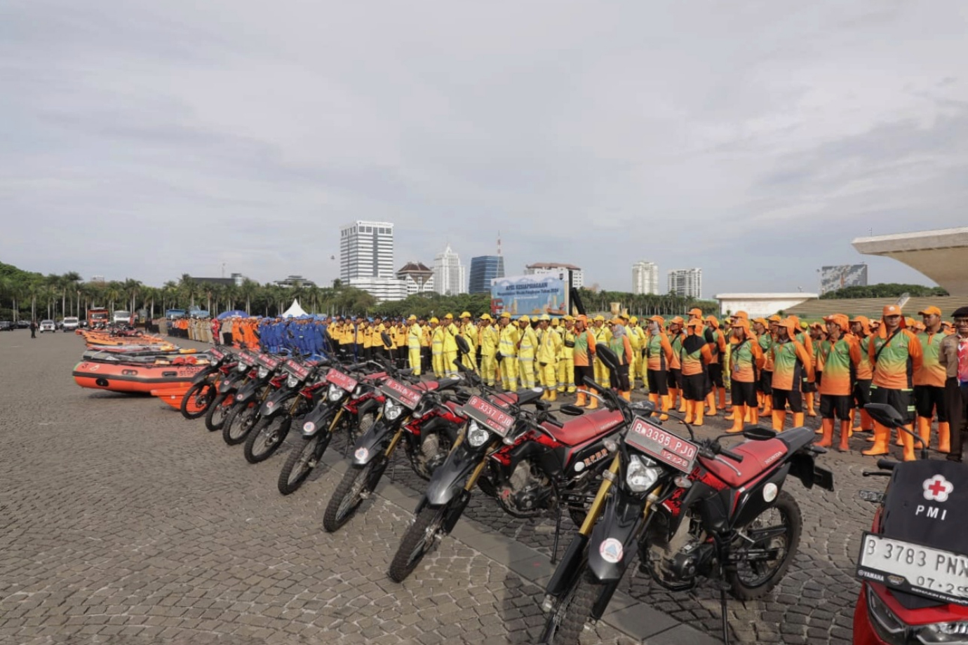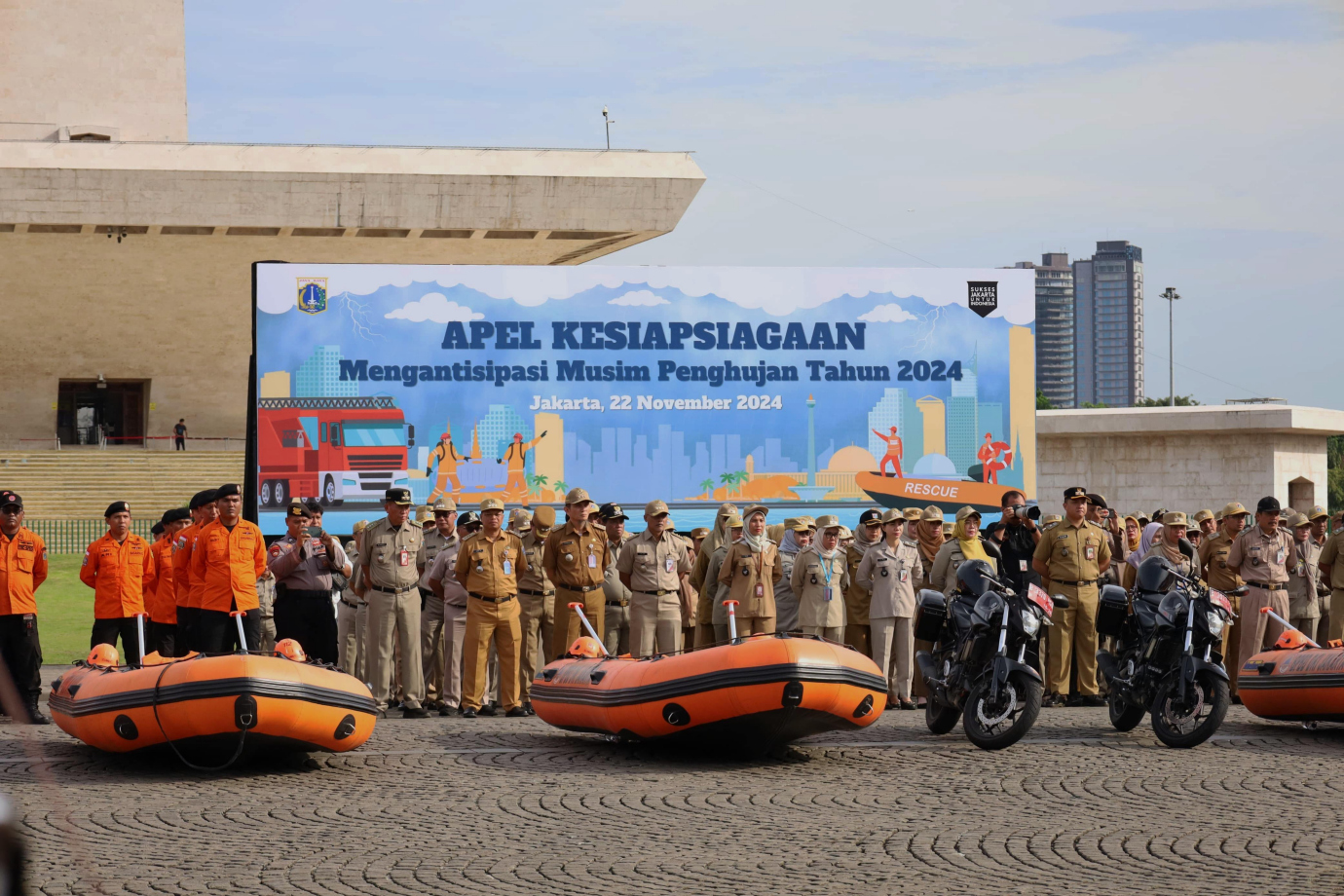 Pemerintah Provinsi (Pemprov) DKI Jakarta menggelar Apel Kesiapsiagaan mengantisipasi musim penghujan 2024-2025 yang diikuti 1.897 personel gabungan serta sarana dan prasarana penanggulangan banjir di sisi Selatan Monumen Nasional (Monas), Gambir, Jakarta Pusat, Jumat (22/11). Dalam kegiatan ini Penjabat (Pj) Gubernur DKI Jakarta, Teguh Setyabudi bertindak sebagai pembina apel dan memberikan arahan perlunya langkah antisipasi dan meneruskan upaya yang telah dilakukan dalam menghadapi musim penghujan dikarenakan intensitas curah hujan di Jakarta diprediksi meningkat cukup signifikan dengan potensi hujan lebat disertai angin kencang.