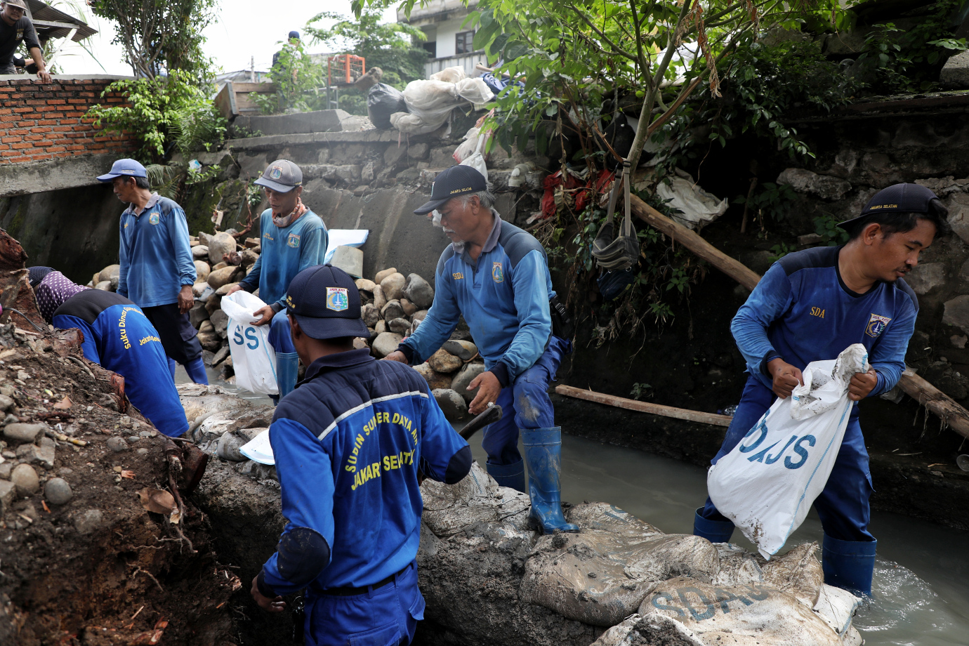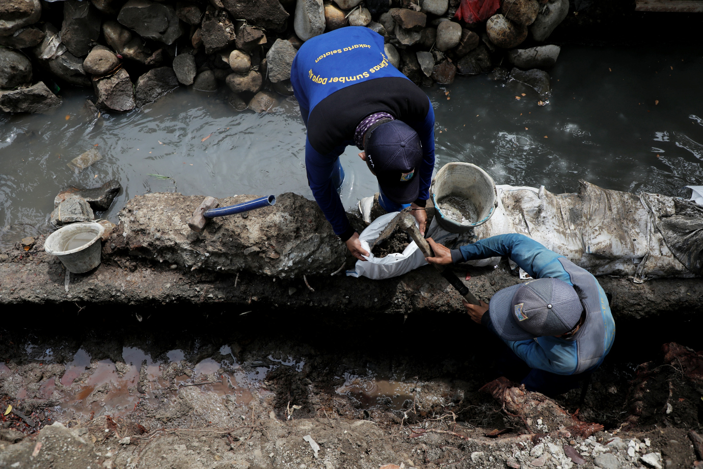 Sejumlah Satgas SDA Kecamatan Tebet melakukan perbaikan turap saluran Phb Sawo Kecik di Jalan Tebet Timur Dalam XI, Tebet, Jakarta Selatan, Senin (25/11). Perbaikan turap yang sudah berlangsung selama dua minggu ini ditargetkan rampung pada akhir Desember mendatang.