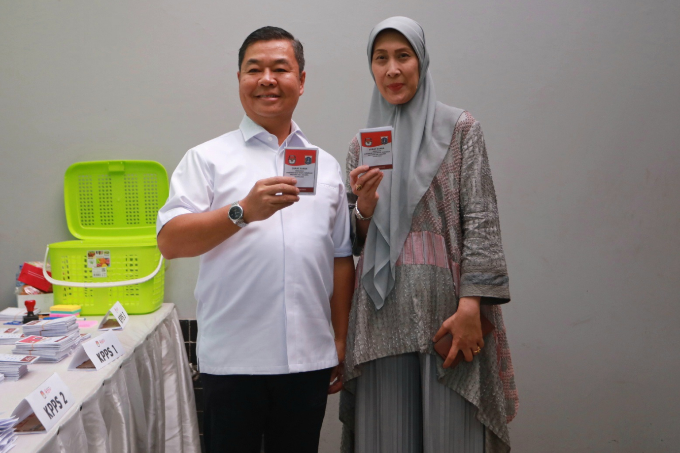 Penjabat (Pj) Gubernur DKI Jakarta, Teguh Setyabudi bersama (Pj) KetuaTim Penggerak (TP) PKK DKI Jakarta, Ika Octaviana melakukan pencoblosan Pemilihan Gubernur dan Wakil Gubernur DKI Jakarta 2024 di TPS 031 Cempaka Timur, Cempaka Putih, Jakarta Pusat, Rabu (27/11). Usai melakukan pencoblosan Pj Gubernur Teguh berharap kepada seluruh masyarakat Jakarta agar tidak pasif dan memberikan hak suaranya pada Pilkada DKI Jakarta untuk kemajuan Kota Jakarta yang lebih baik.