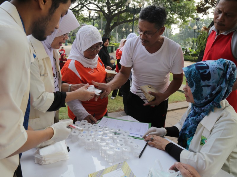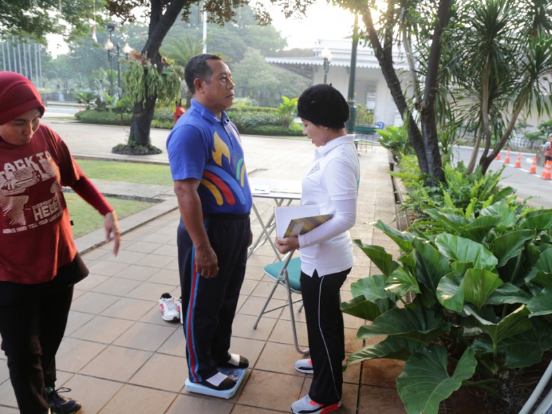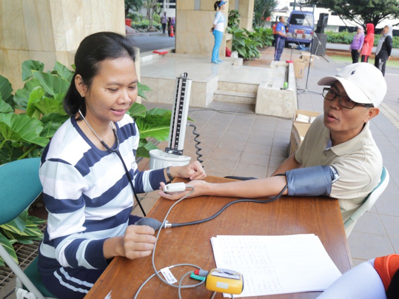 Jajaran Pusat Pelayanan Kesehatan Pegawai (PPKP) Provinsi DKI Jakarta mengelar kegiatan senam bersama di Balai Kota DKI Jakarta, Jumat (11/9/2015). Selain menyehatkan, kegiatan ini tentu sangat berguna untuk saling mempererat silaturahmi antar aparatur di Pemprov DKI Jakarta. Dalam kegiatan tersebut juga dilakukan pemeriksaan kesehatan dasar tanpa dipungut biaya. (Foto: Reza/beritajakarta.com)