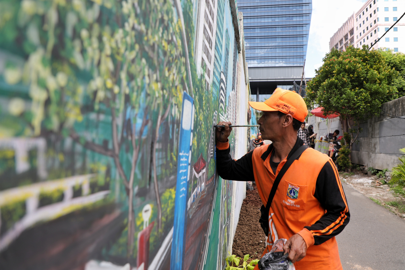 Sejumlah petugas PPSU Kelurahan Setiabudi sedang menyelesaikan pembuatan mural di Jalan Setia Budi Barat, Setiabudi, Jakarta Selatan, Senin (23/12). Pembuatan mural dengan tema kebudayaan dan perkotaan Jakarta ini dalan rangka penataan kawasan unggulan triwulan empat.