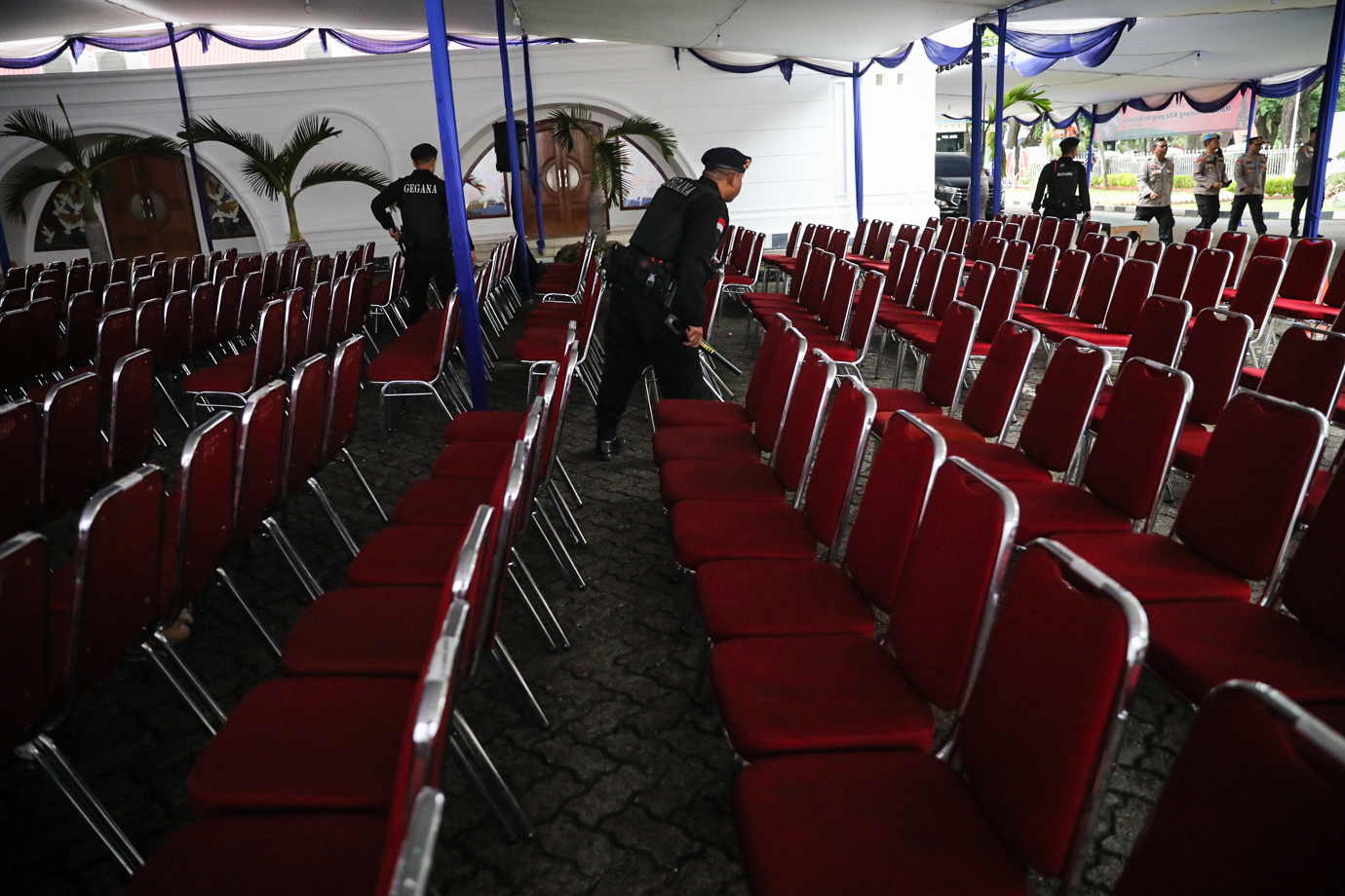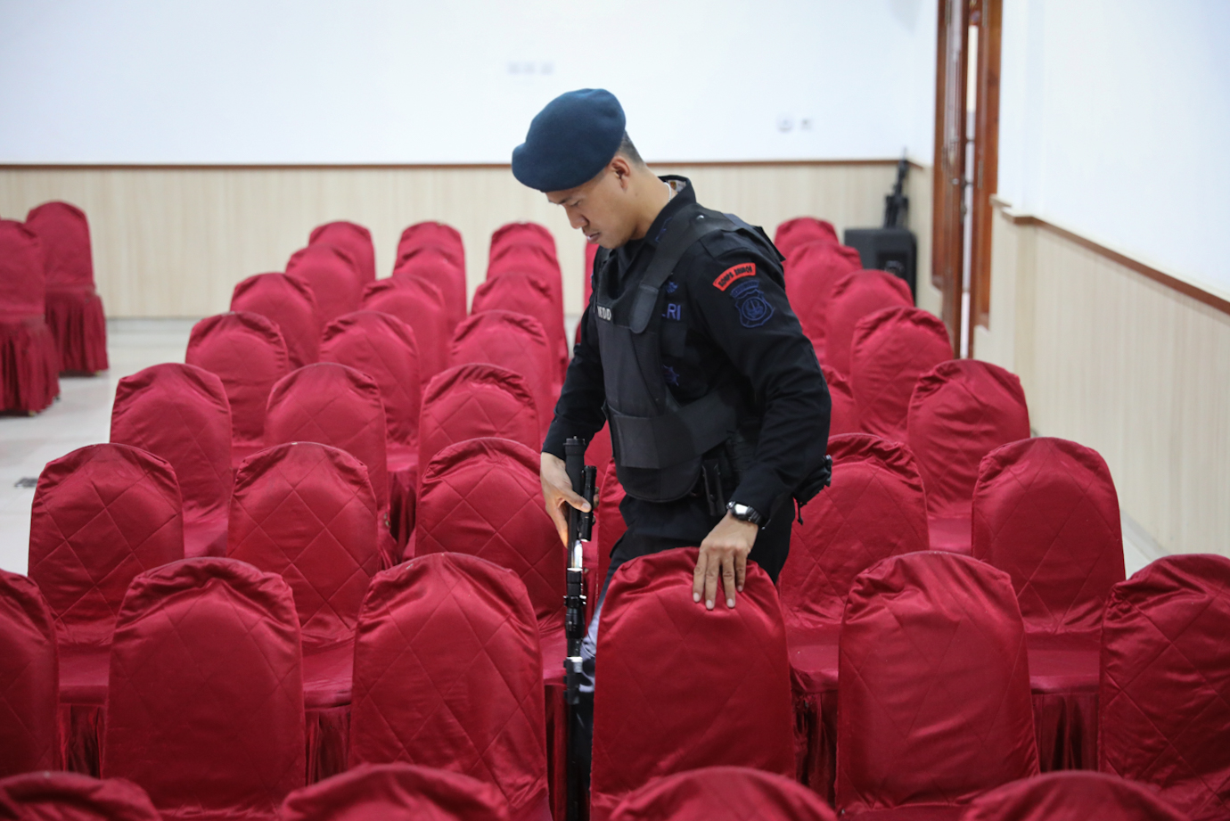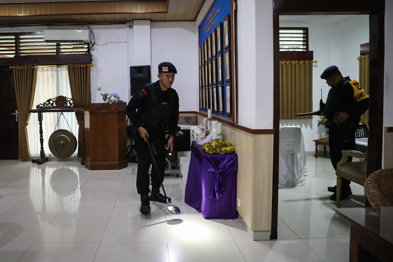 Tim Gegana Brimob Polri melakukan pengecekan dan sterilisasi di Gereja Kristen Protestan Oikoumene (GKPO), Halim Perdana Kusumah, Makasar, Jakarta Timur, Selasa (24/12). Kegiatan tersebut untuk menjamin keamanan bagi para jemaat umat Kristiani saat melaksanakan ibadah Natal.