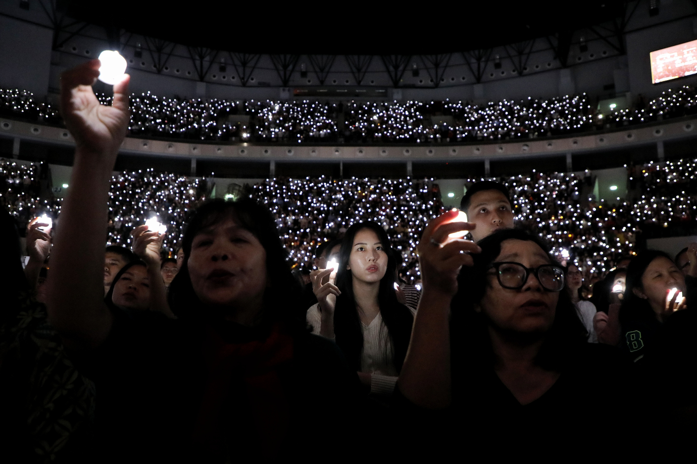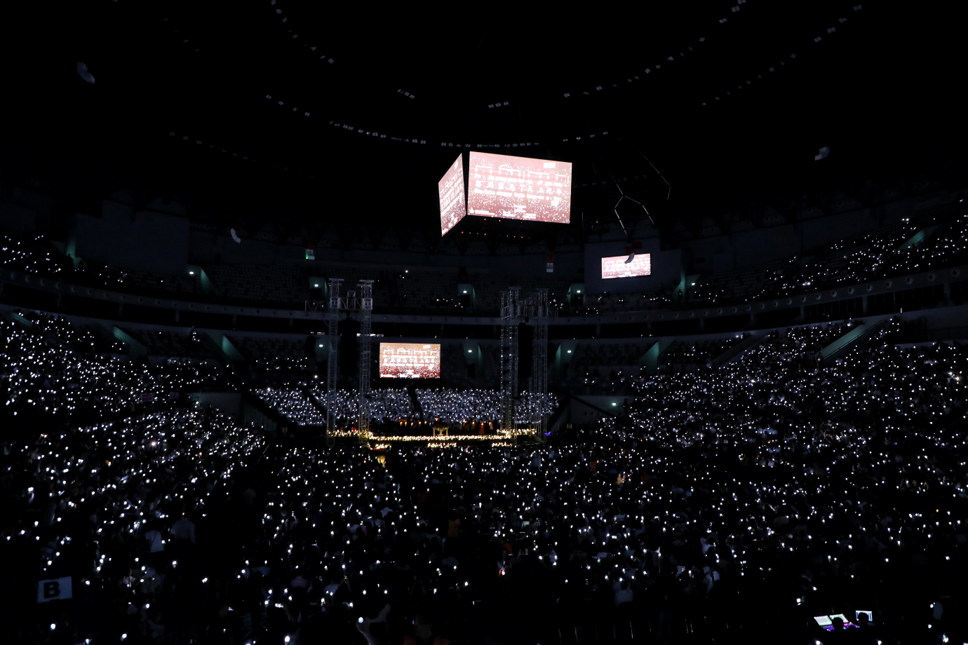 Suasana Misa Natal Akbar Jabodetabek yang digelar di Indonesia Arena, Tanah Abang, Jakarta Pusat, Selasa (24/12). Misa Akbar yang mengangkat tema “Imanuel dalam Sejarah” ini diperkirakan dihadiri 16.000 umat Kristiani.