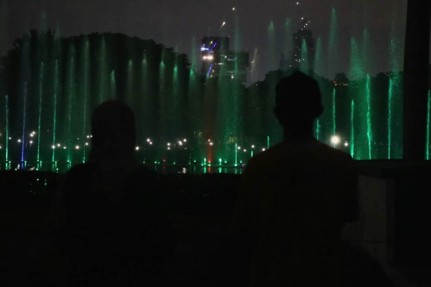 Semarak Natal 2024 Pemerintah Provinsi DKI Jakarta menggelar pertunjukan air mancur menari di Sisi Barat Monumen Nasional (Monas), Gambir, Jakarta Pusat, Rabu (25/12). Pertunjukan air mancur menari ini digelar dari tanggal 25 hingga 27 Desember 2024 dibagi dua sesi yakni 19.30 dan 20.30.