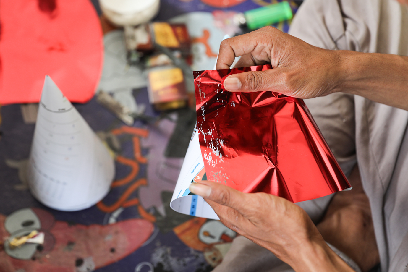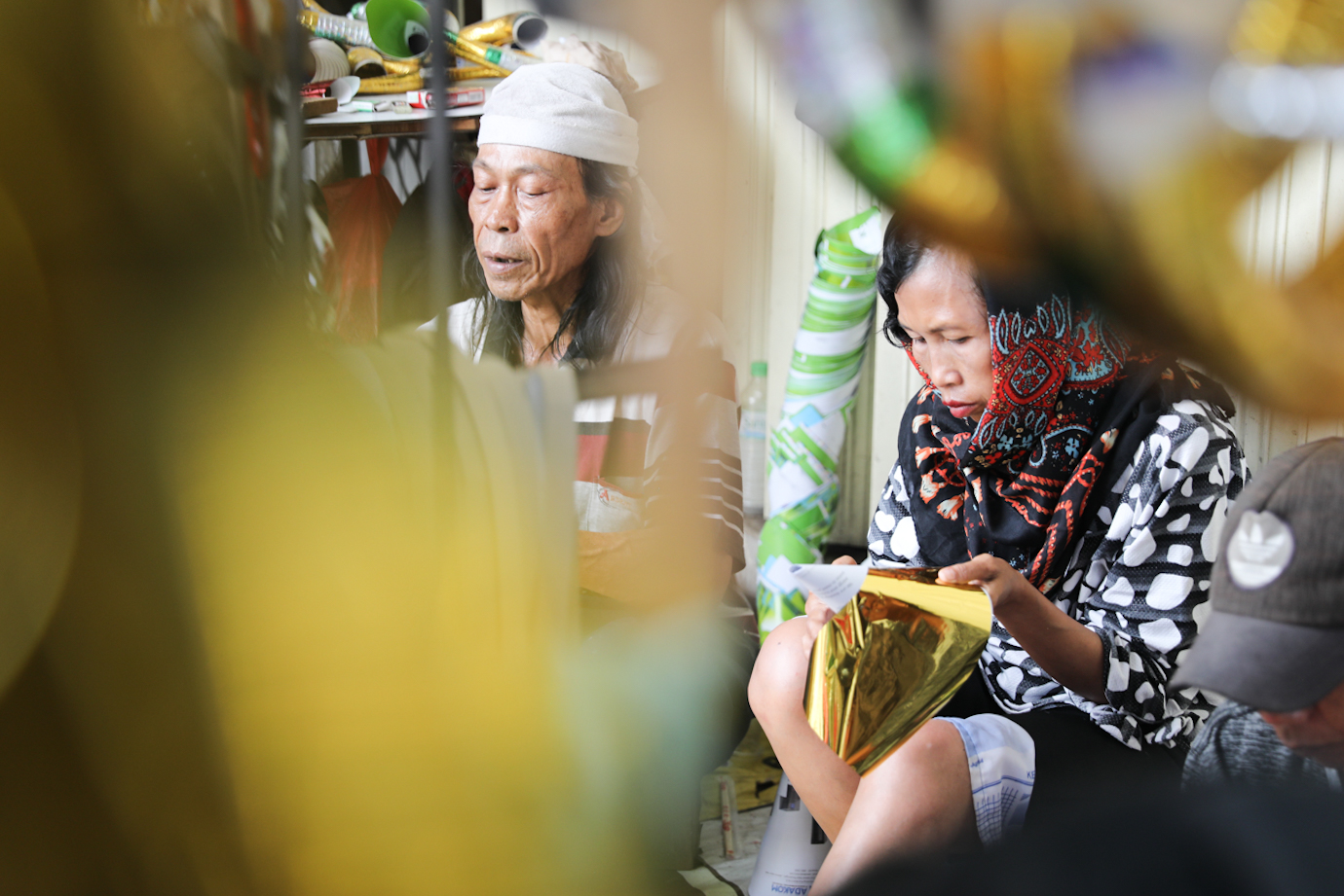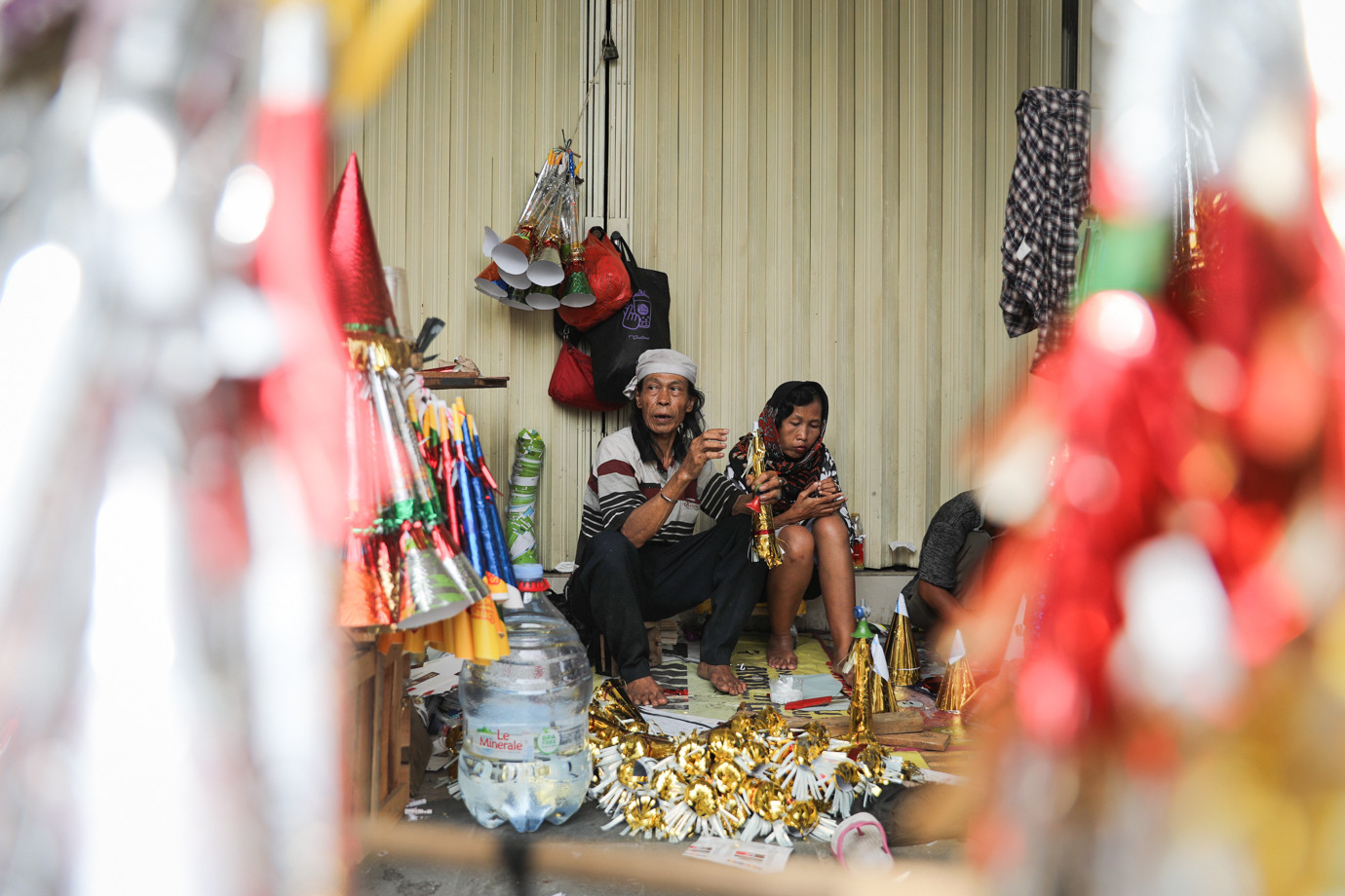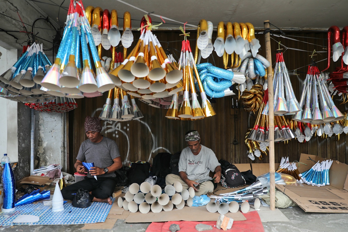 Sejumlah pedagang memproduksi sekaligus menjual terompet di Jalan Pintu Besar Selatan, Taman Sari, Jakarta Barat, Jumat (27/12). Satu buah terompet berbahan karton dan kertas warna tersebut dijual mulai dari Rp5.000 hingga Rp20.000 tergantung ukuran dan tingkat kesulitan pembuatan.