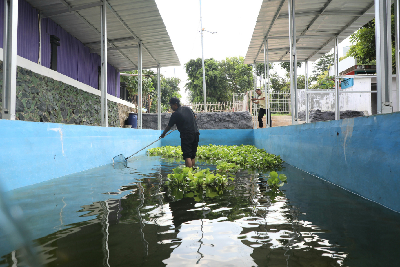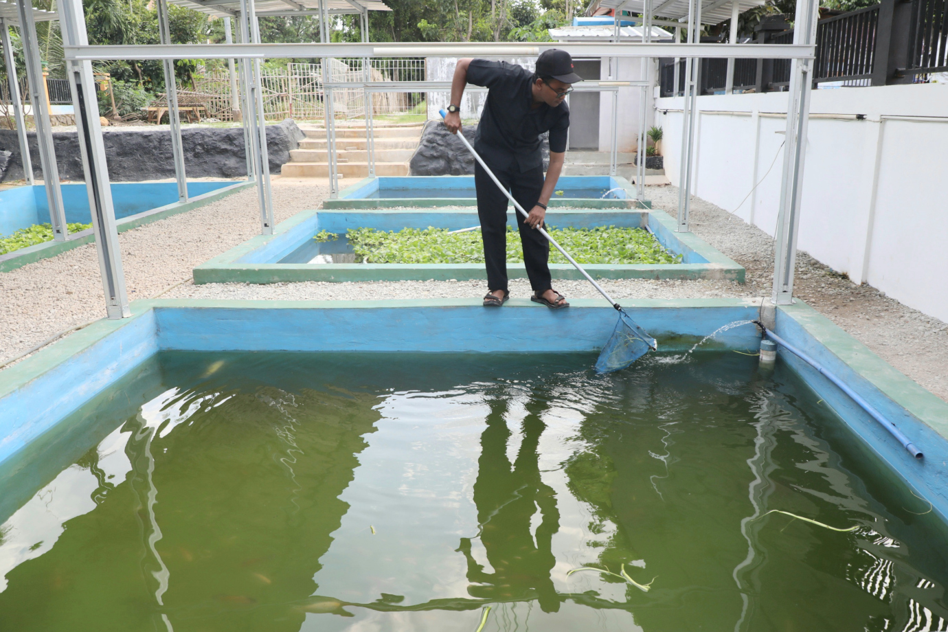 Melihat kolam gizi yang bertujuan untuk ketahanan pangan dan pencegahan stunting di Ruang Publik Terpadu Ramah Anak (RPTRA) Cipinang Besar Selatan (CBS) yang terletak di Jalan Panca Warga, Jatinegara, Jakarta Timur, Jumat (27/12). Kolam gizi yang berdiri sejak Agustus 2024 dengan diisi dengan berbagai ikan yakni mujaer, nila, lele dan bawal. Dalam sekali panen kolam gizi ini dapat menghasilkan 30 kilogram dan hasil panennya diberikan kepada warga sekitar untuk program ketahanan pangan serta penanganan stunting di Kelurahan Cipinang Besar Selatan.