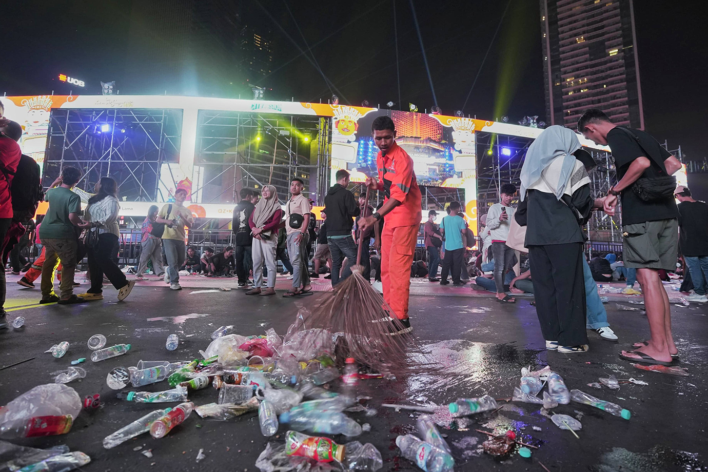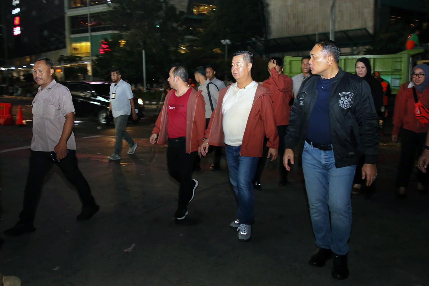 Penjabat (Pj) Gubernur DKI Jakarta, Teguh Setyabudi meninjau langsung proses pembersihan sampah sisa acara Semarak Jakarta Mendunia di kawasan Jalan MH Thamrin-Bundaran HI, Jakarta Pusat, Rabu (1/1).