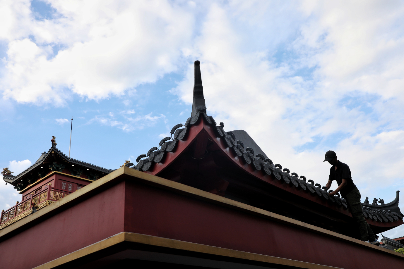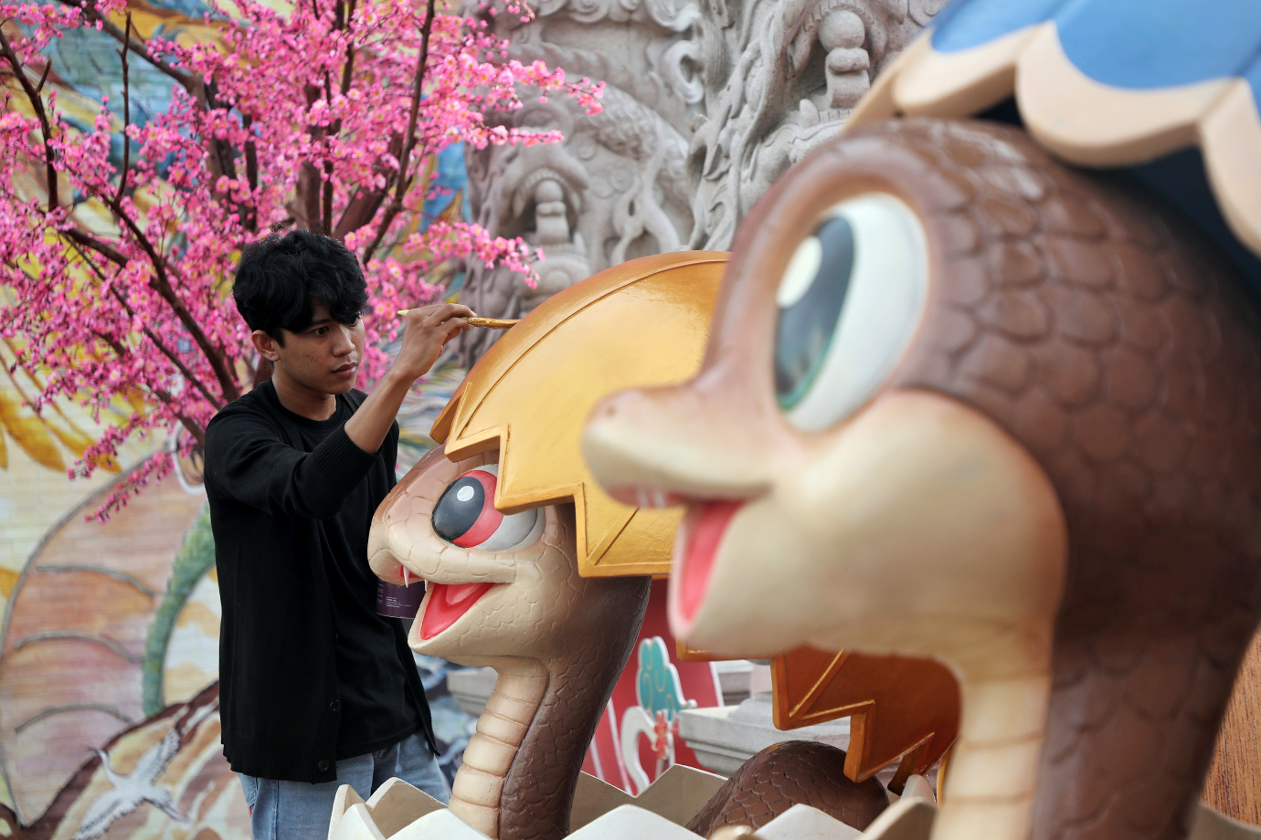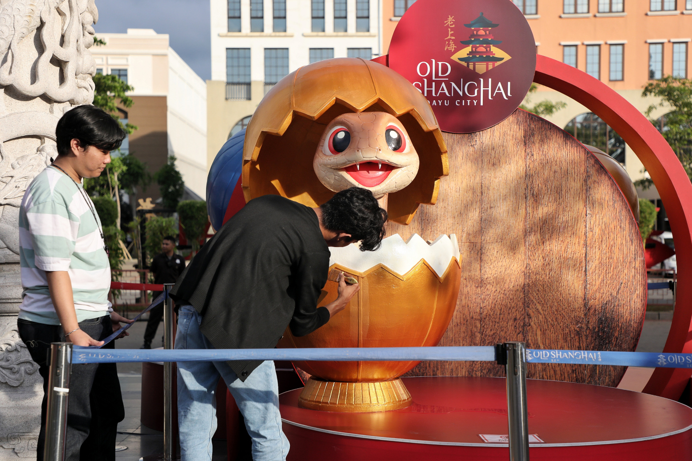 Sejumlah petugas melakukan persiapan untuk menyambut Tahun Baru Imlek 2576 Kongzili di Old Shanghai, Cakung, Jakarta Timur. Persiapan yang dilakukan berupa dekorasi gapura, pembuatan ikon tahun ular, pemasangan lampion serta perawatan lainnya dalam rangka memeriahkan datangnya Tahun Baru Imlek. #imlek2025