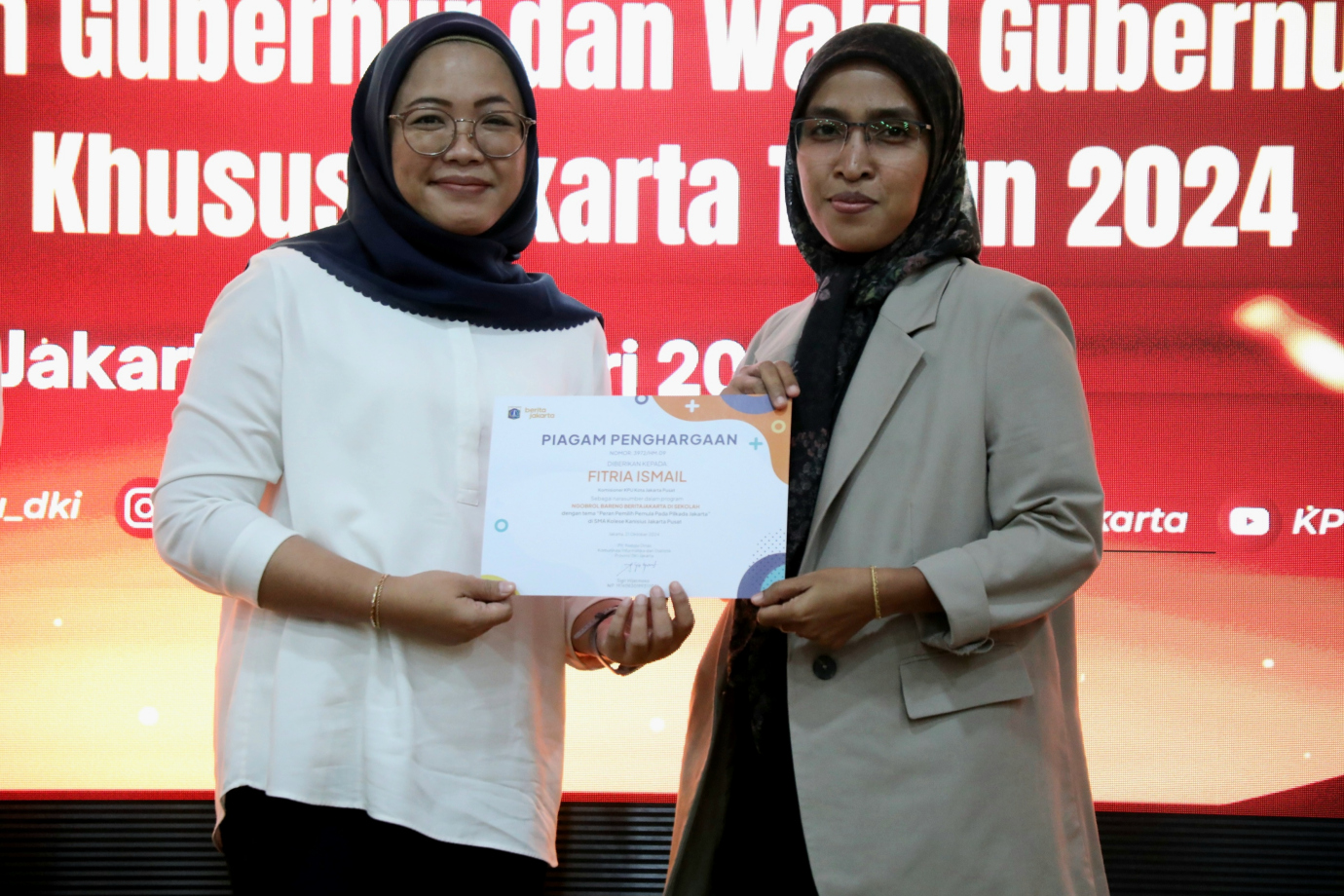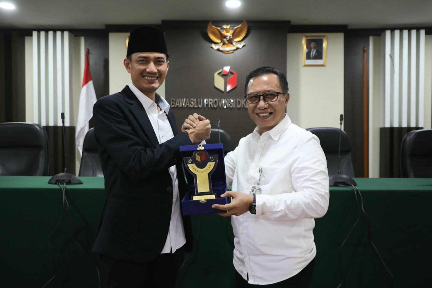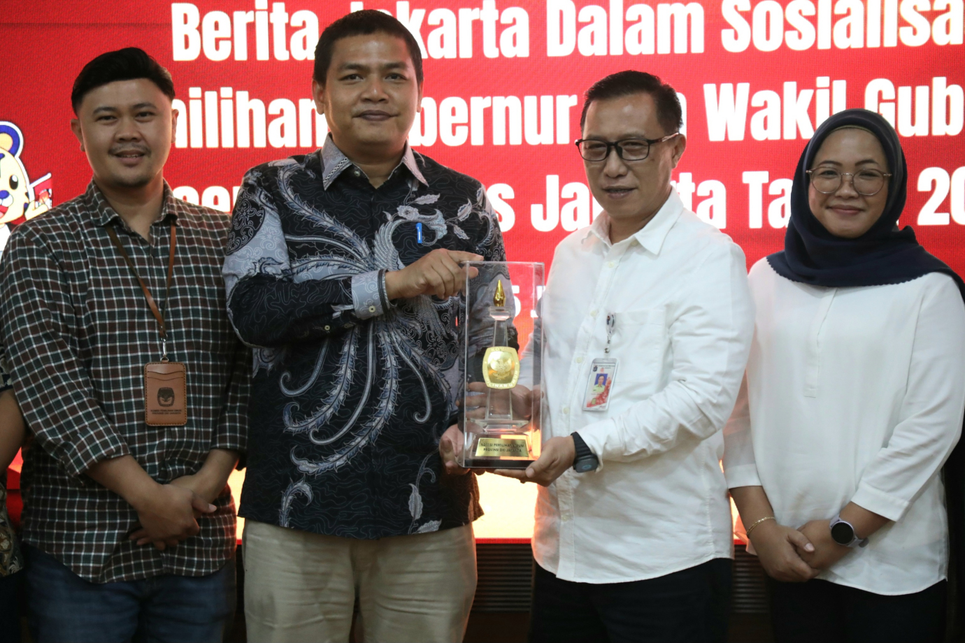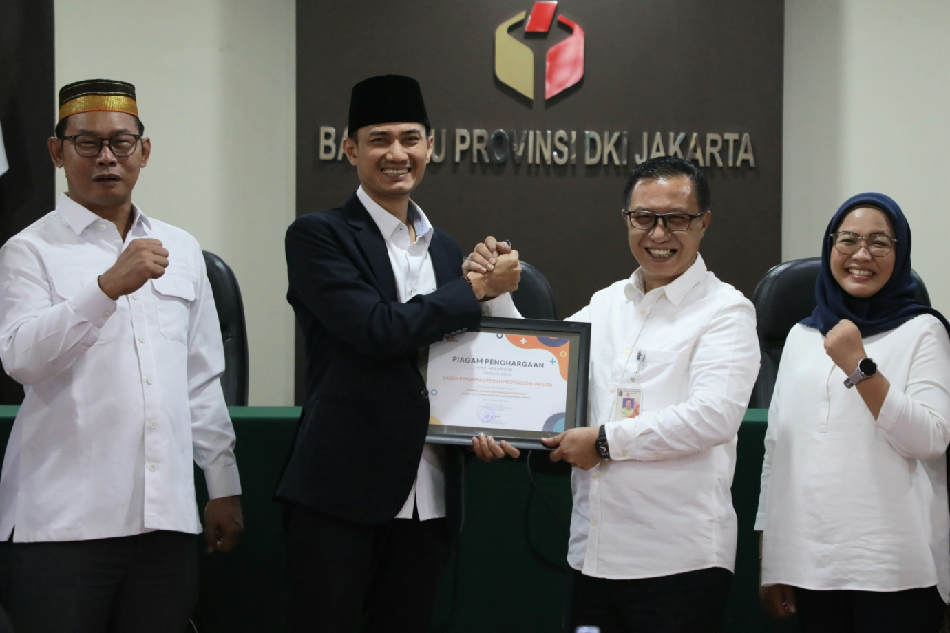 Pemerintah Provinsi (Pemprov) DKI Jakarta melalui Dinas Komunikasi, Informatika dan Statistik (Kominfotik) menyerahkan piagam penghargaan atas kerjasama sosialisasi penyelenggaraan Pilkada DKI Jakarta 2024 kepada Bawaslu dan KPU Provinsi DKI Jakarta, Rabu (15/1). Penghargaan diserahkan langsung oleh Kepala Bidang Informasi Publik Diskominfotik DKI Jakarta, Raides Aryanto dan Ketua Sub Kelompok Informasi Publik, Dhini Gilang Prasasti.