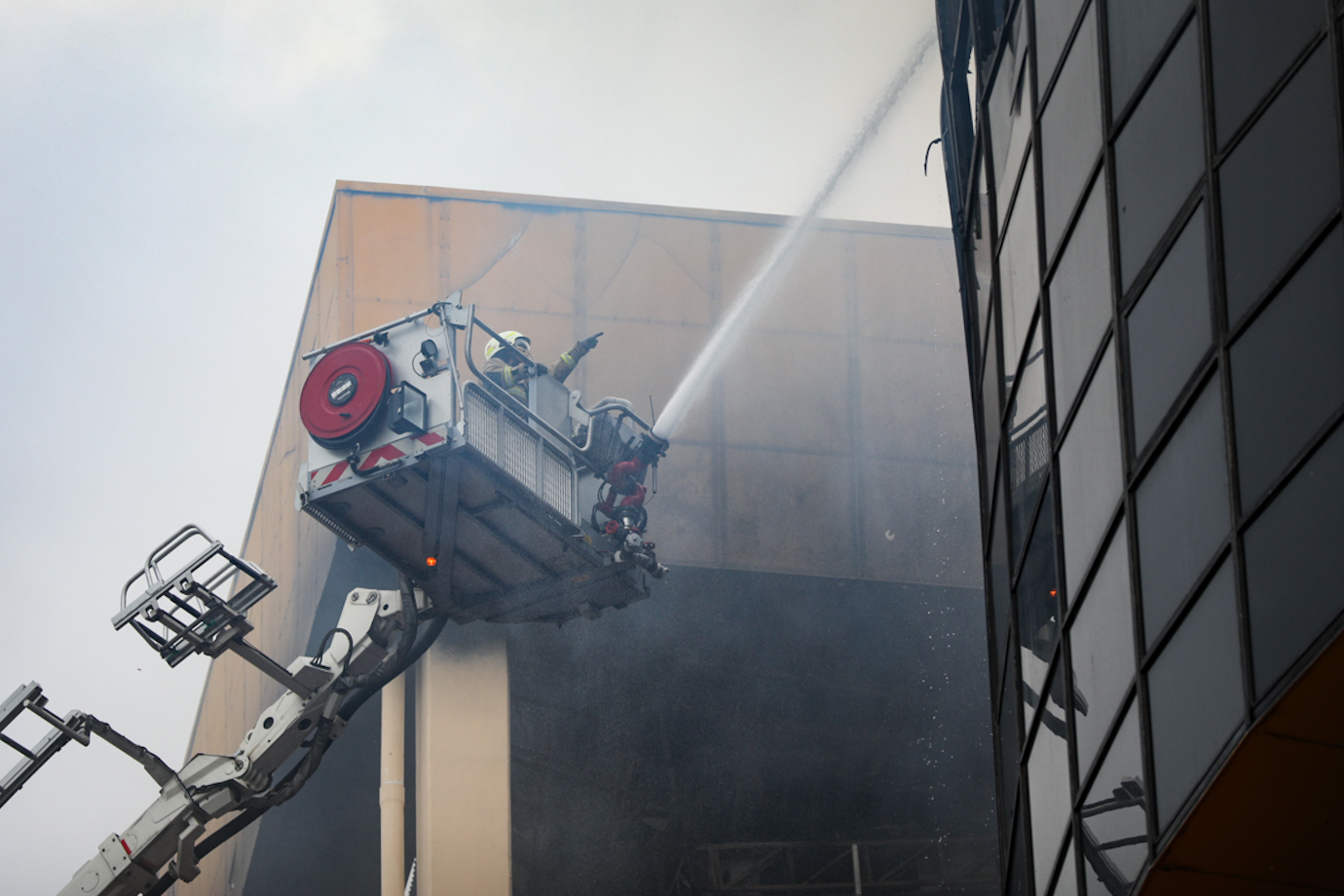 Petugas Dinas Penanggulangan Kebakaran dan Penyelamatan (Gulkarmat) DKI Jakarta melakukan pendinginan kebakaran Glodok Plaza di Jalan Mangga Besar 2, Taman Sari, Jakarta Barat, Kamis (16/1). Sebanyak 45 unit mobil pemadam dikerahkan untuk mencegah munculnya api baru sisa kebakaran yang terjadi pada Rabu (15/1) malam hingga Kamis pagi.