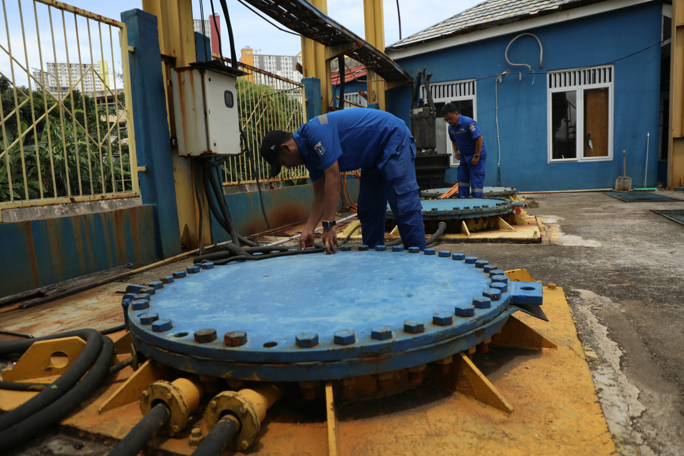 Memasuki musim penghujan Suku Dinas Sumber Daya Air (Sudin SDA) Jakarta Pusat menyiagakan Gedung Pompa Pompa Kali Item Kemayoran di Jalan Serdang Baru VI, Serdang, Kemayoran, Jakarta Pusat, Jumat (17/1). Gedung pompa ini memiliki empat pompa dengan kapasitas 2.000 liter per detik yang dapat meminimalisir genangan air di wilayah Kelurahan Serdang, Sumur Batu dan Cempaka Baru.