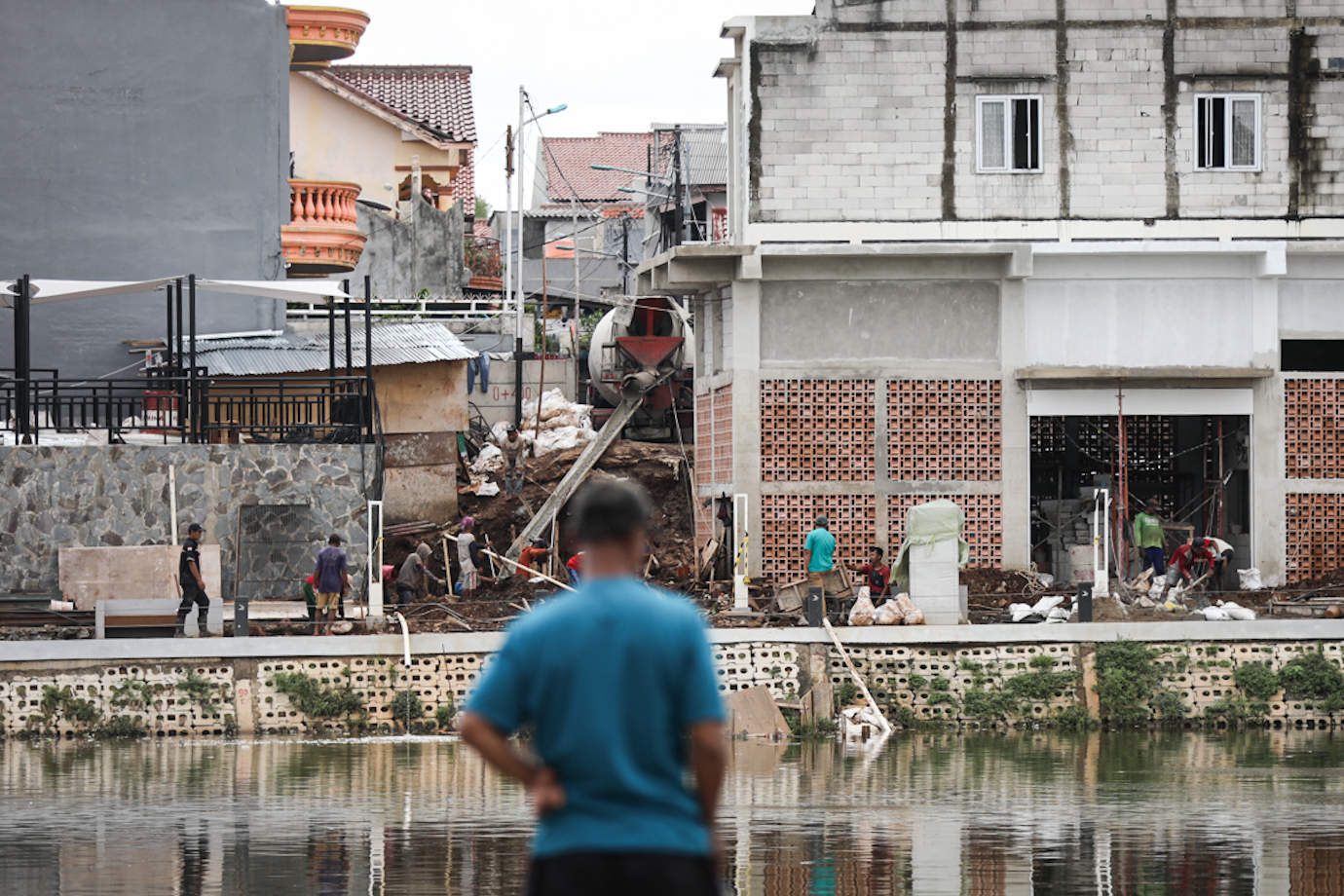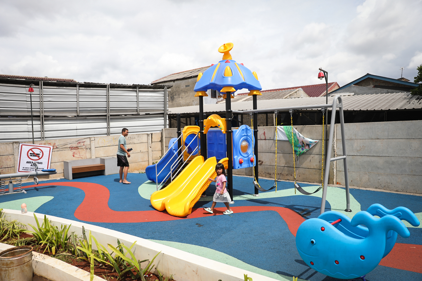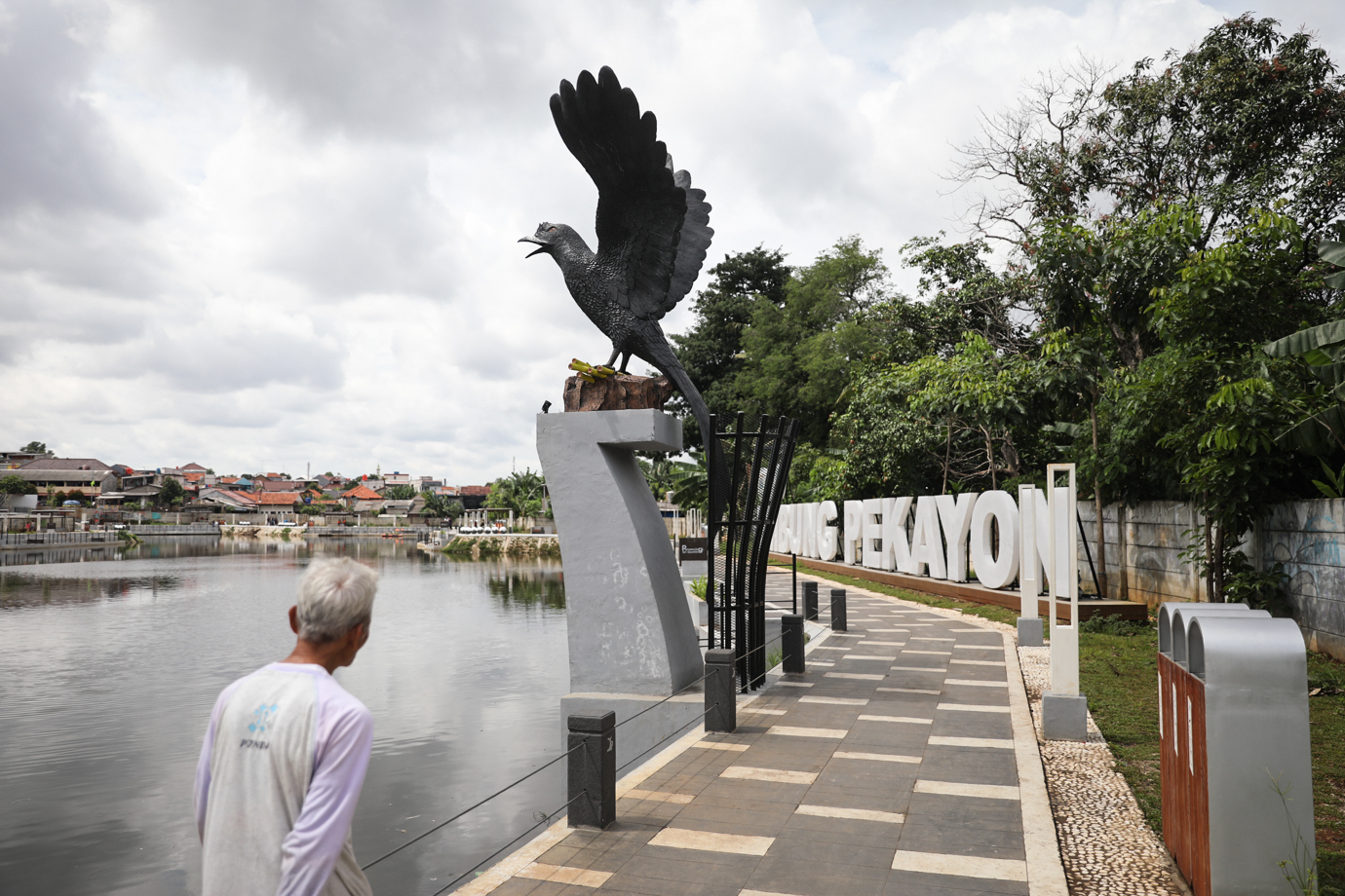 Sejumlah warga beraktivitas di dalam kawasan Embung Pekayon, Jalan Gandaria, Pasar Rebo, Jakarta Timur, Senin (20/1). Selain dibangun untuk pengendali banjir, Embung Pekayon juga dapat dimanfaatkan warga sebagai tempat interaksi publik, sarana rekreasi dan olahraga, serta area bermain anak yang ramah dan nyaman.