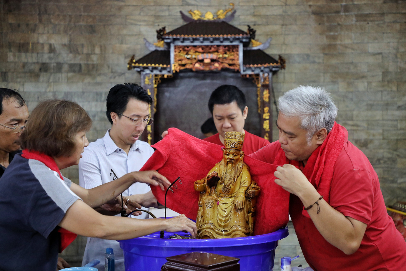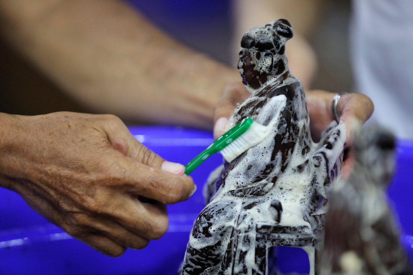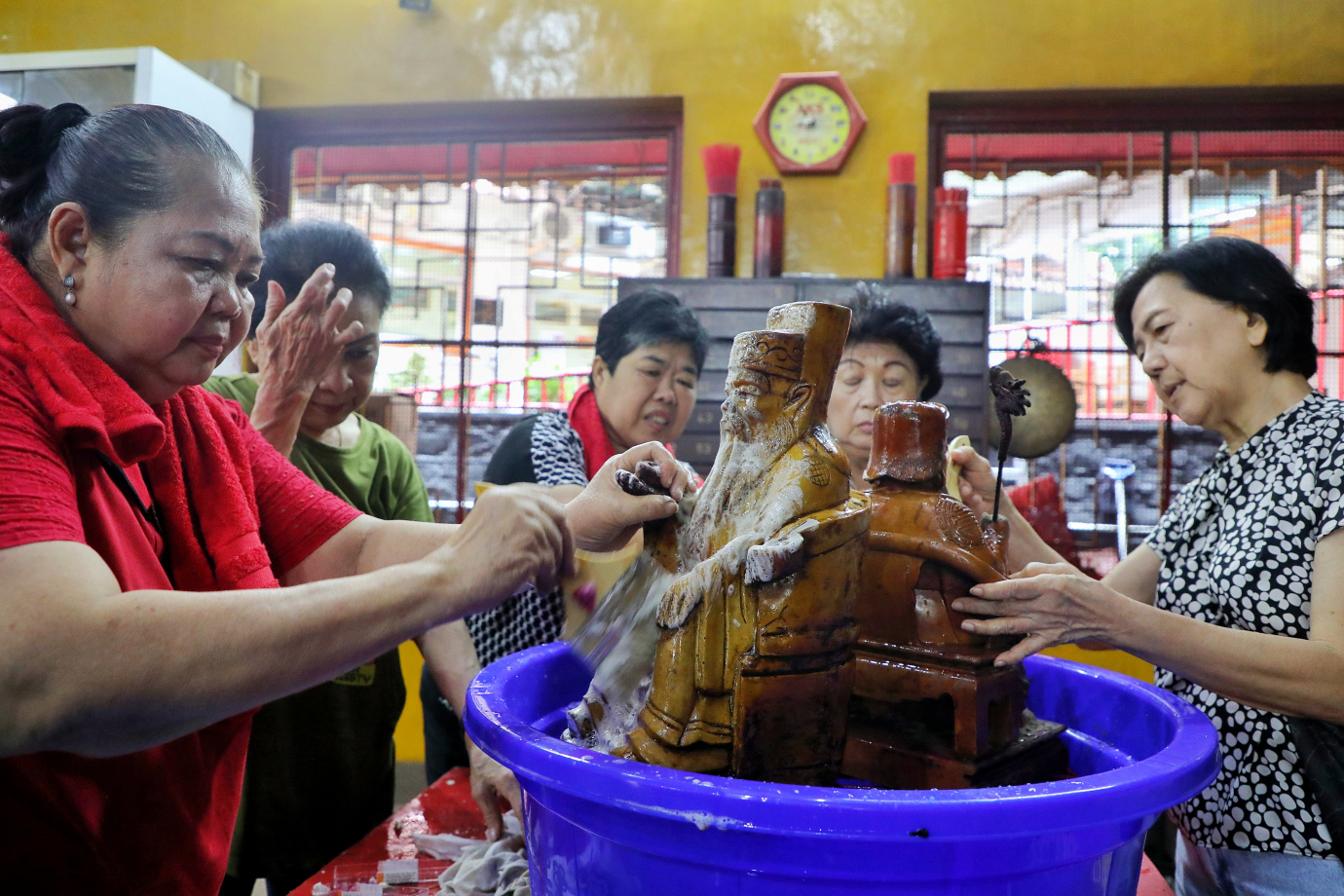 Menyambut perayaan Imlek 2576 Kongzili sejumlah warga keturunan Tionghoa membersihkan patung dewa dan sebagainya di Vihara Amurva Bhumi, Setiabudi, Jakarta Selatan, Rabu (22/1). Selain memandikan patung juga dilakukan pembersihan abu sisa pembakaran dupa, dinding dan lantai ruangan tempat sembahyang. #imlek2025