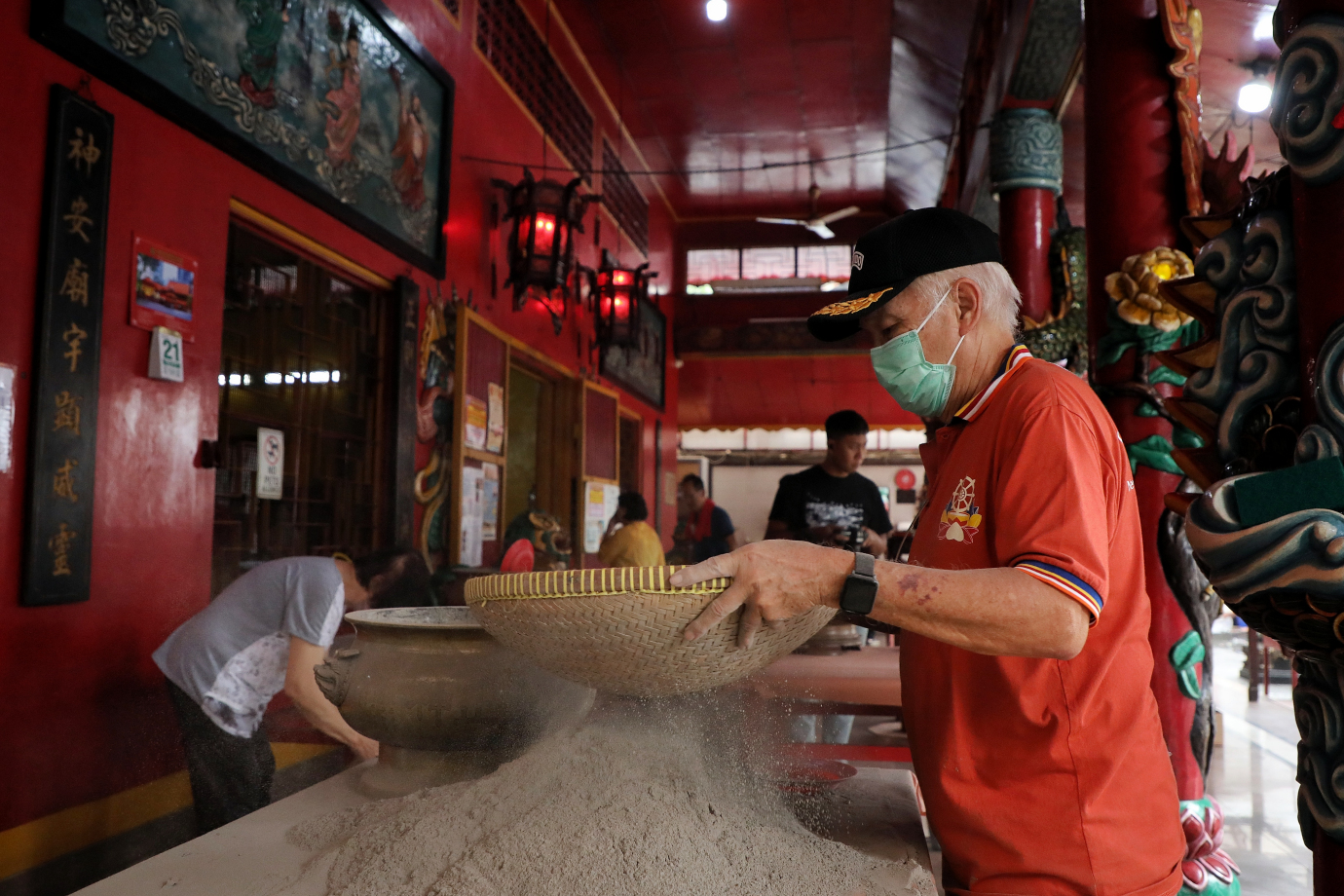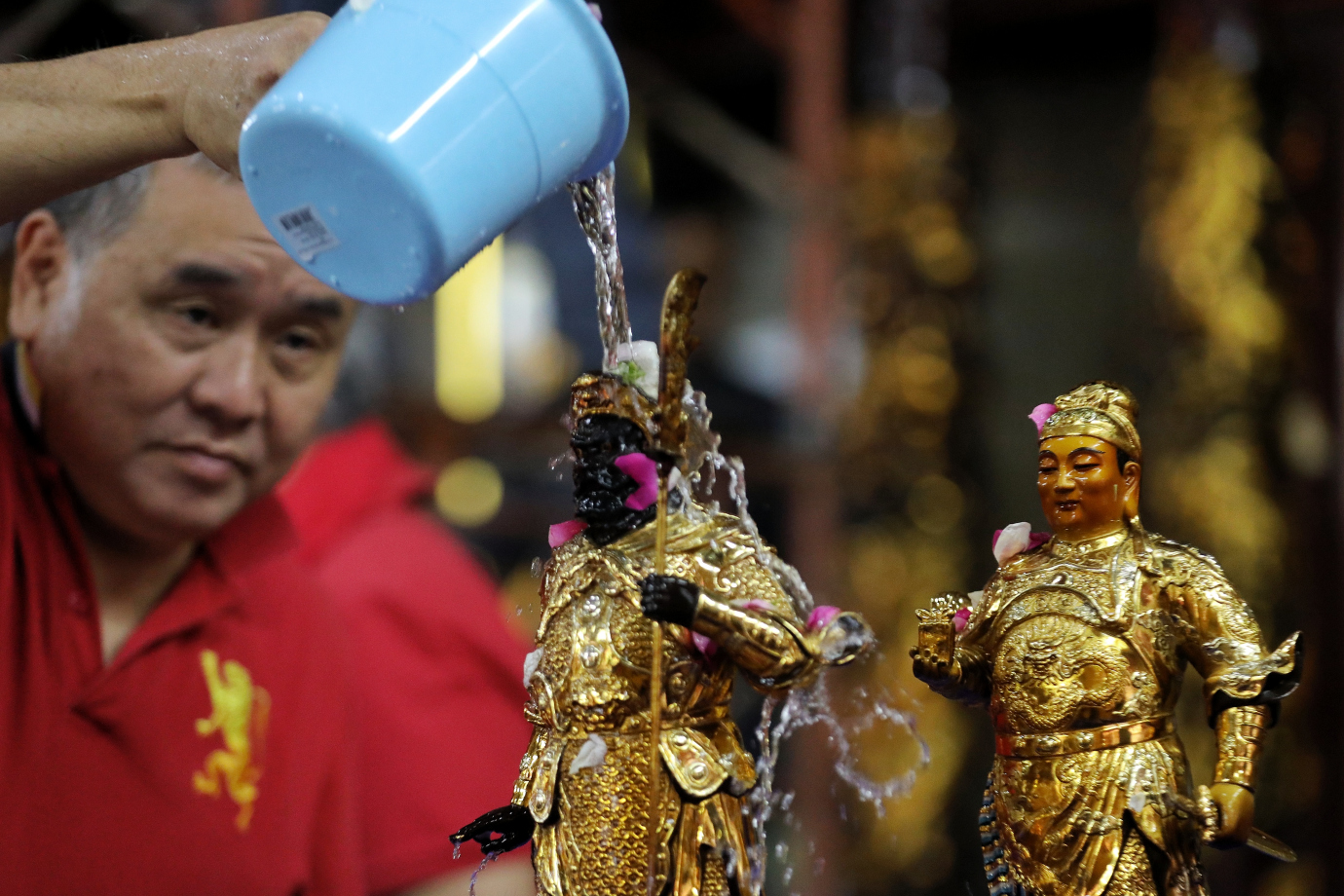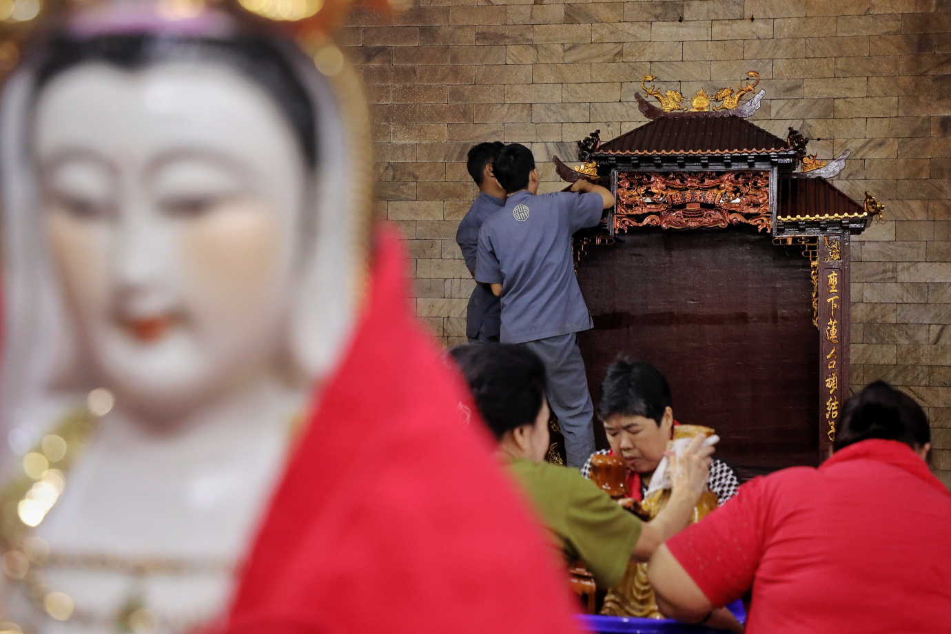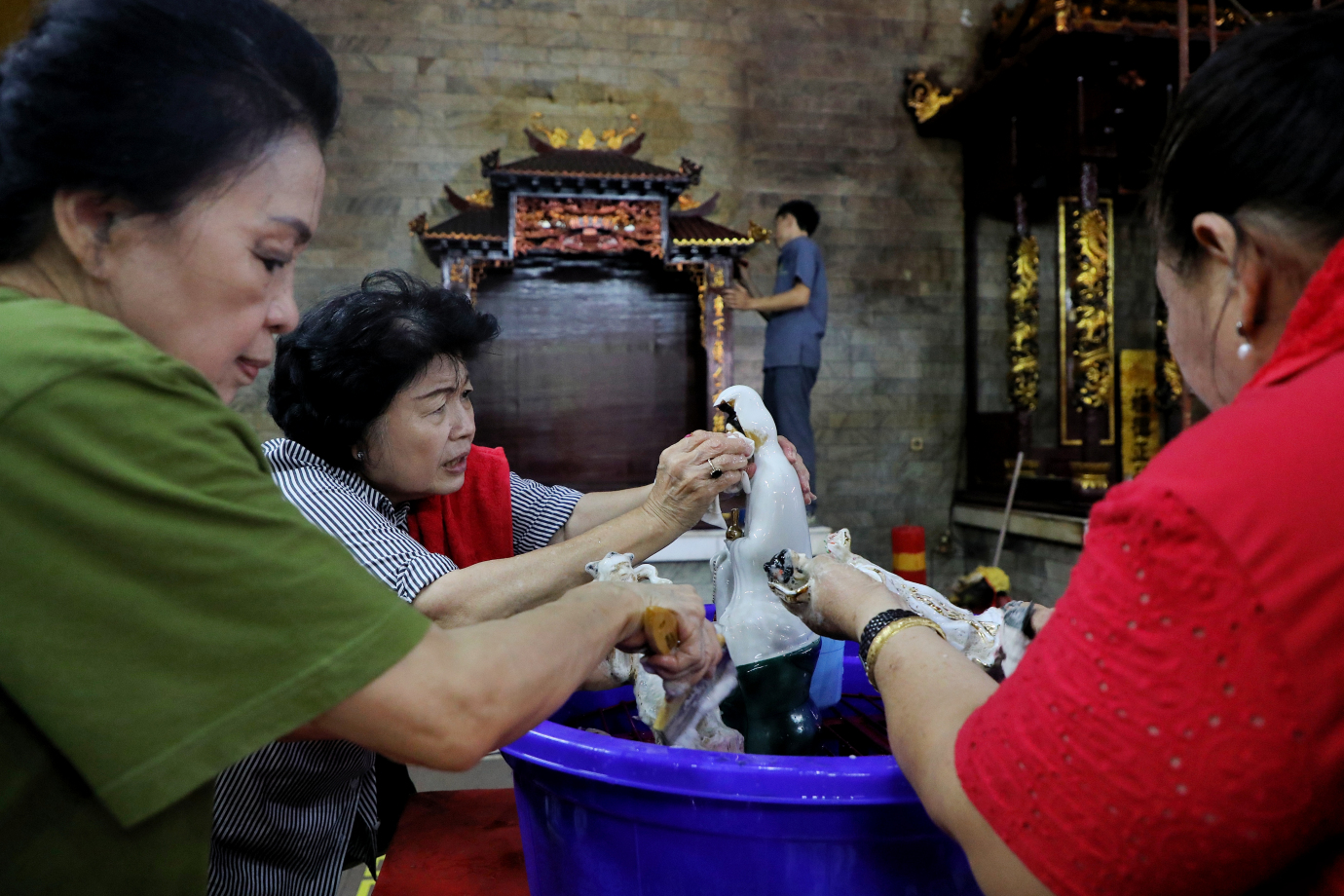 Menyambut perayaan Imlek 2576 Kongzili sejumlah warga keturunan Tionghoa membersihkan patung dewa dan sebagainya di Vihara Amurva Bhumi, Setiabudi, Jakarta Selatan, Rabu (22/1). Selain memandikan patung juga dilakukan pembersihan abu sisa pembakaran dupa, dinding dan lantai ruangan tempat sembahyang. #imlek2025