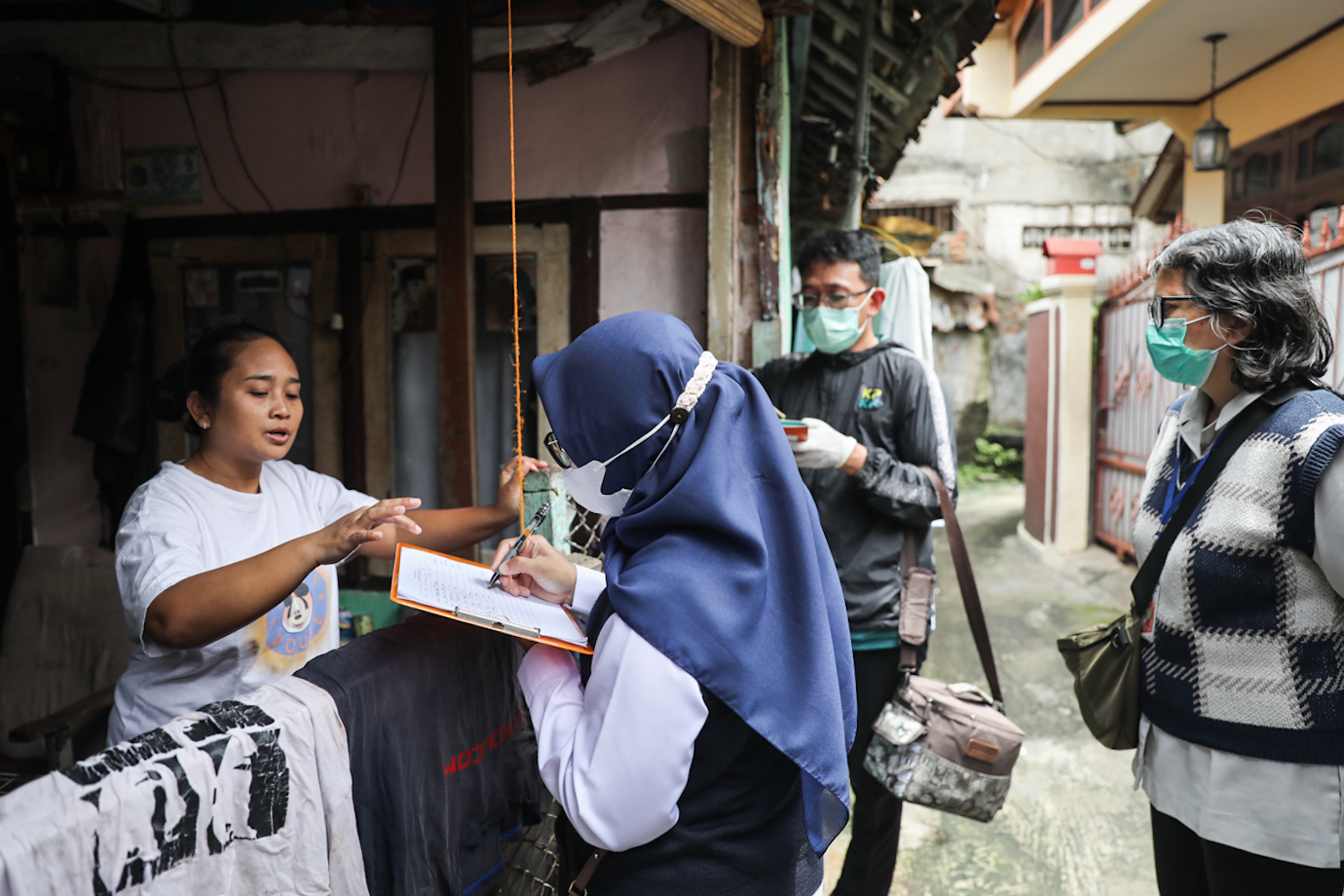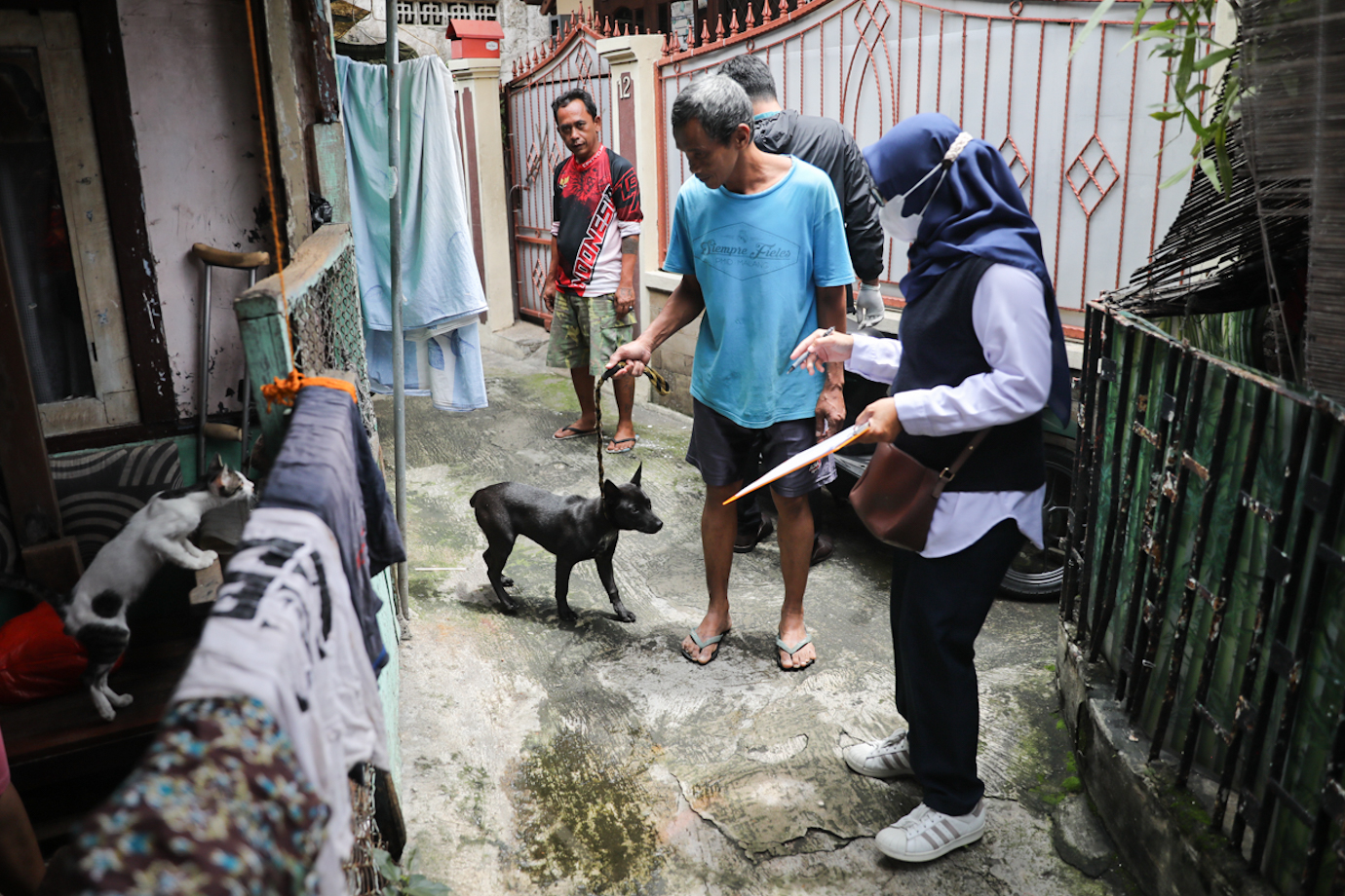 Petugas Suku Dinas Ketahanan Pangan, Kelautan dan Pertanian (Sudin KPKP) Jakarta Selatan melakukan jemput bola pelayanan vaksinasi rabies di RW 01 Setiabudi, Jakarta Selatan, Rabu (22/1). Layanan jemput bola dilakukan ke tempat warga yang memelihara hewan penular rabies (HPR) lebih dari dua ekor setelah pelayanan di posko vaksinasi selesai.