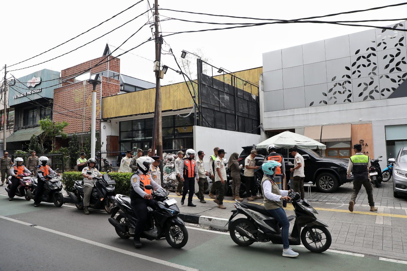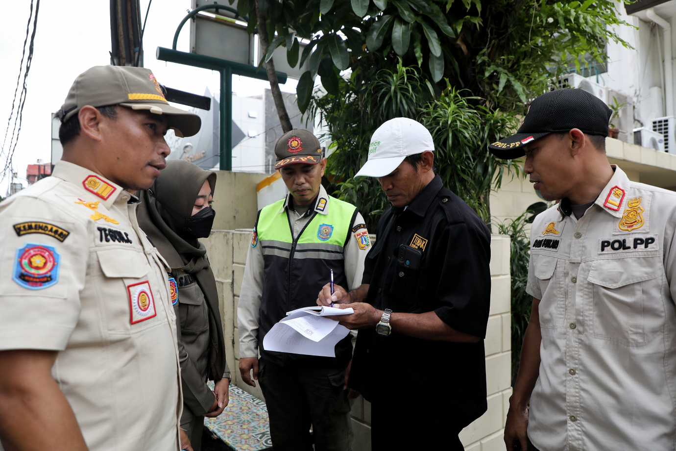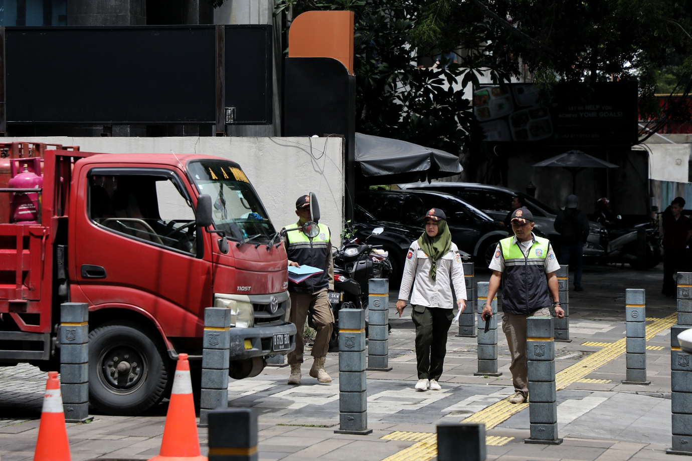 Satuan Polisi Pamong Praja (Satpol PP) Jakarta Selatan memberikan surat imbauan kepada 19 tempat usaha atau restauran yang mempunyai valet di Kawasan Kebayoran Baru, Jakarta Selatan, Rabu (22/1). Surat imbauan tersebut terkait permasalahan parkir liar yang memakan sebagian trotoar khususnya di Jalan Suryo, Jalan Senopati, Jalan Cikajang, Jalan Trunojoyo dan Jalan Wolter Monginsidi.